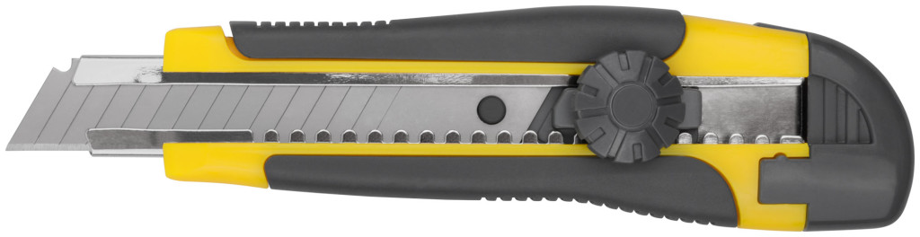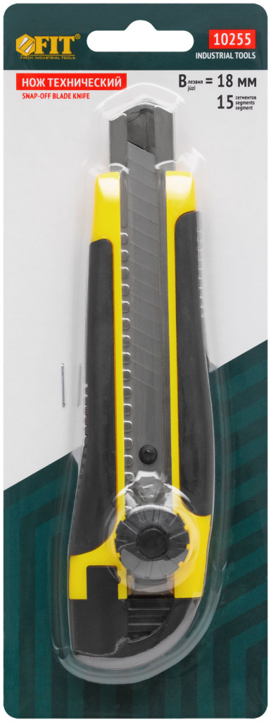 Нож технический FIT применяется для резки бумаги, обоев,скотча, картона средней твердости.Сегментированное лезвие 15 сегментов из инструментальной стали. Пластиковый корпус с прорезиненными вставками обеспечивает крепкий захват и предотвращает выскальзывание при экплуатации.Металлические направляющие обеспечивают защиту лезвия от поломки и допускают увеличенные нагрузки