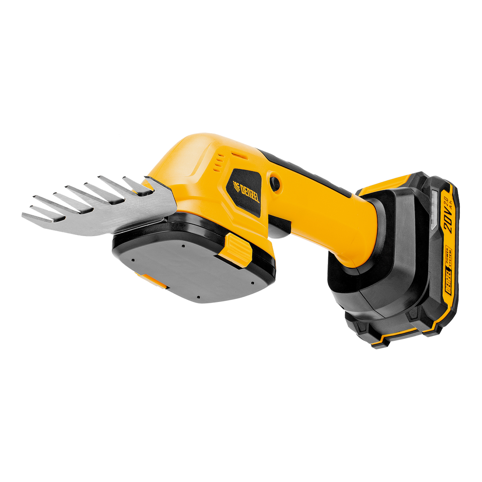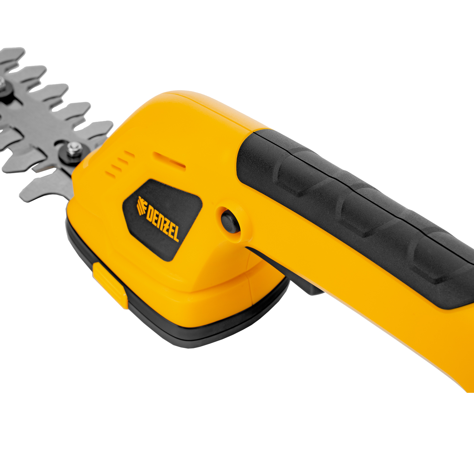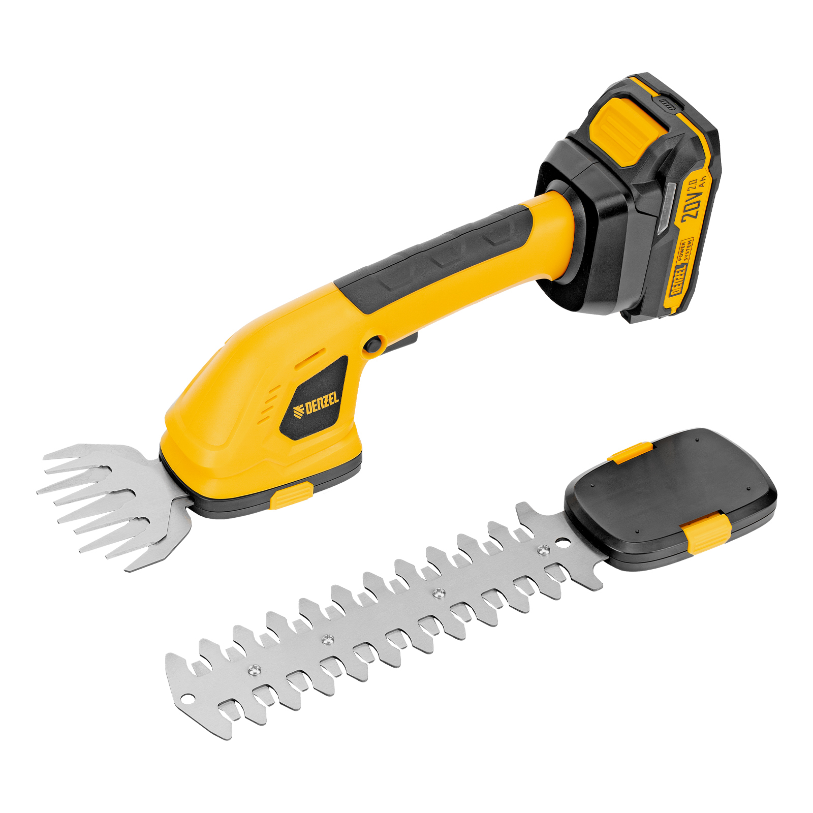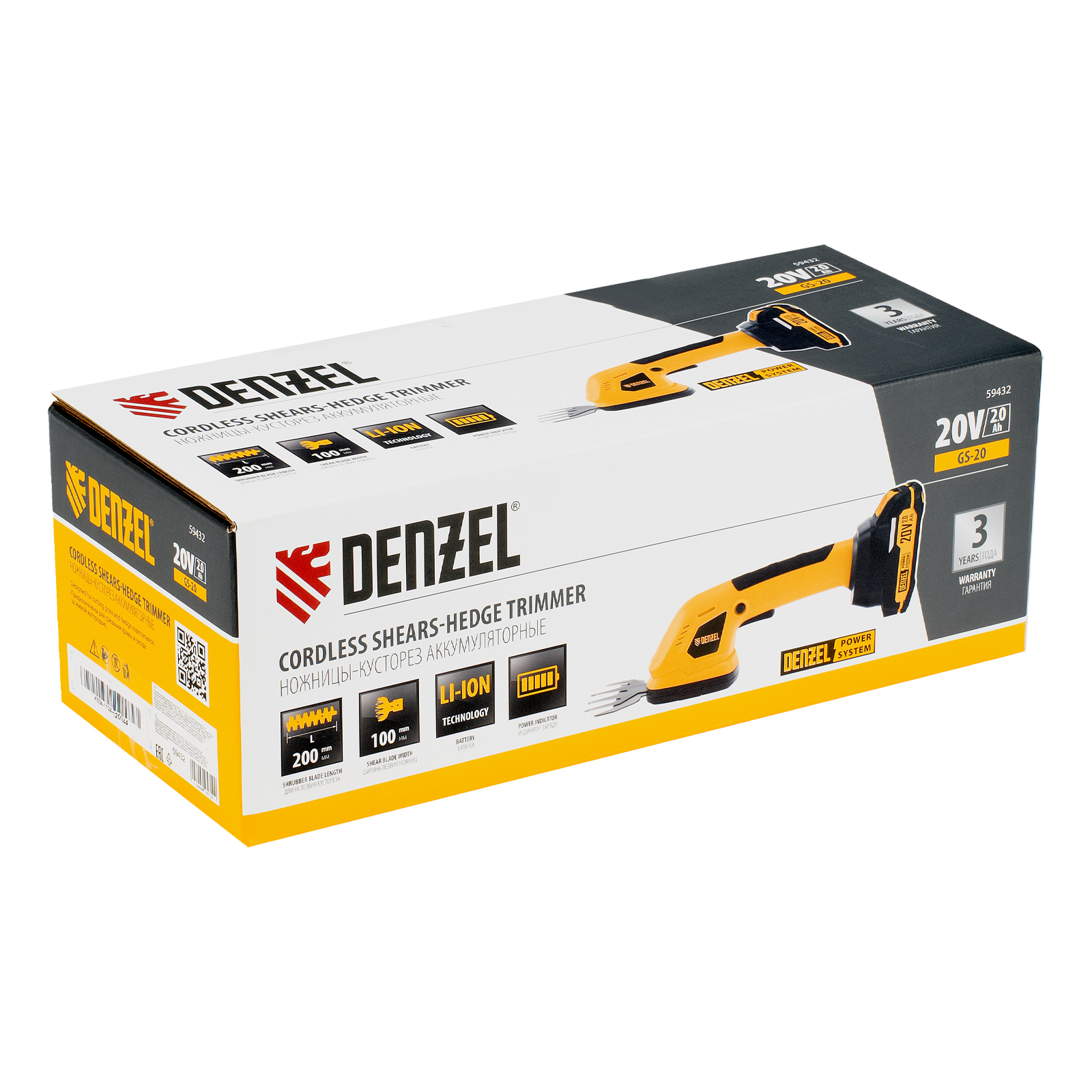 Аккумуляторные ножницы-кусторез Denzel GS-20 59432 работают от аккумулятора Li-Ion 20 В емкостью 2 А·ч. Предусмотрено 2 режима: ножниц для срезания травы и кустореза для обрезки кустарника, ухода за живой изгородью. Максимальная толщина срезаемых веток составляет 8 мм. Ширина среза в режиме ножниц составляет 100 мм, в режиме кустореза — 200 мм, что позволяет быстро и эффективно справиться с работой. Инструмент предназначен для бытового использования.
