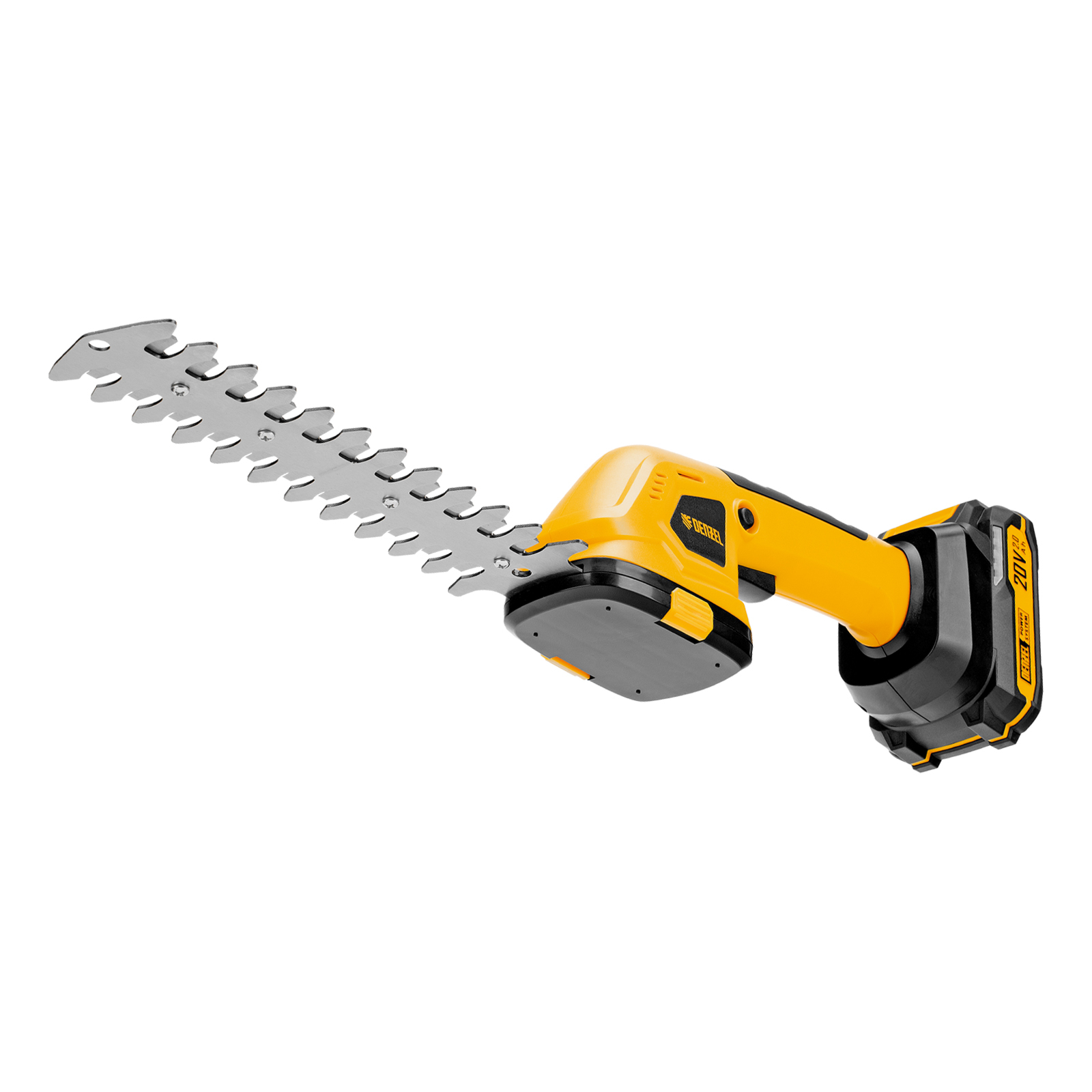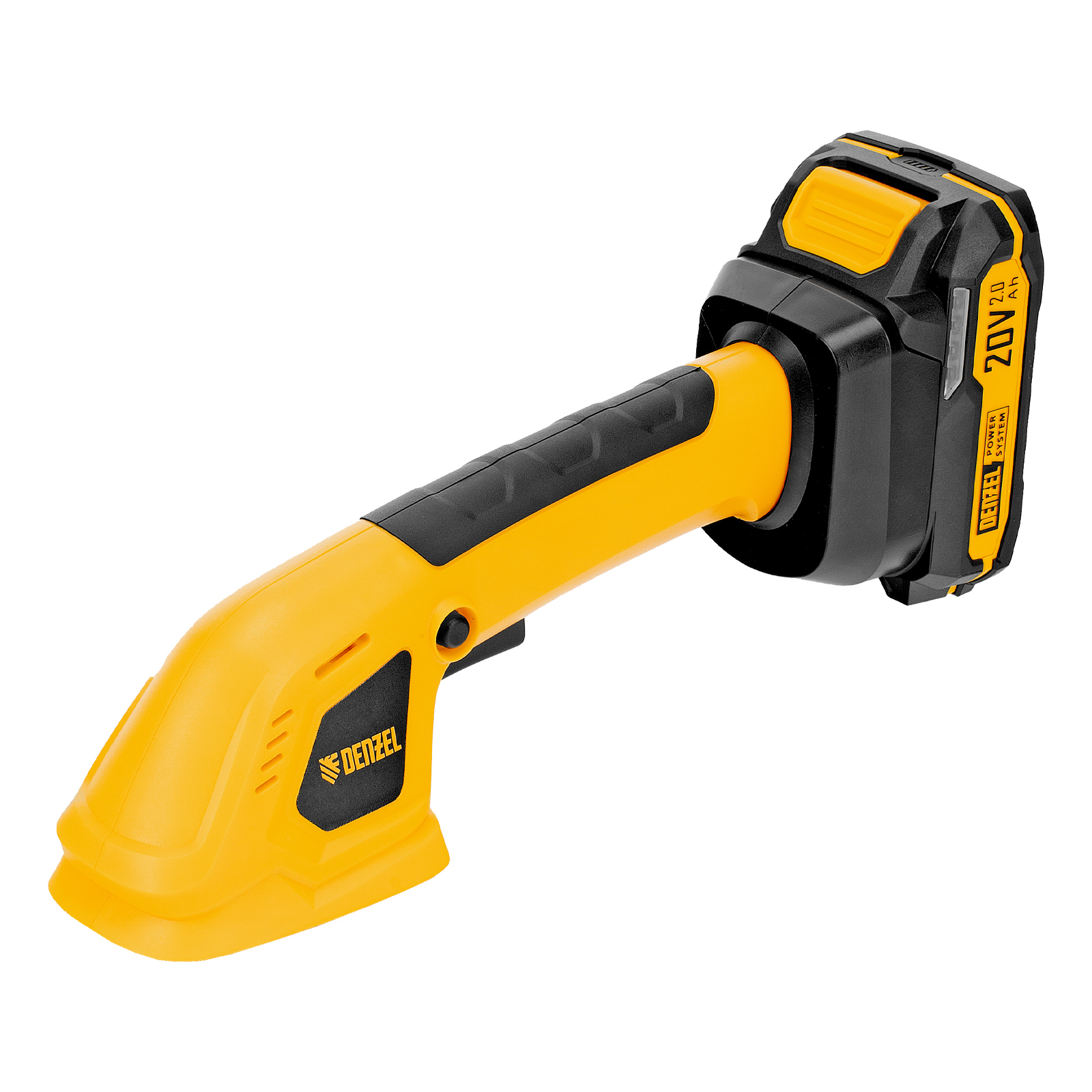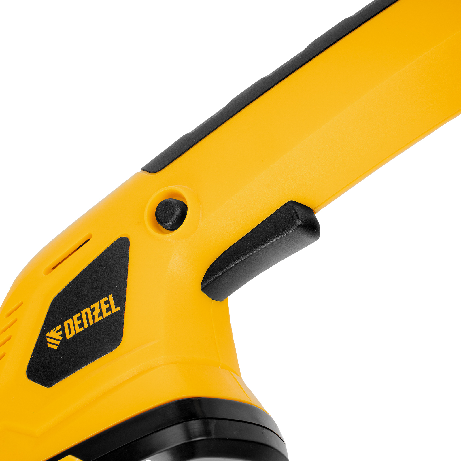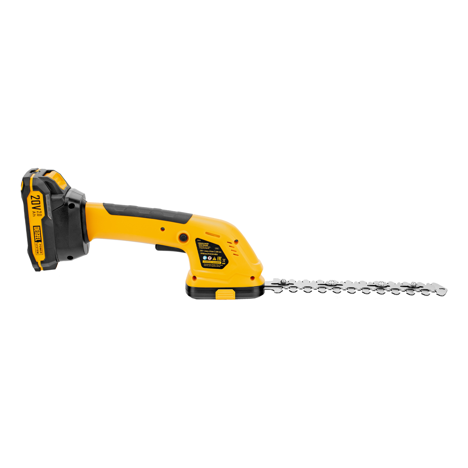 Аккумуляторные ножницы-кусторез Denzel GS-20 59432 работают от аккумулятора Li-Ion 20 В емкостью 2 А·ч. Предусмотрено 2 режима: ножниц для срезания травы и кустореза для обрезки кустарника, ухода за живой изгородью. Максимальная толщина срезаемых веток составляет 8 мм. Ширина среза в режиме ножниц составляет 100 мм, в режиме кустореза — 200 мм, что позволяет быстро и эффективно справиться с работой. Инструмент предназначен для бытового использования.