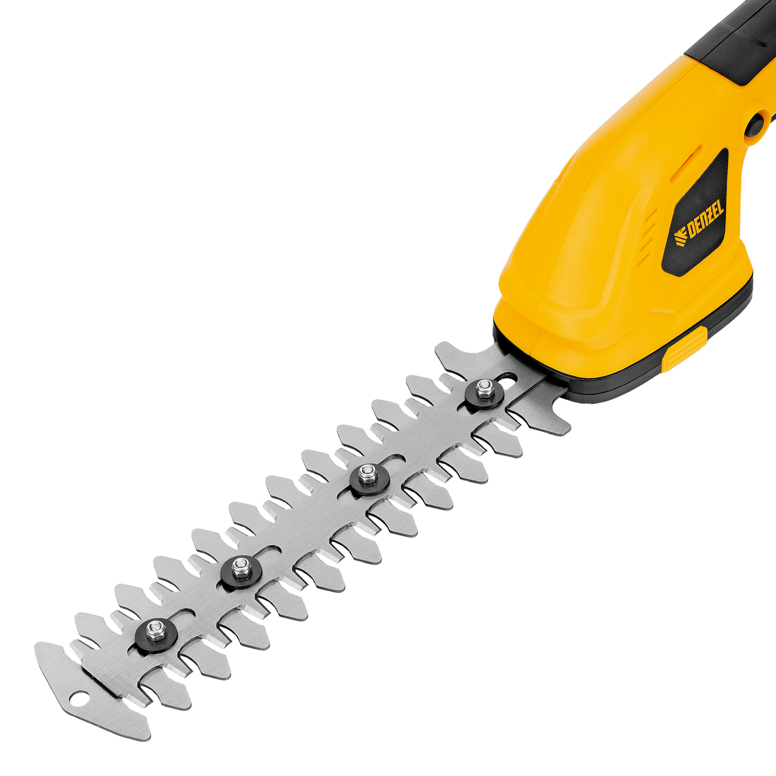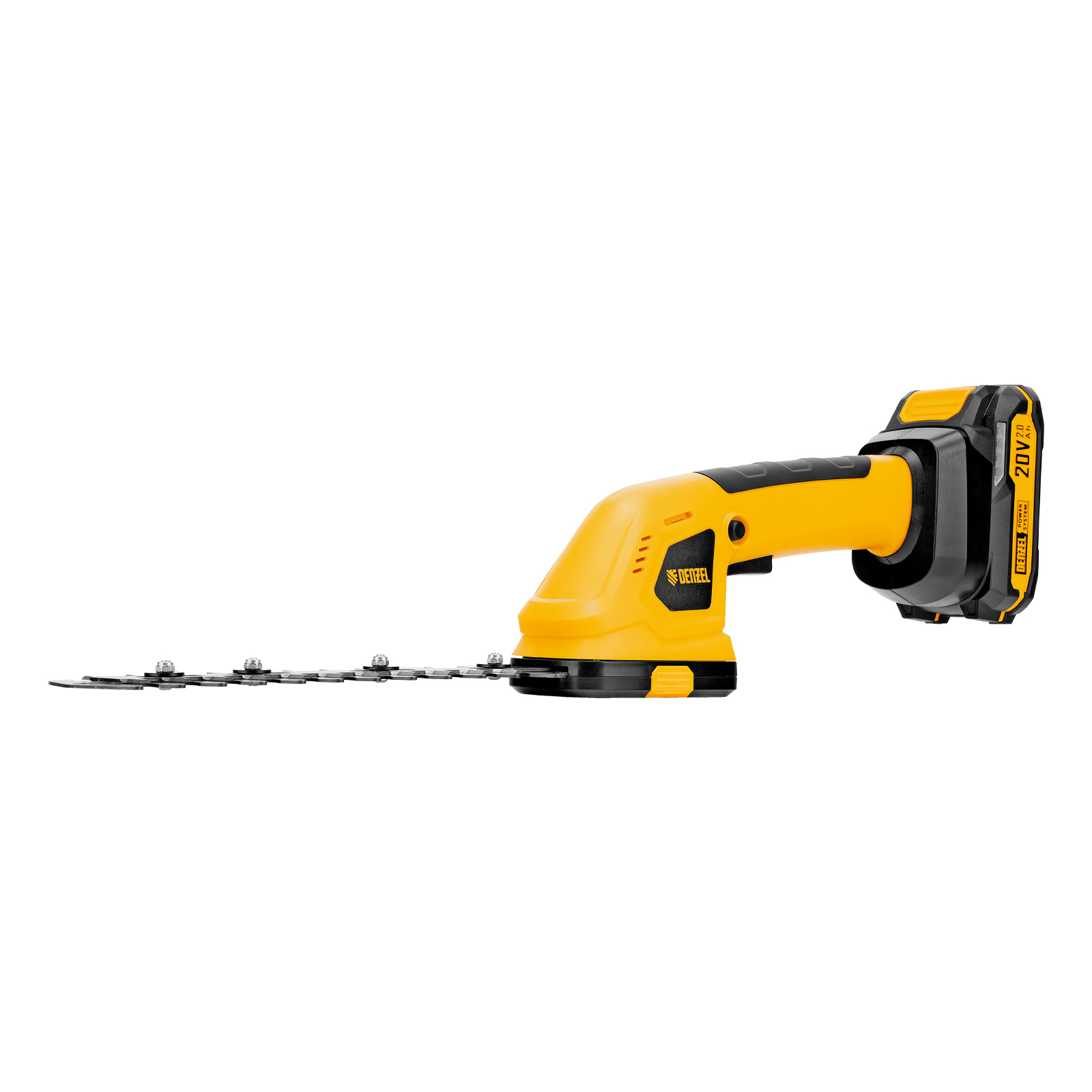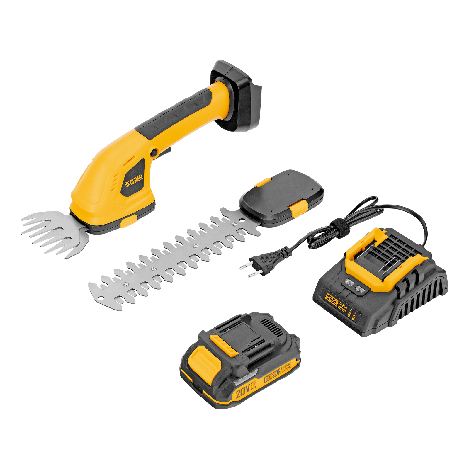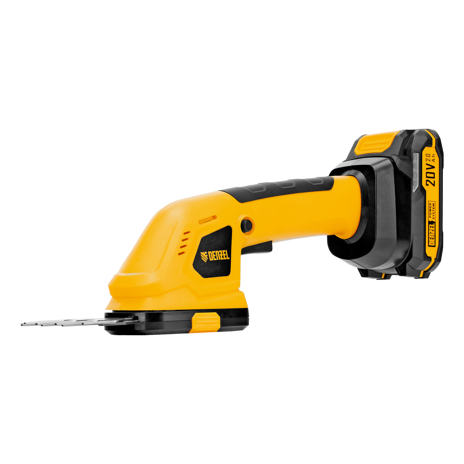 Аккумуляторные ножницы-кусторез Denzel GS-20 59432 работают от аккумулятора Li-Ion 20 В емкостью 2 А·ч. Предусмотрено 2 режима: ножниц для срезания травы и кустореза для обрезки кустарника, ухода за живой изгородью. Максимальная толщина срезаемых веток составляет 8 мм. Ширина среза в режиме ножниц составляет 100 мм, в режиме кустореза — 200 мм, что позволяет быстро и эффективно справиться с работой. Инструмент предназначен для бытового использования.