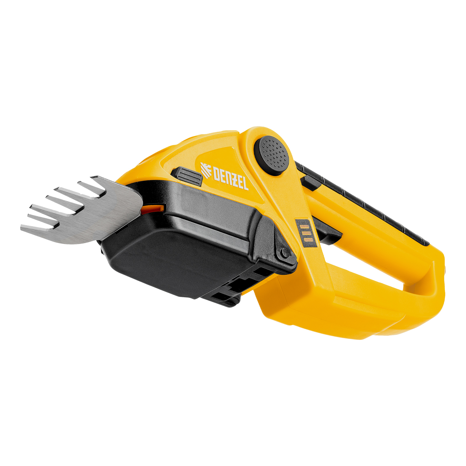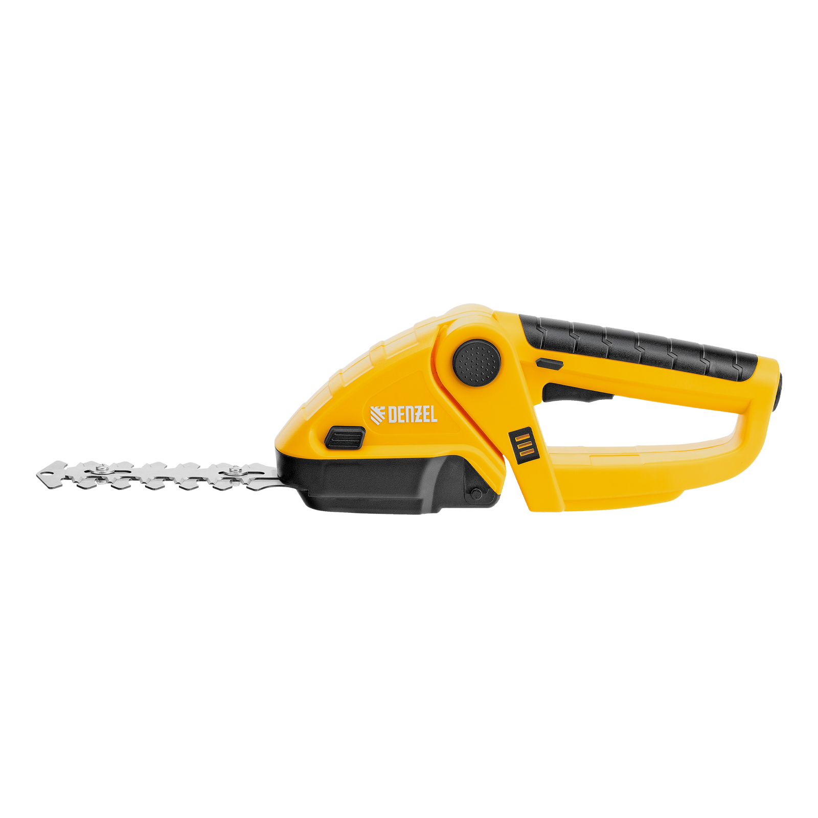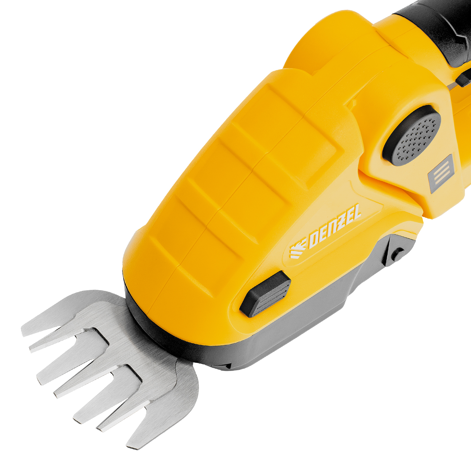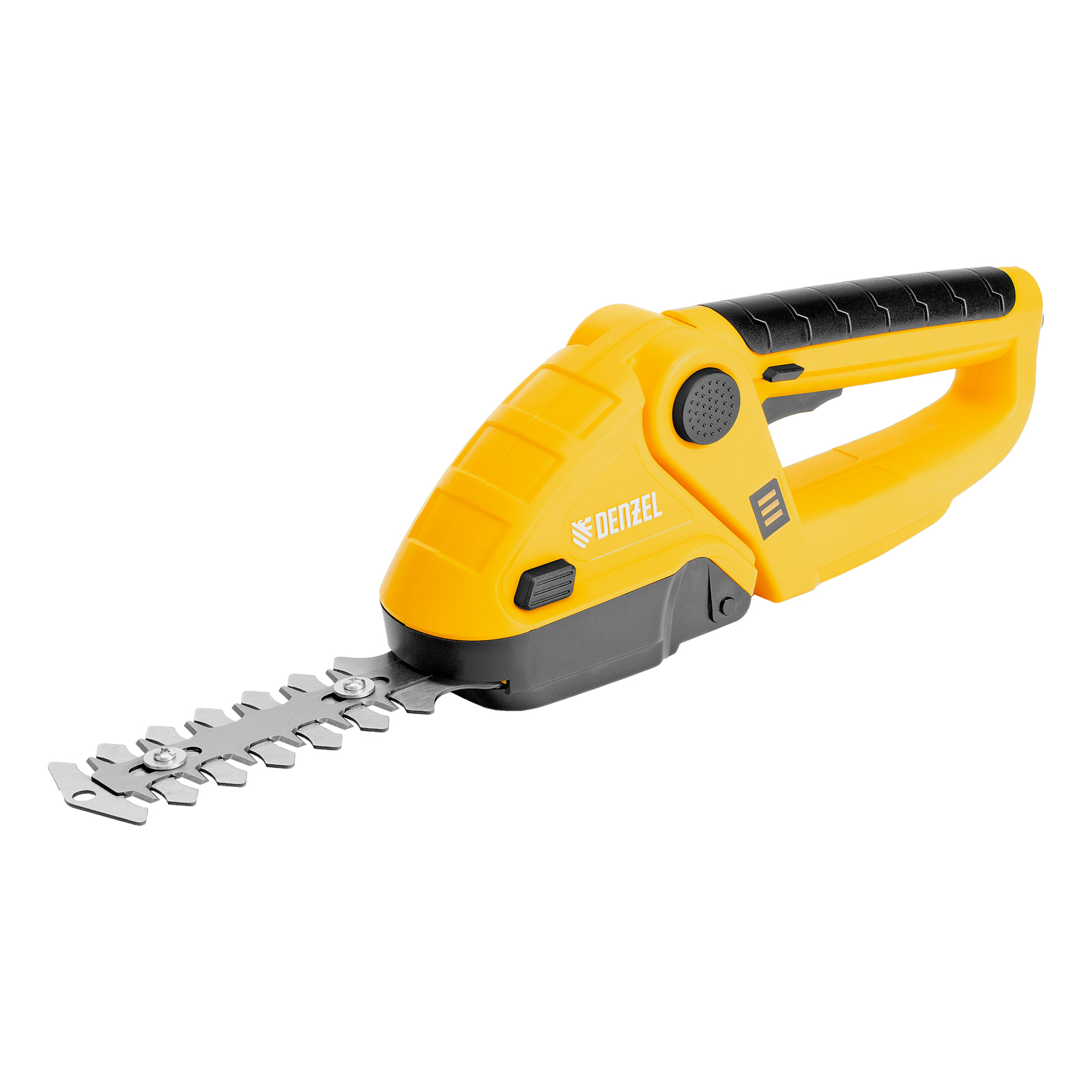 Аккумуляторные ножницы-кусторез Denzel GS-7 59428 предназначены для срезания травы, обрезки кустов и веток диаметром до 8 мм, подходят также для ухода за живой изгородью. Ширина среза в режиме ножниц составляет 80 мм, в режиме кустореза — 120 мм, что позволяет эффективно решать поставленные задачи. Инструмент работает от аккумулятора Li-Ion номинальным напряжением 7,2 В и емкостью 1,5 А·ч, не требует подключения к стационарному источнику питания и может использоваться на любом расстоянии от дома. Пригодится владельцам дачных участков.