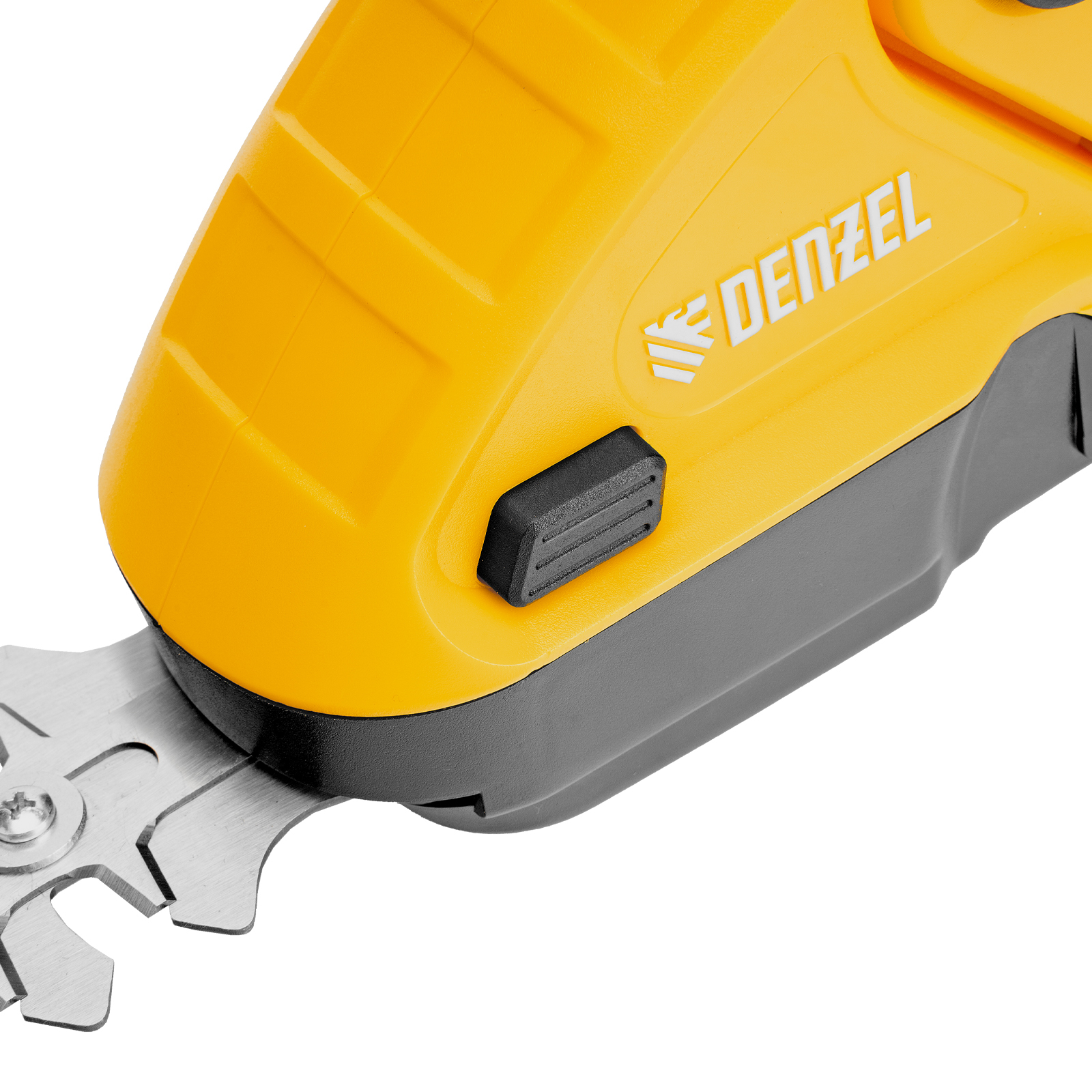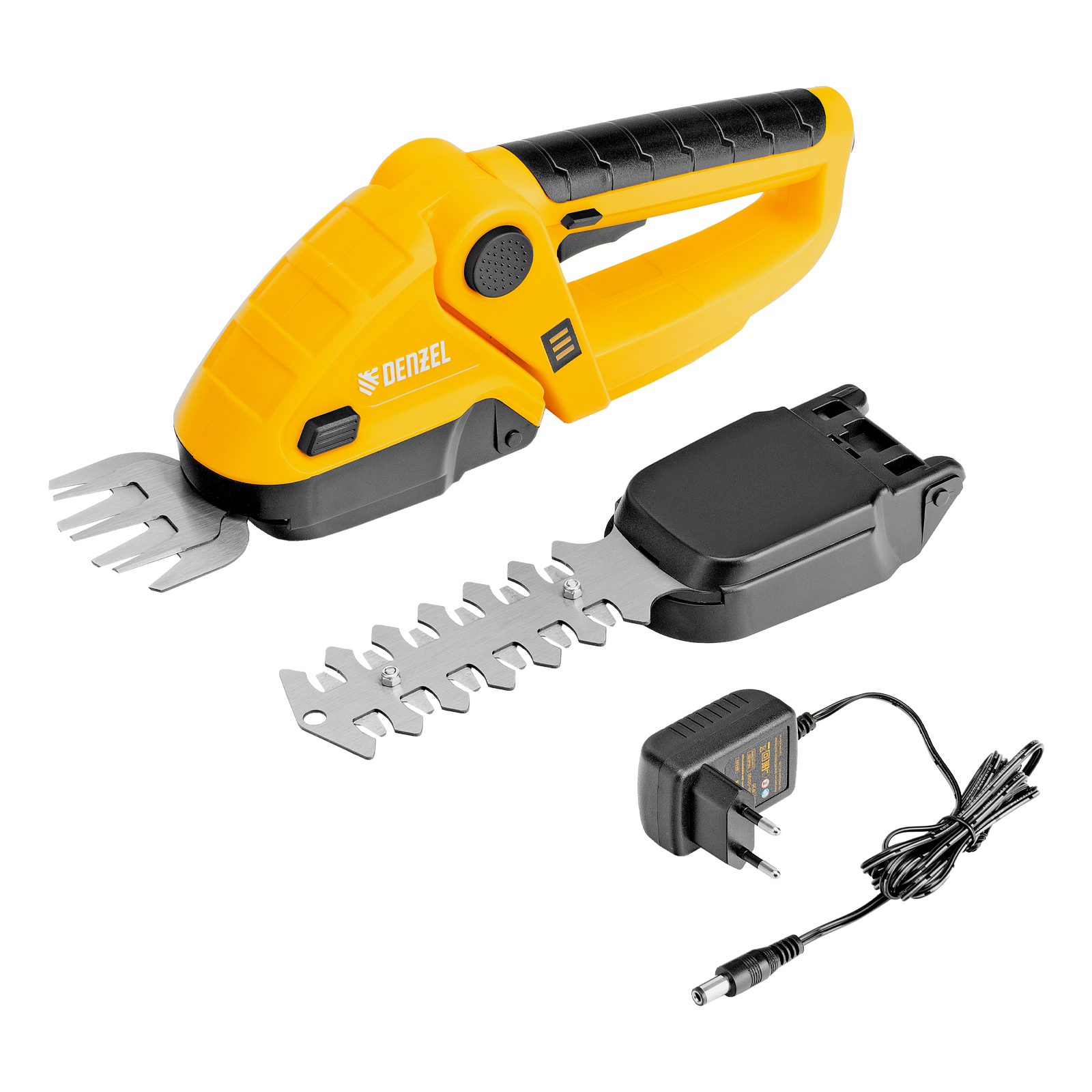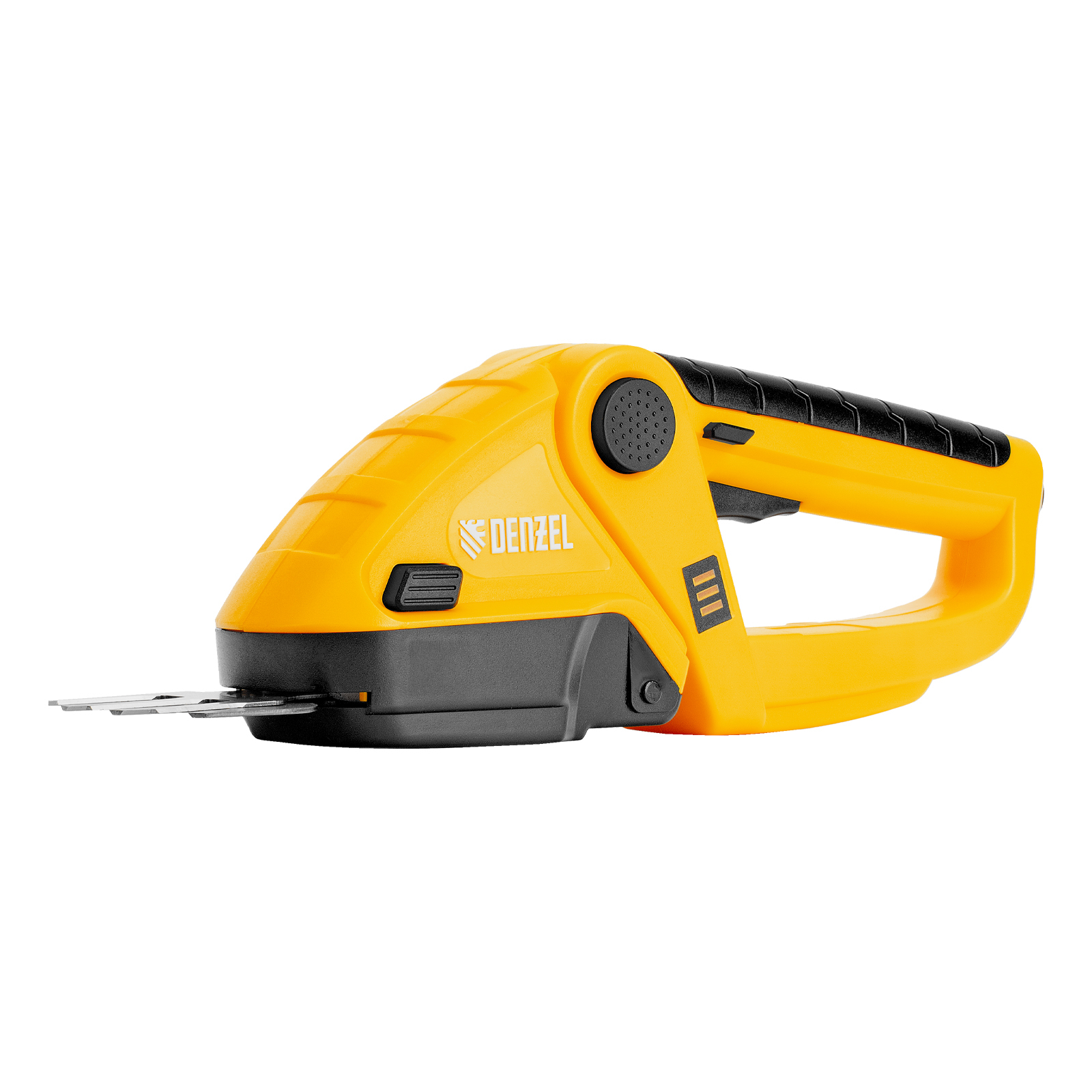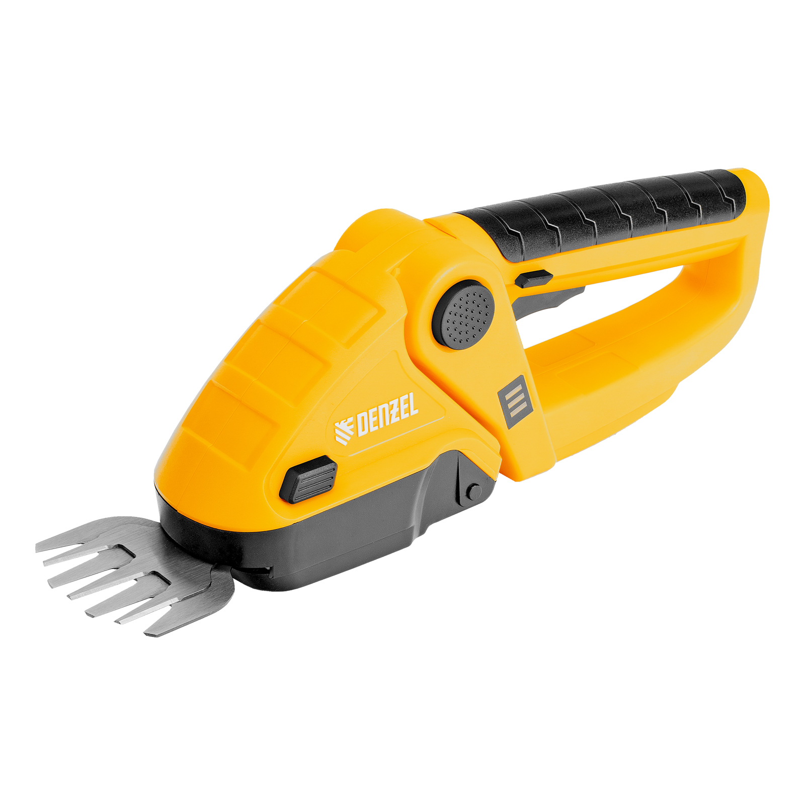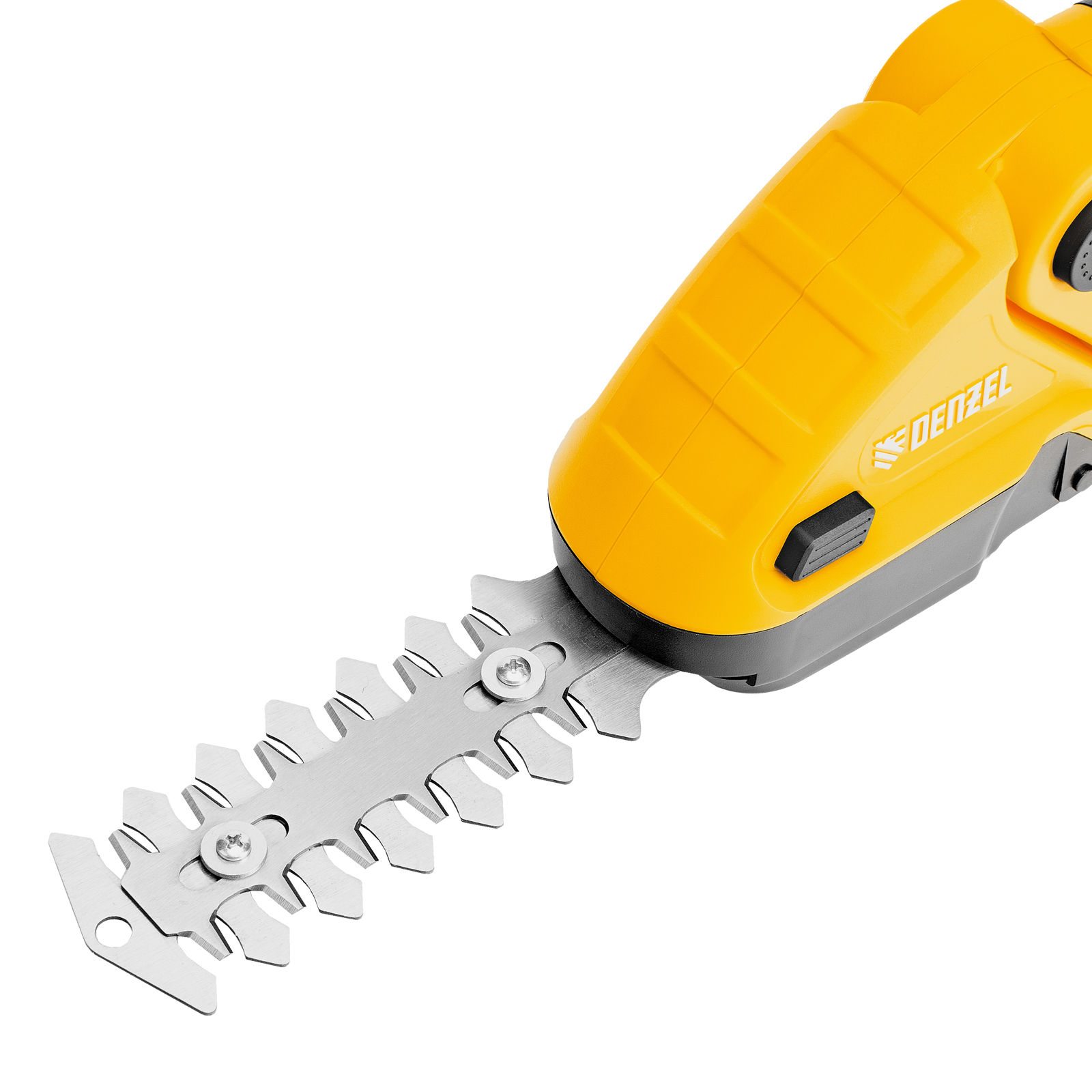Аккумуляторные ножницы-кусторез Denzel GS-7 59428 предназначены для срезания травы, обрезки кустов и веток диаметром до 8 мм, подходят также для ухода за живой изгородью. Ширина среза в режиме ножниц составляет 80 мм, в режиме кустореза — 120 мм, что позволяет эффективно решать поставленные задачи. Инструмент работает от аккумулятора Li-Ion номинальным напряжением 7,2 В и емкостью 1,5 А·ч, не требует подключения к стационарному источнику питания и может использоваться на любом расстоянии от дома. Пригодится владельцам дачных участков.