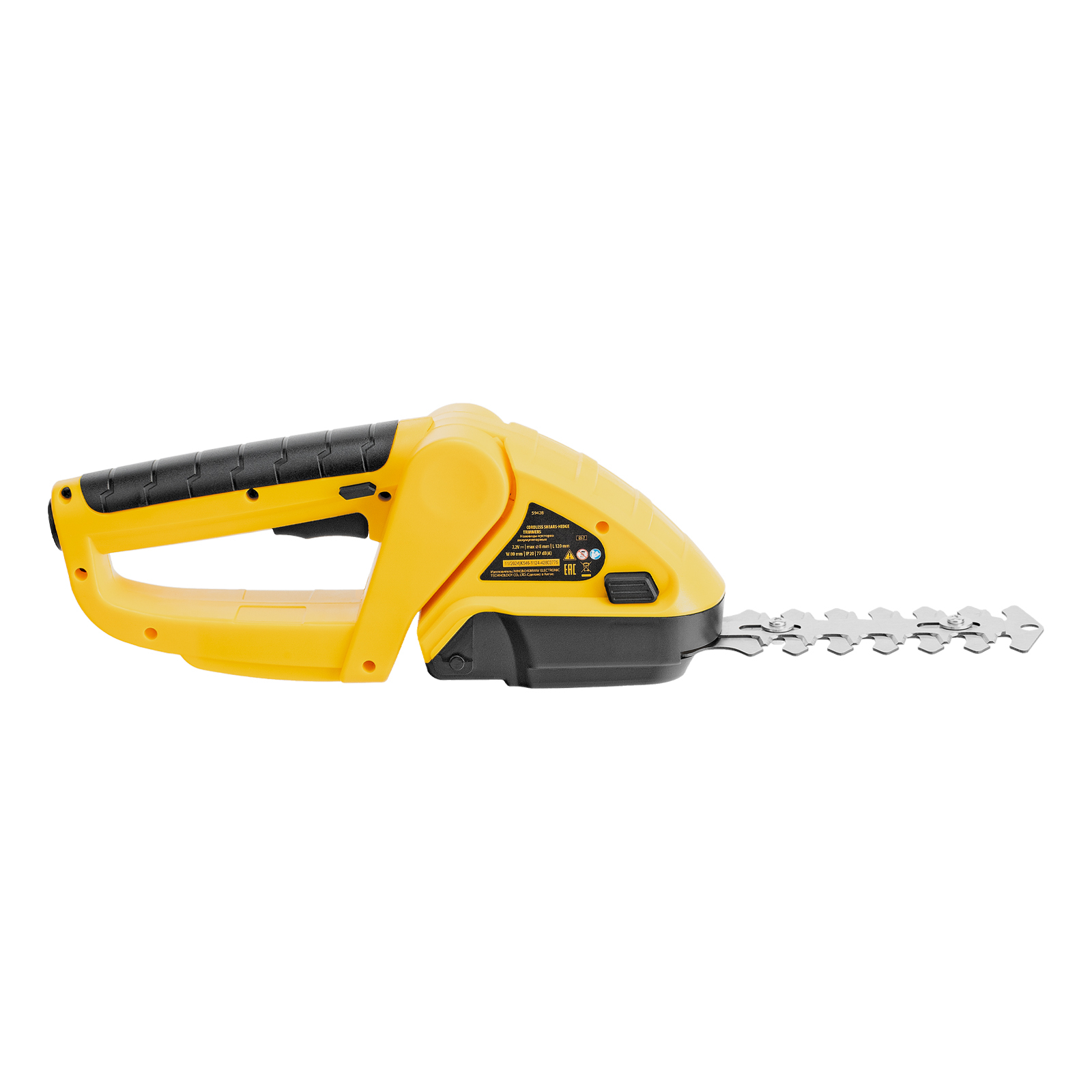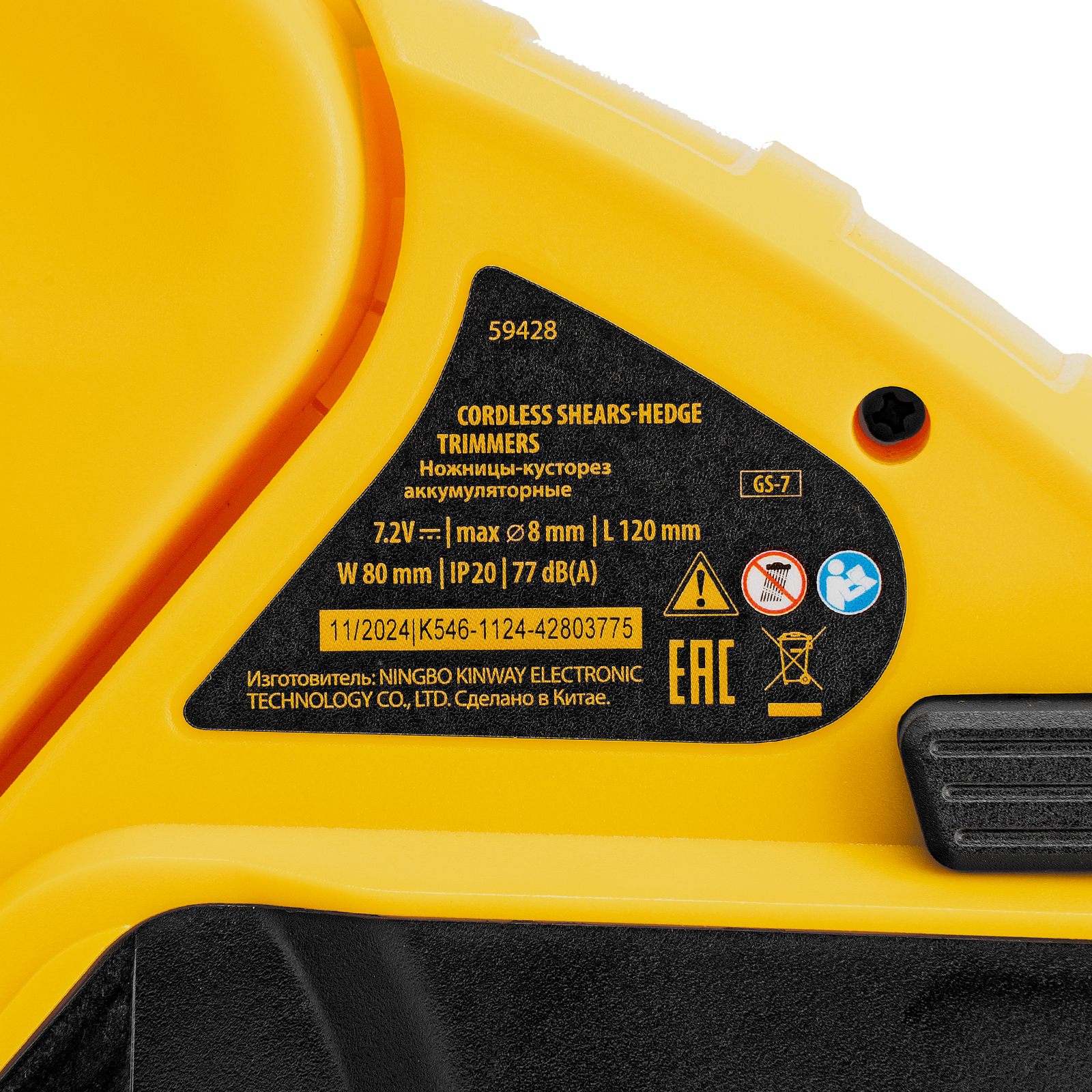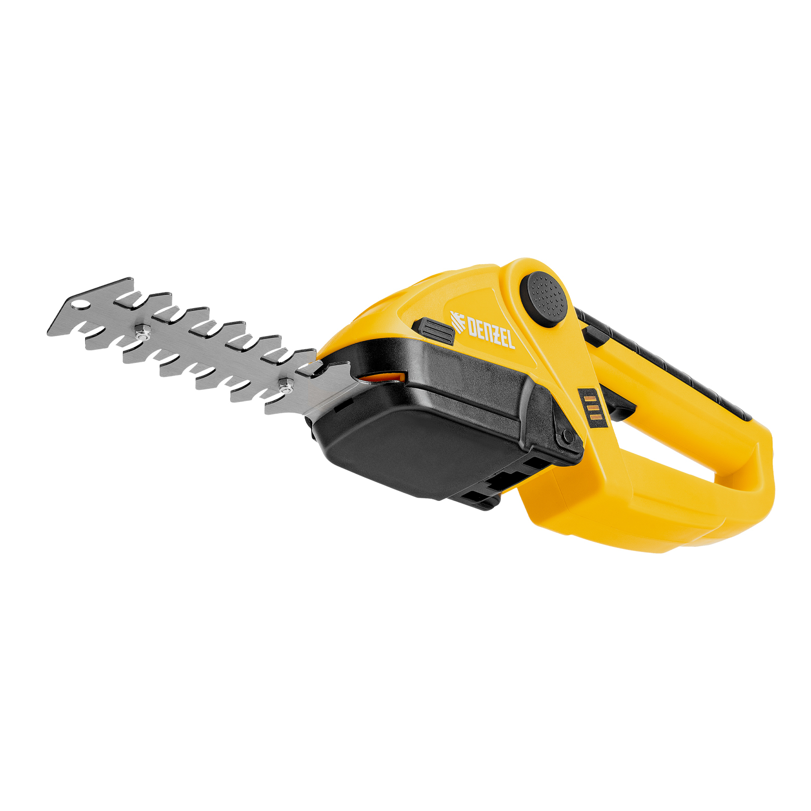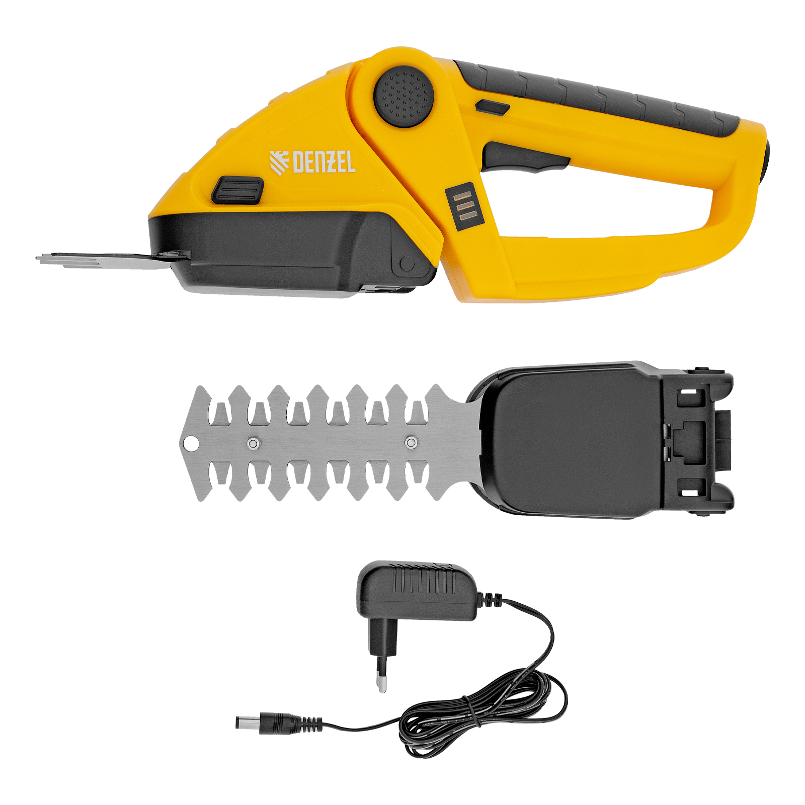 Аккумуляторные ножницы-кусторез Denzel GS-7 59428 предназначены для срезания травы, обрезки кустов и веток диаметром до 8 мм, подходят также для ухода за живой изгородью. Ширина среза в режиме ножниц составляет 80 мм, в режиме кустореза — 120 мм, что позволяет эффективно решать поставленные задачи. Инструмент работает от аккумулятора Li-Ion номинальным напряжением 7,2 В и емкостью 1,5 А·ч, не требует подключения к стационарному источнику питания и может использоваться на любом расстоянии от дома. Пригодится владельцам дачных участков.