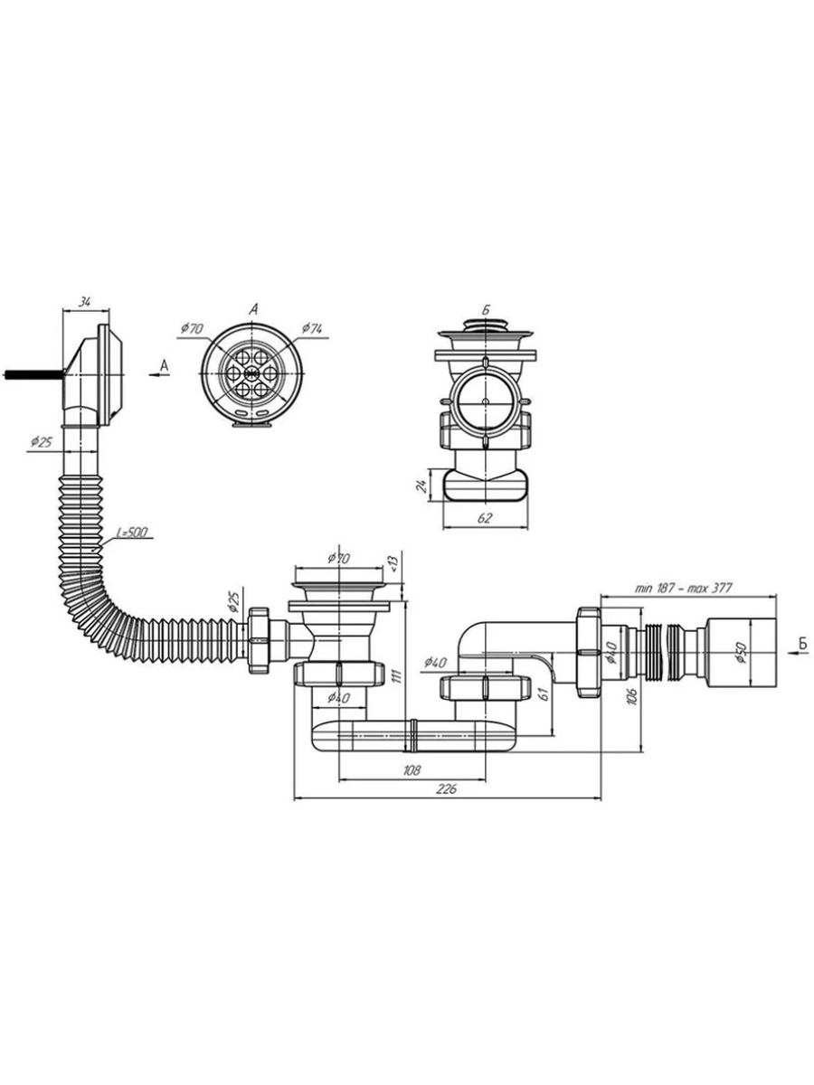Обвязка для ванны АНИ пласт Варяг C6055 применяется для организация слива воды в систему канализации в ванне. Сифон плоский с выходом 40 мм, подключение к канализации с помощью гофрированной трубы с выходом на 50 мм, длина варьируется от 220 до 410 мм. Пробка горловины слива ванны и отверстия перелива изготовлены из полипропилена, диаметр 70 и 74 мм, максимальная длина гофрированной трубы перелива 500 мм.