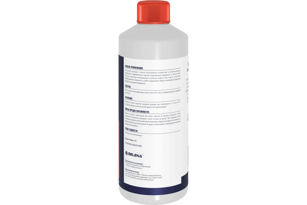 Служит для удаления царапин, неглубоких трещин, следов трения с поверхностей из непрозрачного жесткого ПВХ, полистирола. Сильно растворяет поверхности из ПВХ. Состав: смесь сложных эфиров монокарбоновых кислот, растворов алифатических спиртов и гетероциклических соединений; Плотность: 0,89 г/см³; Минимальная рабочая температура: +3 °C; Объем: 950 мл; Цвет: прозрачный. Прозрачный