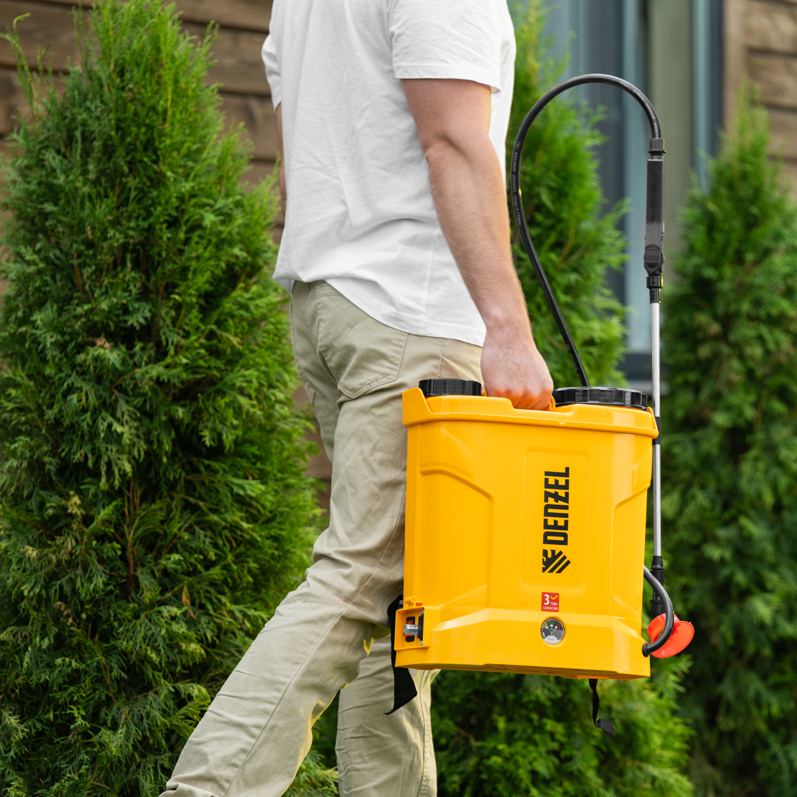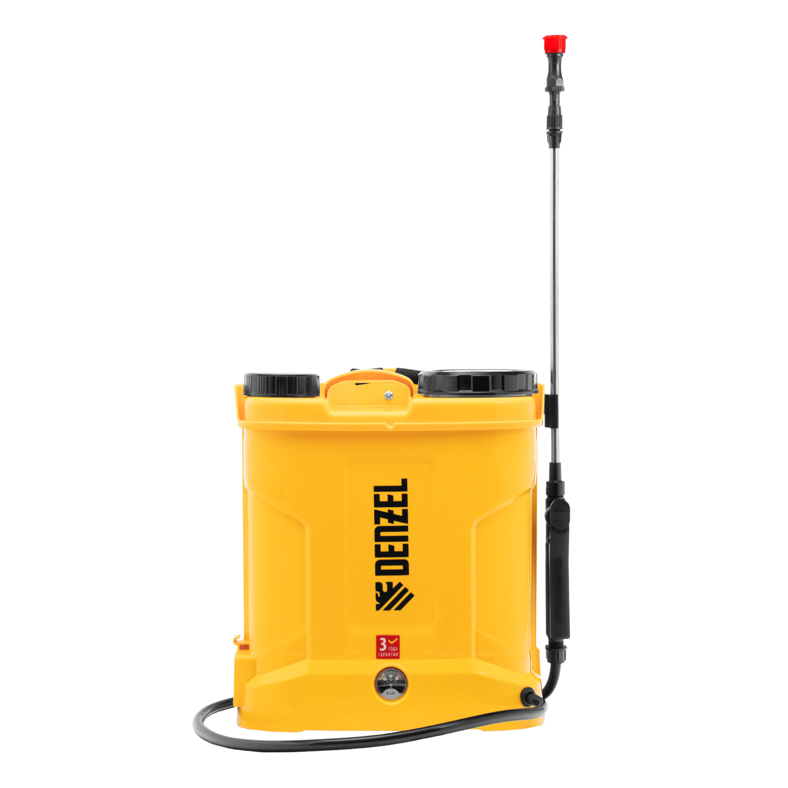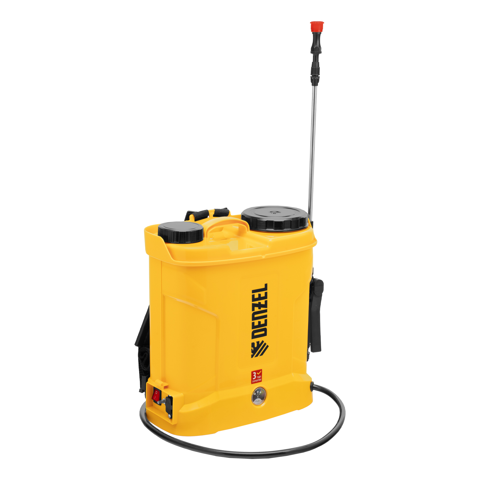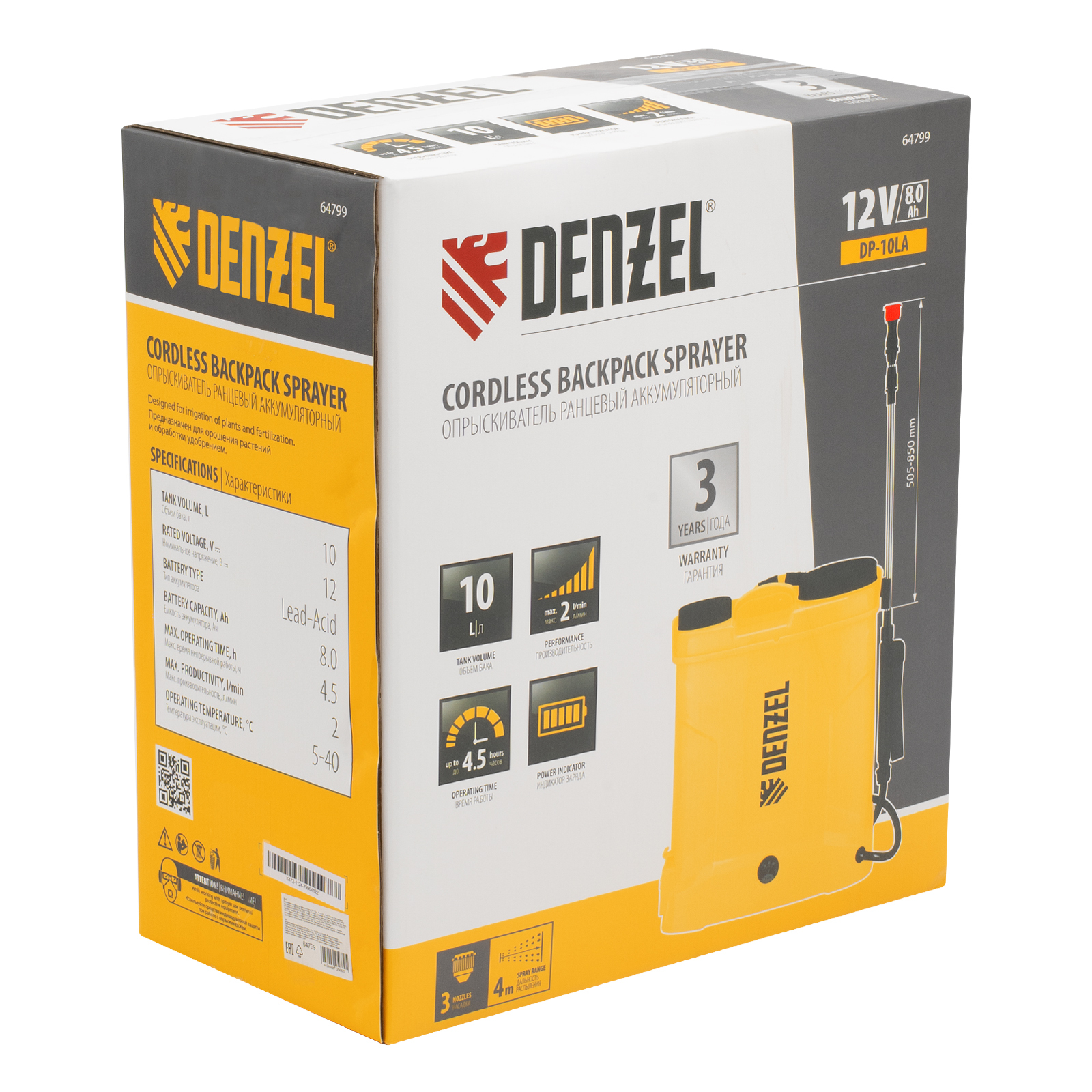 Ранцевый аккумуляторный опрыскиватель Denzel DP-10LA 64799 с баком объемом 10 л и свинцово-кислотным аккумулятором на 12 В, емкостью 8 А·ч, предназначен для распыления воды или инсектицидов. Используется для ухода за растениями, борьбы с насекомыми, дезинфекции помещения, мытья окон и фасадов. Длина штанги регулируется в диапазоне 540-870 мм, а максимальная дальность распыления составляет 4 м, что облегчает обработку труднодоступных мест.