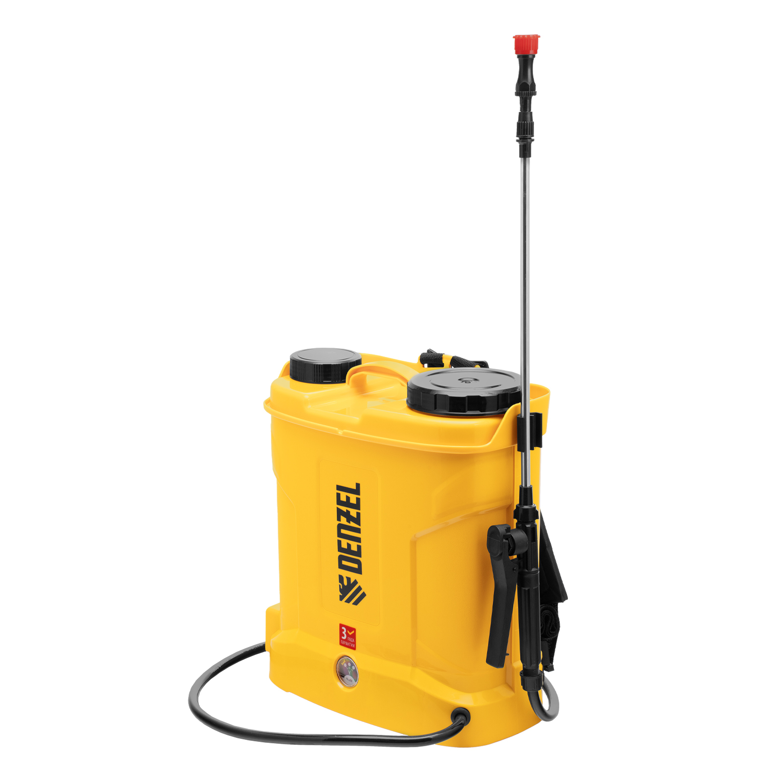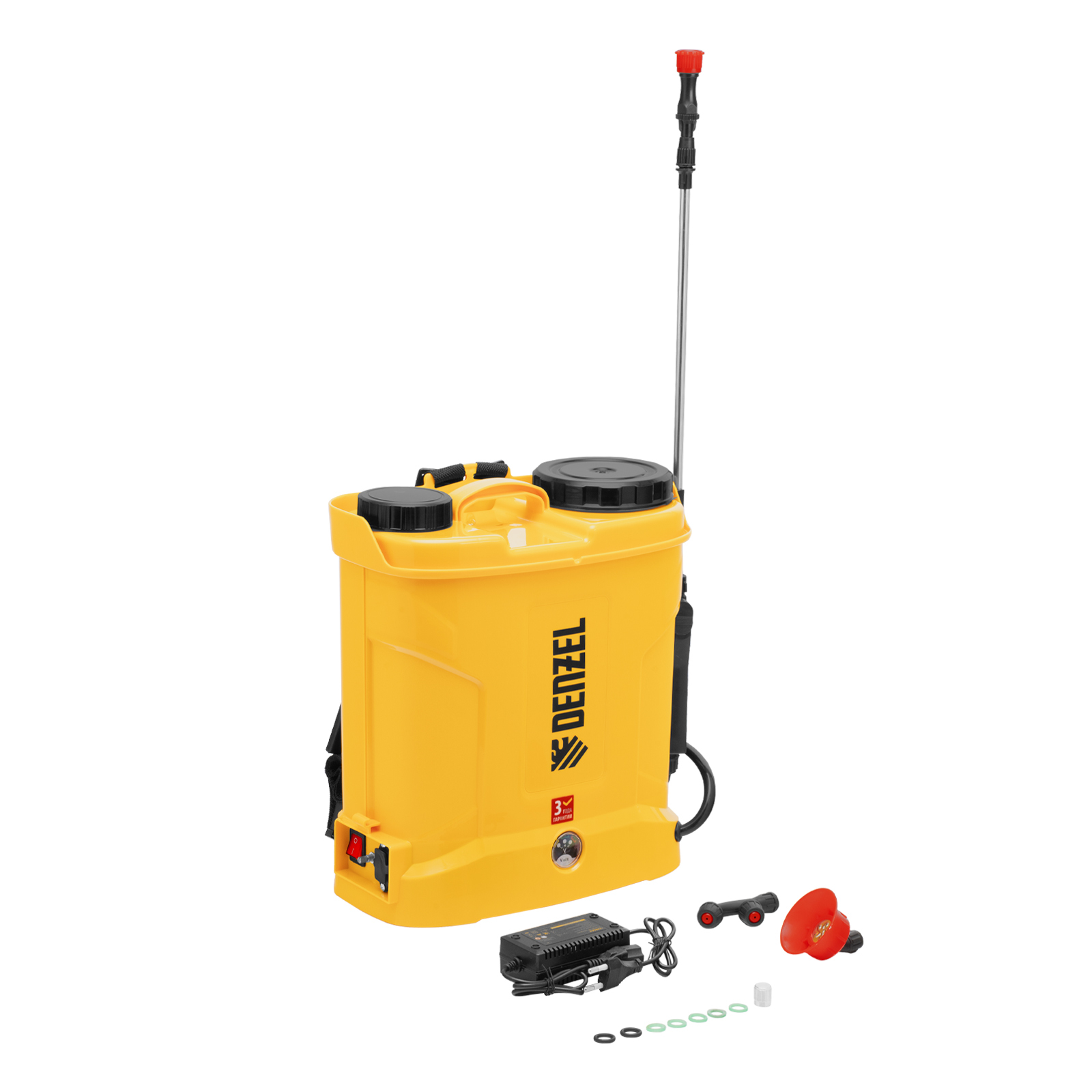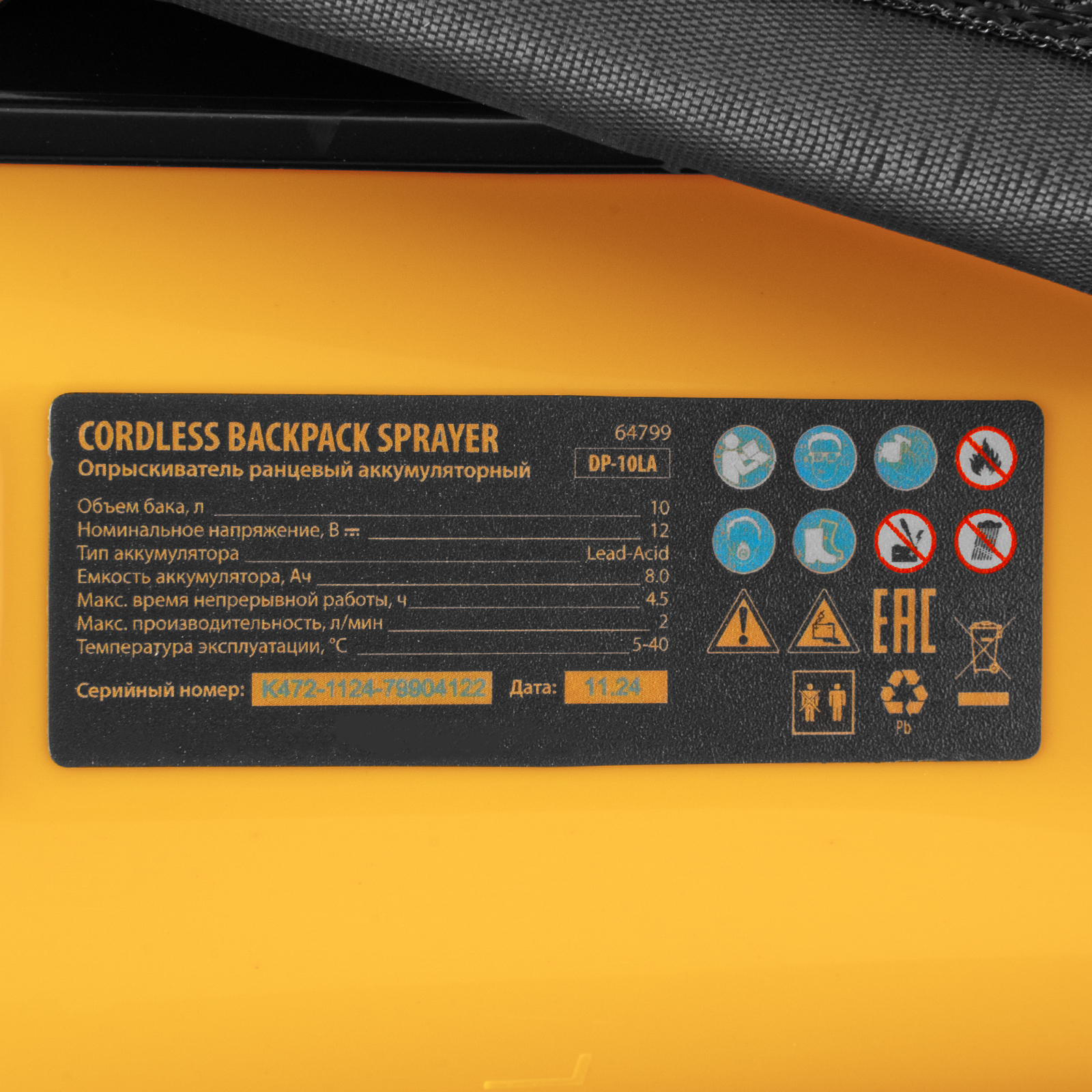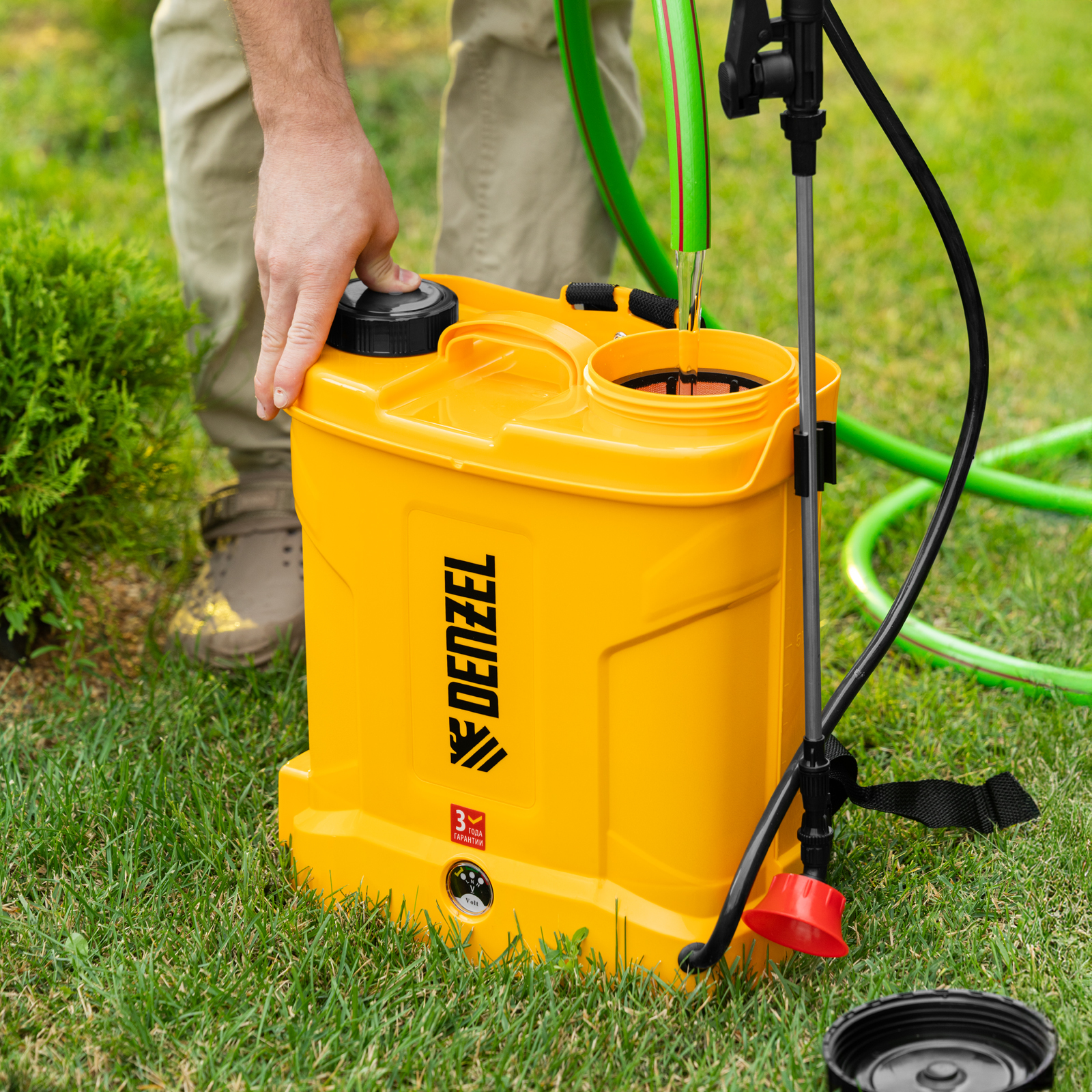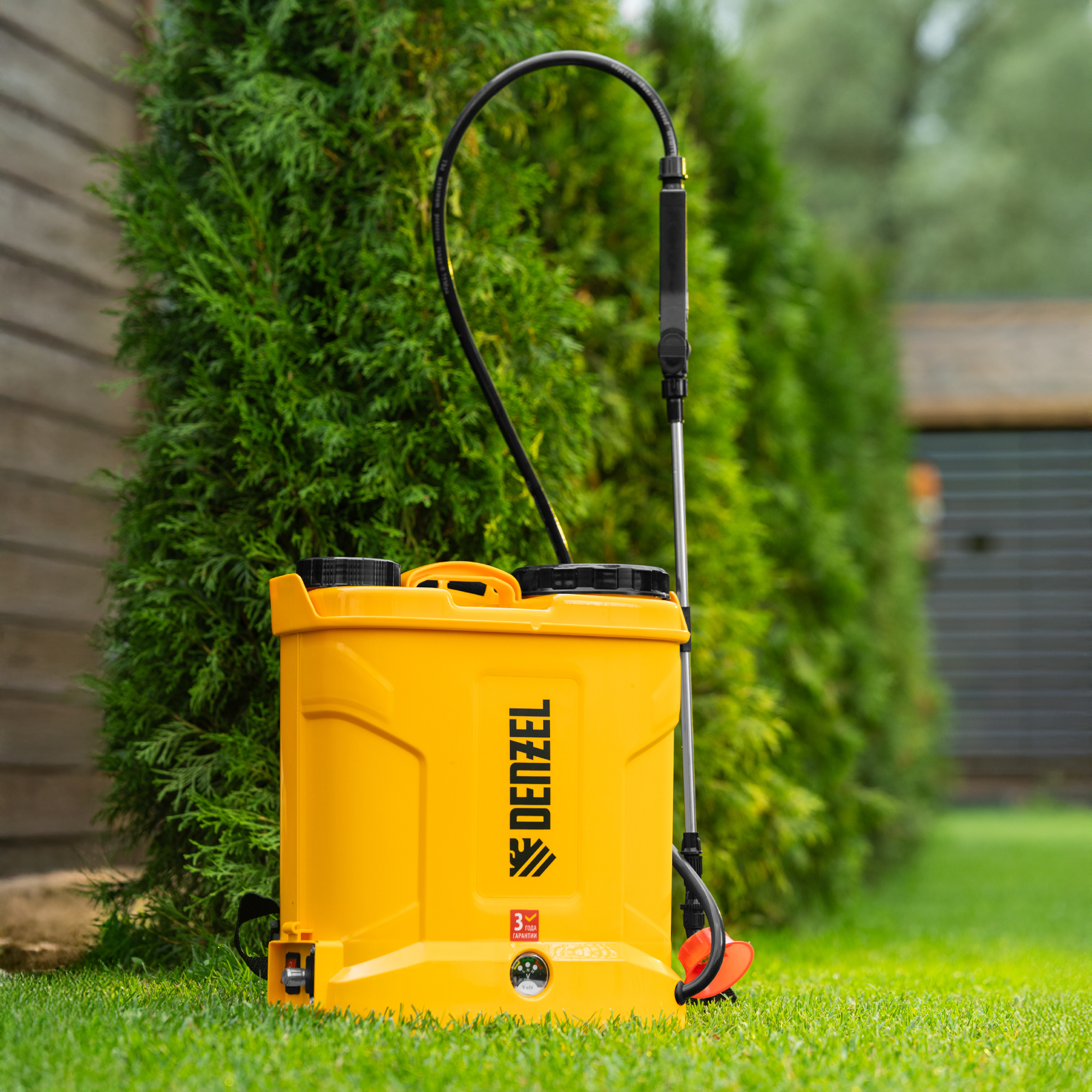 Ранцевый аккумуляторный опрыскиватель Denzel DP-10LA 64799 с баком объемом 10 л и свинцово-кислотным аккумулятором на 12 В, емкостью 8 А·ч, предназначен для распыления воды или инсектицидов. Используется для ухода за растениями, борьбы с насекомыми, дезинфекции помещения, мытья окон и фасадов. Длина штанги регулируется в диапазоне 540-870 мм, а максимальная дальность распыления составляет 4 м, что облегчает обработку труднодоступных мест.
