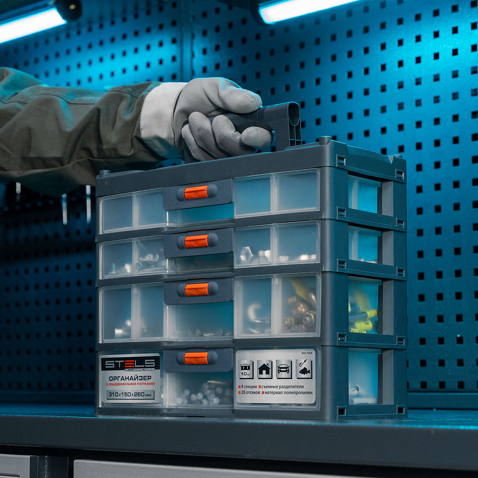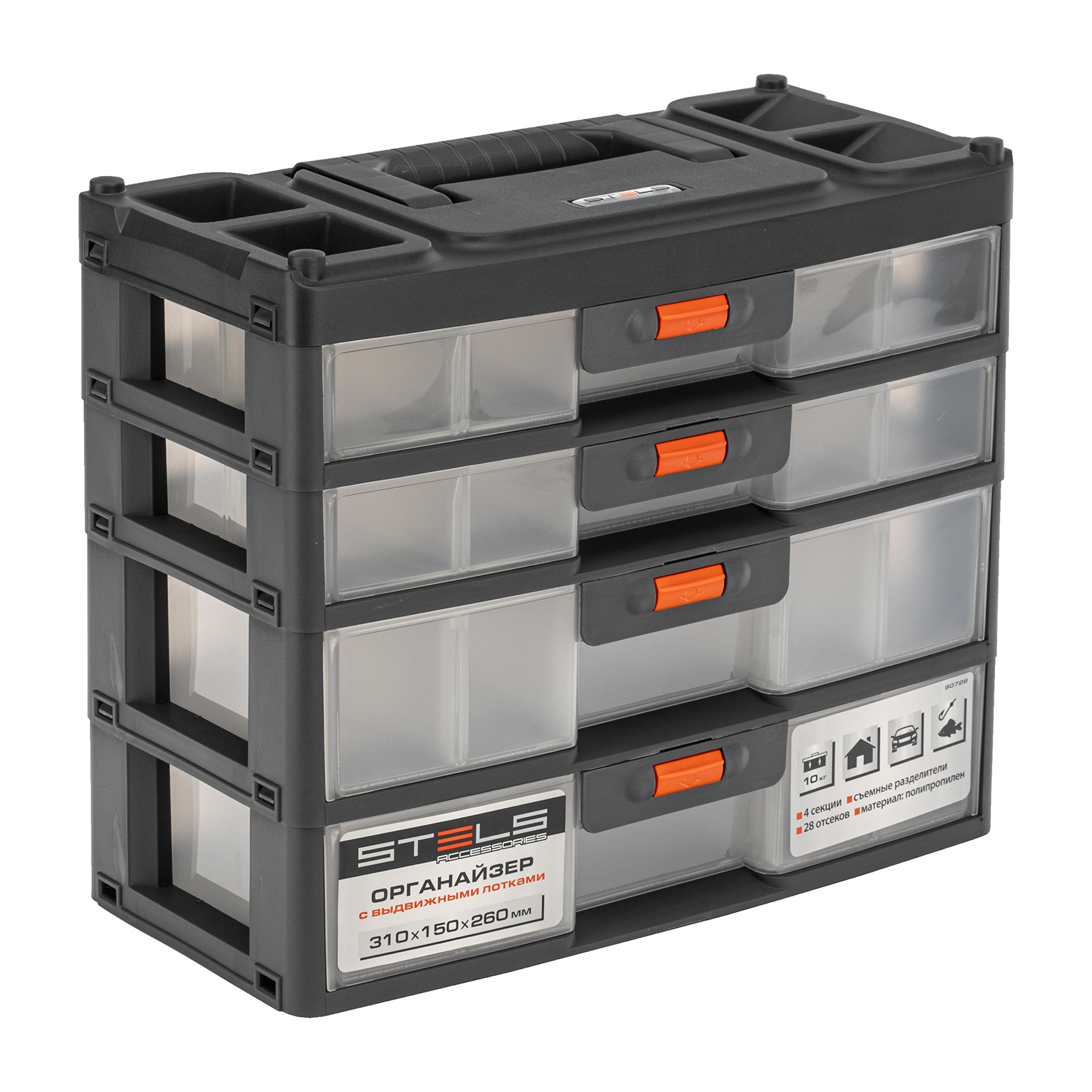 Органайзер Stels 90728 размером 310 х 150 х 260 мм, из пластика, имеет 4 секции с выдвижными лотками и используется для хранения крепежных элементов, принадлежностей для рукоделия, снастей и т.д. Обеспечивает быстрый доступ к предметам, позволяет избежать их перемешивания и утери. Пригодится в гараже, мастерской, будет полезен в домашнем хозяйстве.