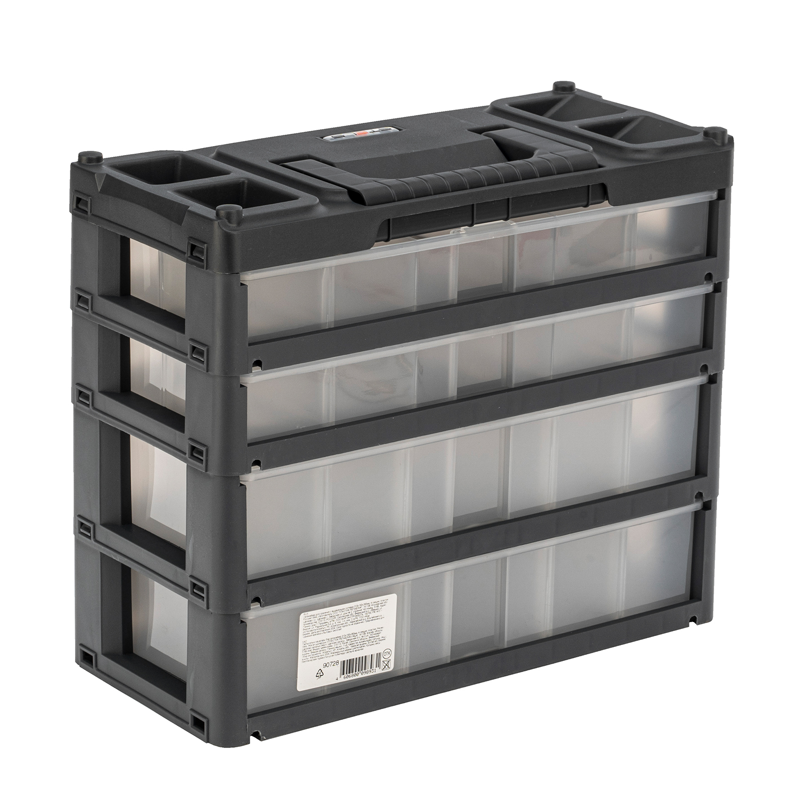 - Вместительность — в четырехъярусном органайзере помещается большое количество различных деталей.
