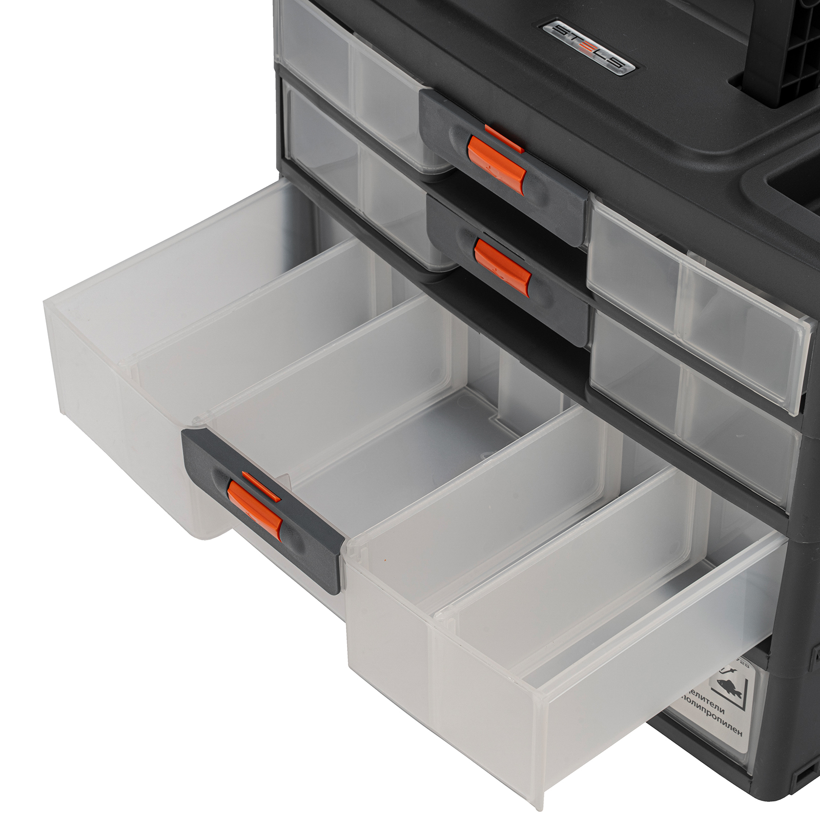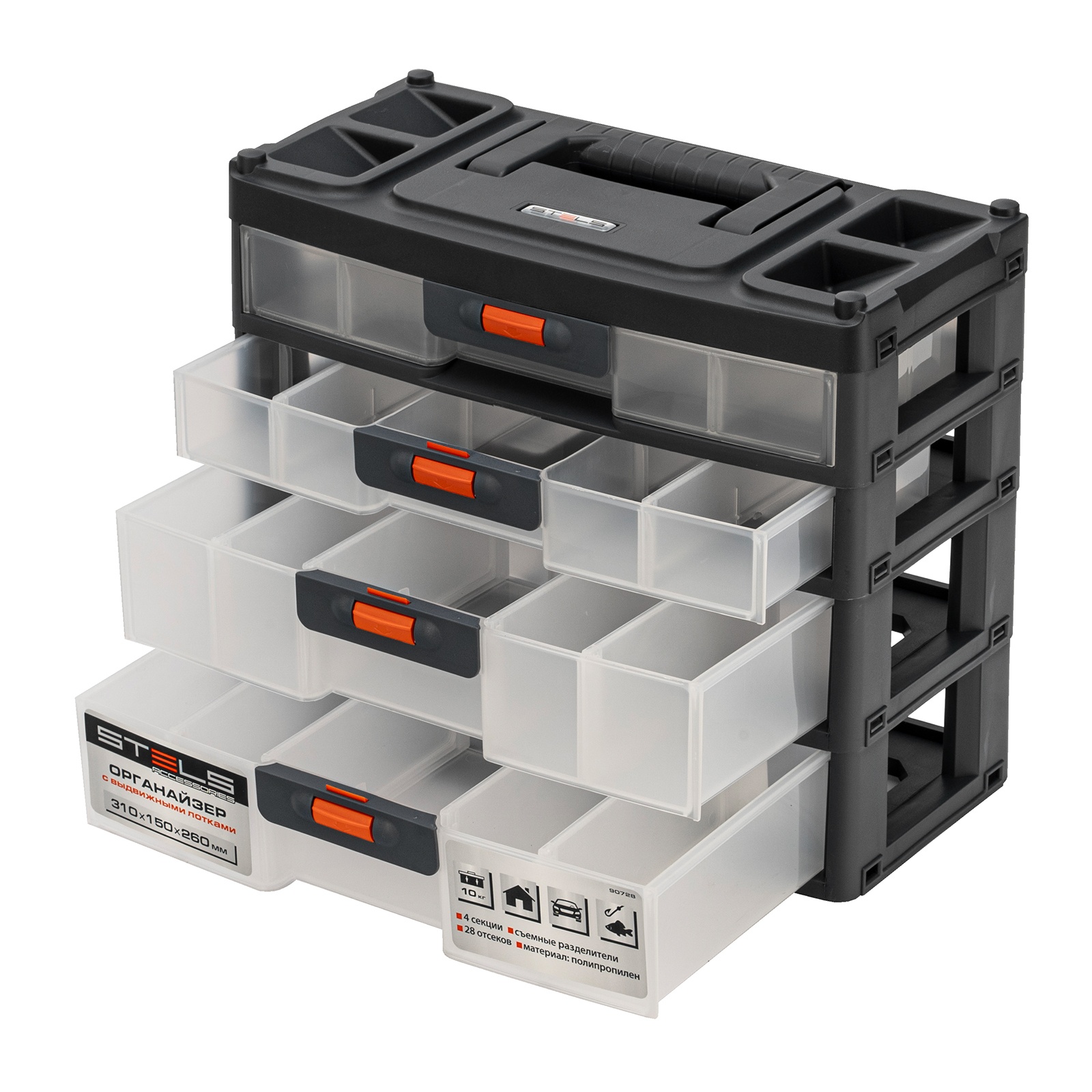 - Комфортная транспортировка — благодаря рукоятке и защелкам, предотвращающим случайное открытие, органайзер удобно перемещать.