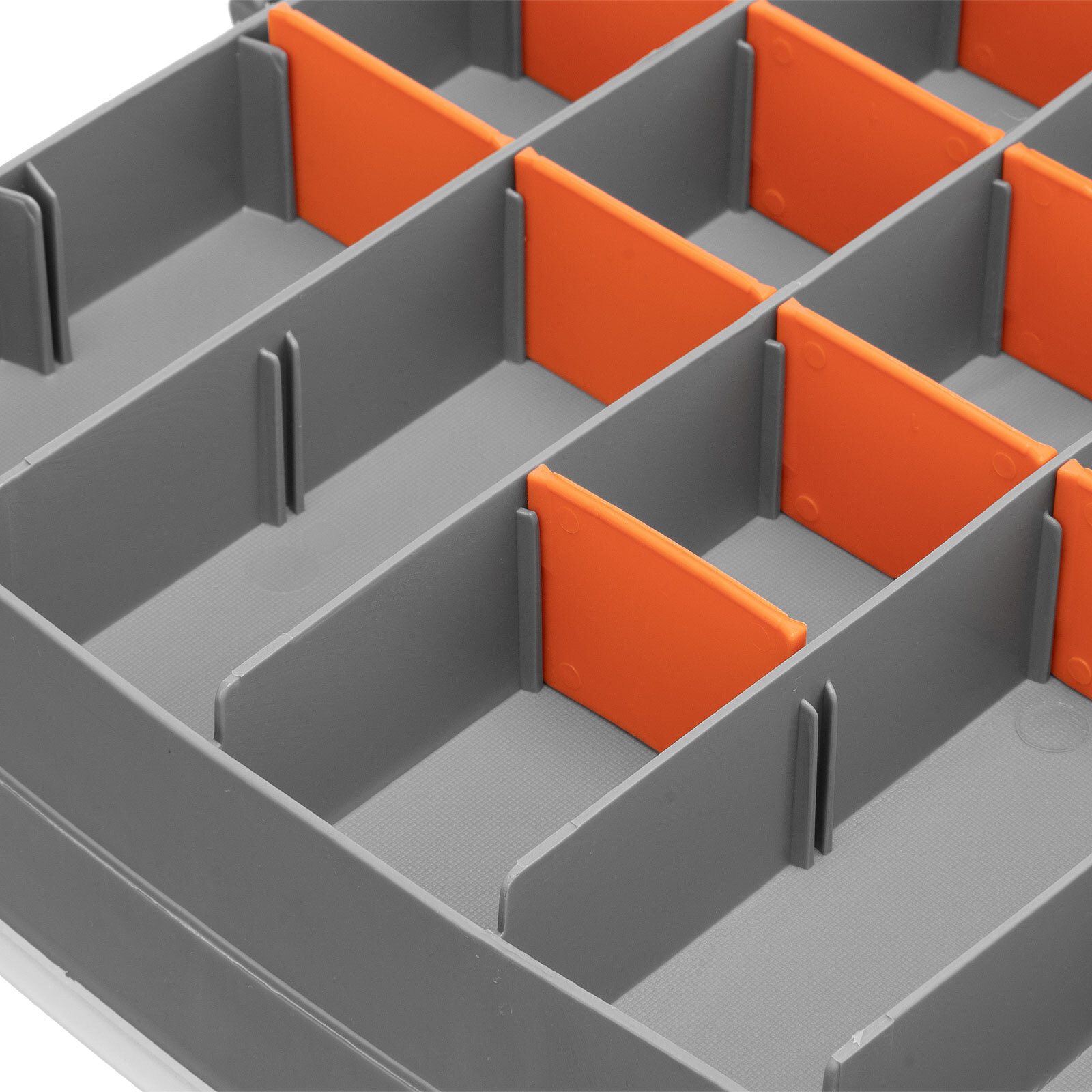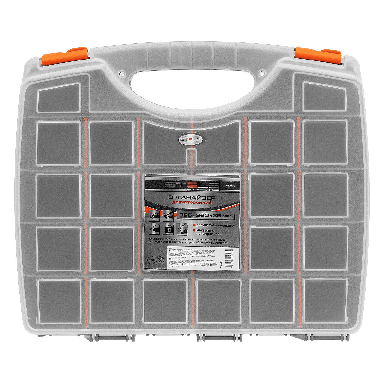 Двухсторонний органайзер из пластика Stels 90709 размером 325 х 280 х 85 мм пригодится в хозяйстве и мастерской для хранения крепежных элементов, принадлежностей для рукоделия, снастей и т.д. Он обеспечивает быстрый доступ к предметам, не допуская их перемешивания и утери.