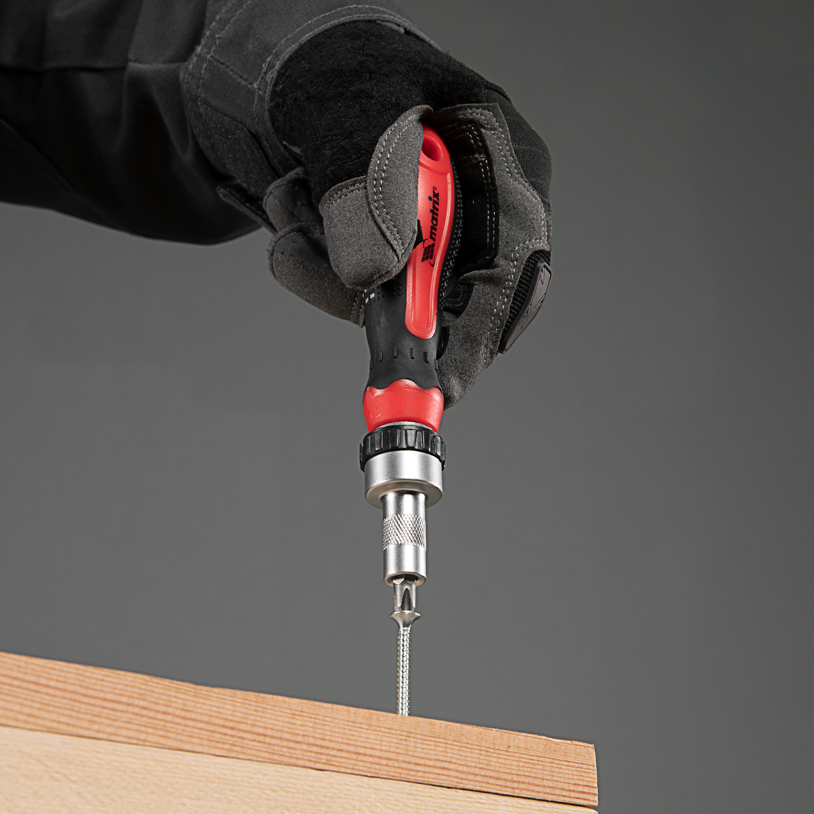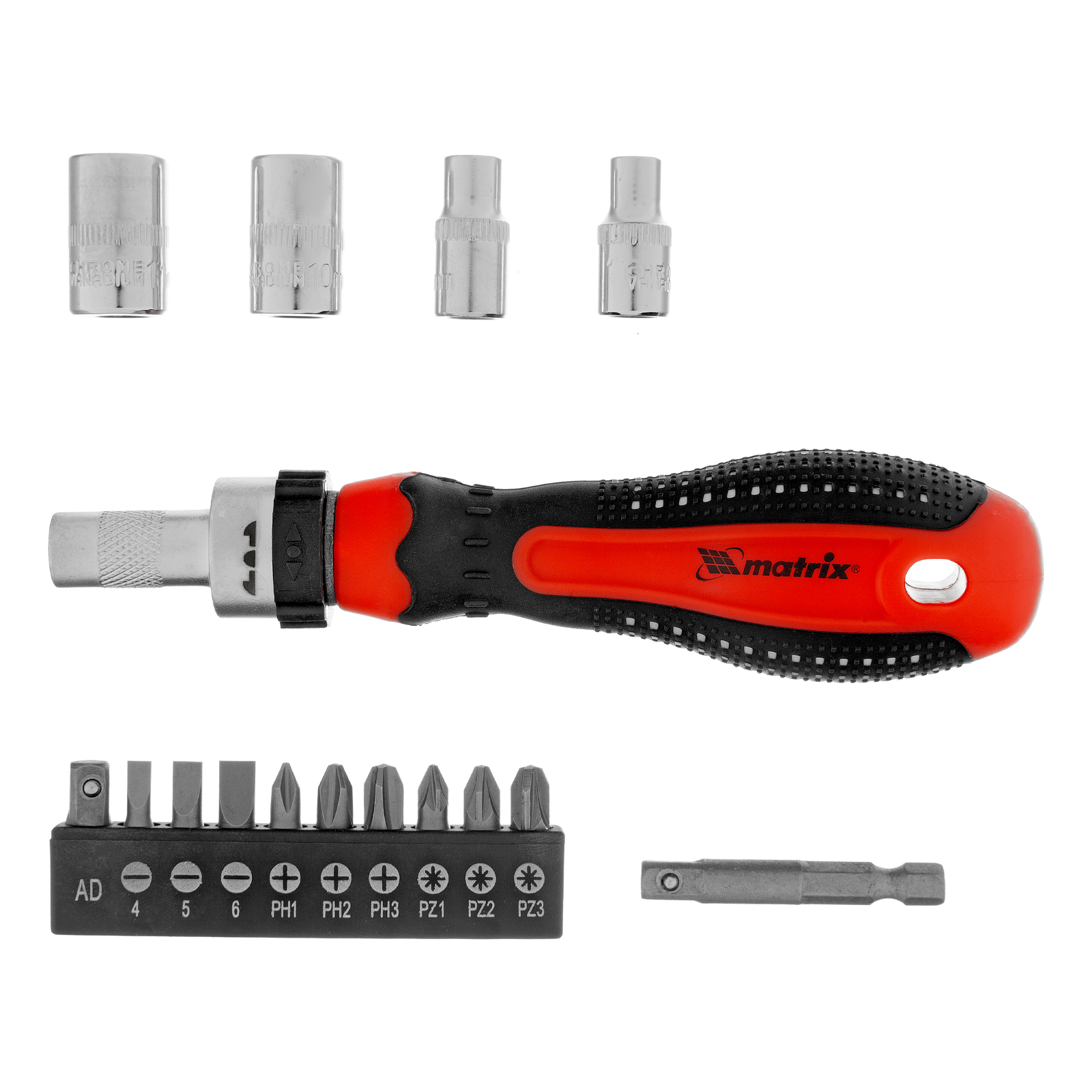 Реверсивная отвертка Matrix 11332 с набором бит и торцевых насадок из стали CrV, с присоединительным размером 1/4", 16 шт. в упаковке, предназначена для работ с резьбовыми соединениями. Благодаря торцевым головкам с адаптером может использоваться в качестве накидного ключа. Храповой механизм облегчает вращение отвертки и увеличивает скорость работы. Направление вращения можно менять при помощи кольцевого переключателя. Отвертка пригодится при сборке и установке мебели, ремонте бытовой техники, будет полезна дома, на даче или в гараже.