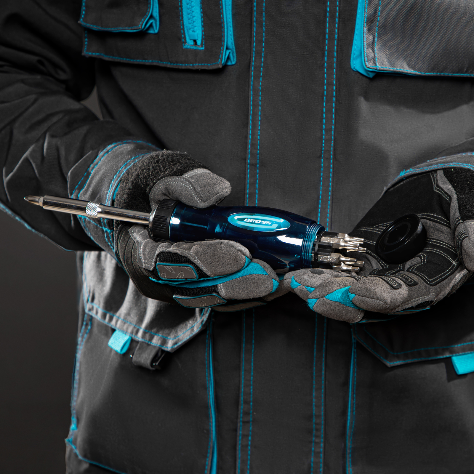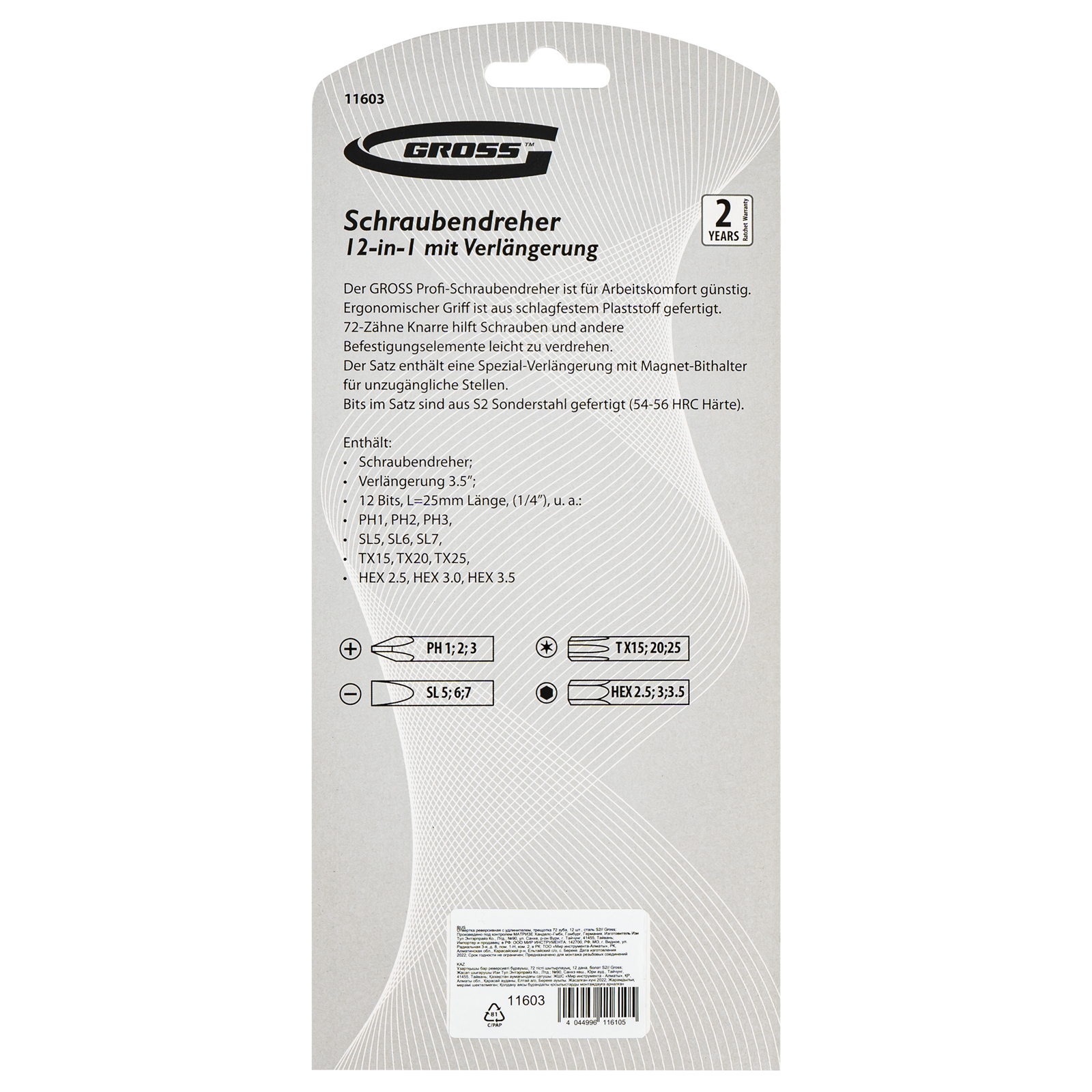 Реверсивная отвертка Gross 11603 с удлинителем и трещоткой на 72 зуба комплектуется 12 сменными битами из стали S2 для эффективной работы с саморезами, винтами и другим крепежом. Она пригодится при проведении монтажных, строительных, ремонтных работ. Для расширения возможностей отвертки можно использовать любые биты длиной 25 мм с хвостовиком 1/4 дюйма.