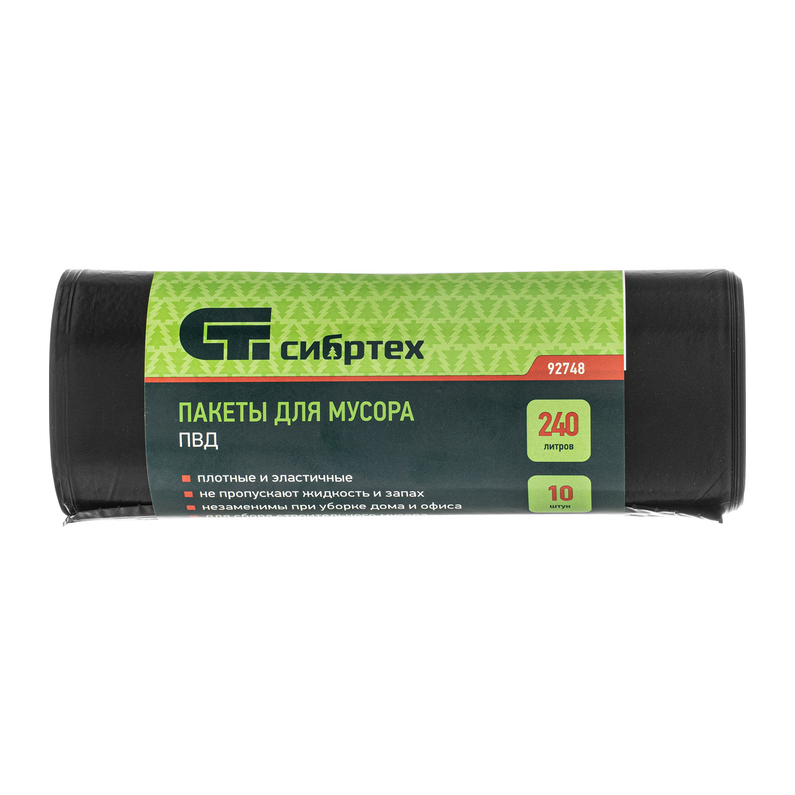 Пакеты для мусора Сибртех 92748 из ПВД, с типом дна «Звезда», объемом 240 л, 10 шт. в упаковке, поставляются в коротком ролике, и предназначены для сбора, транспортировки и утилизации мусорных отходов. Предотвращают загрязнение мусорного ведра или урны, будут полезны на даче, строительной площадке и в офисе.