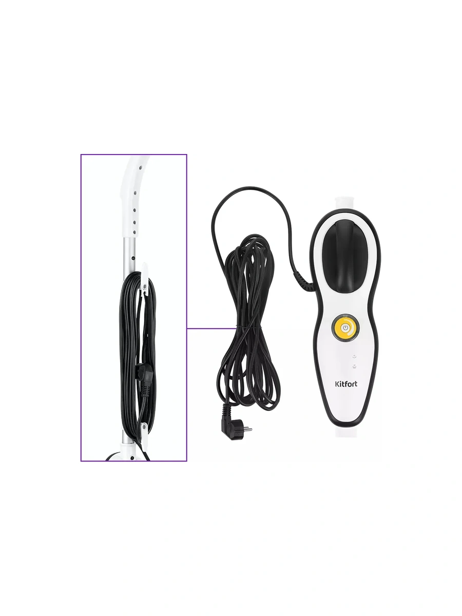 При хранении швабра не займёт много места. Шнур длиной 8 м не сковывает и не ограничивает ваше перемещение во время уборки. На ручке и корпусе швабры имеются держатели для смотки шнура.