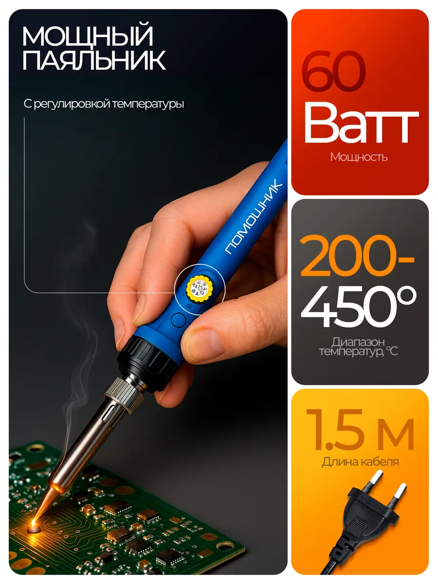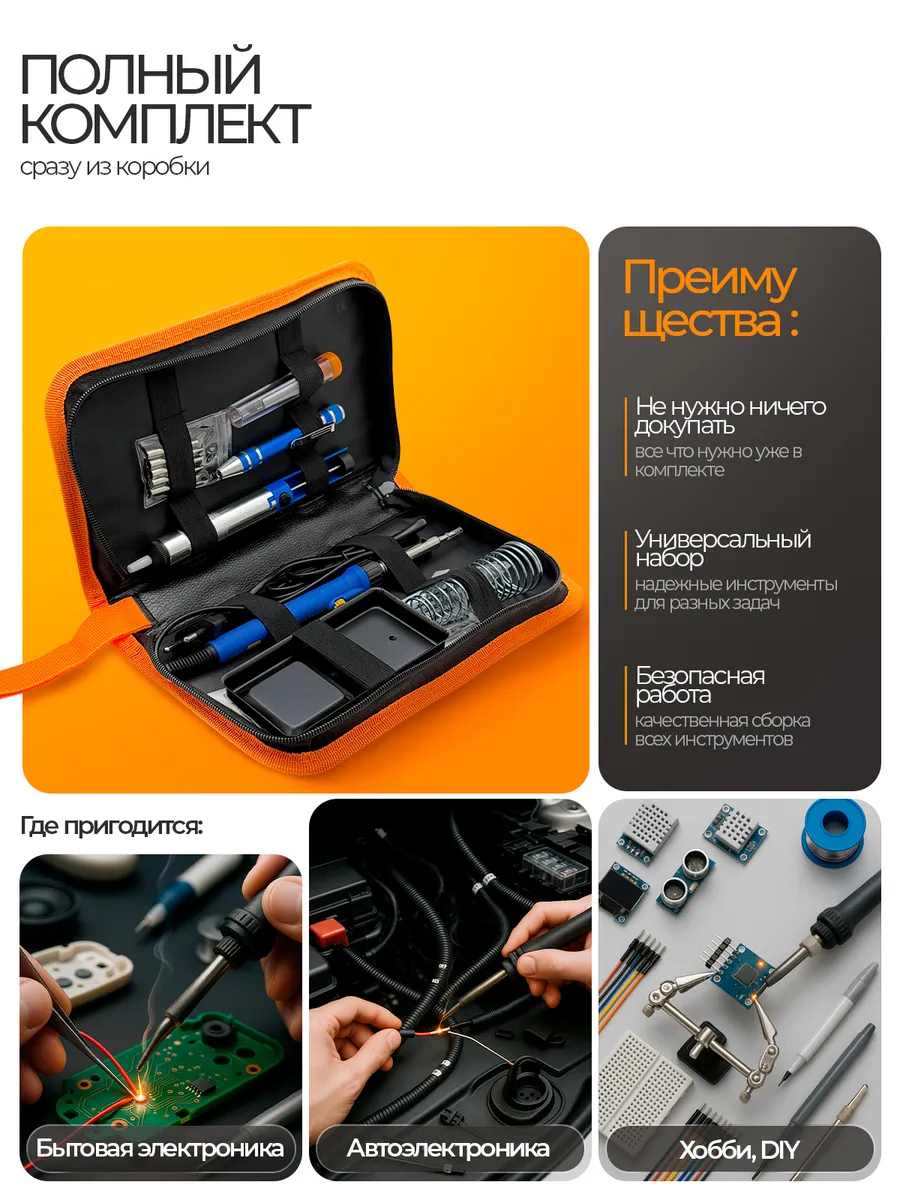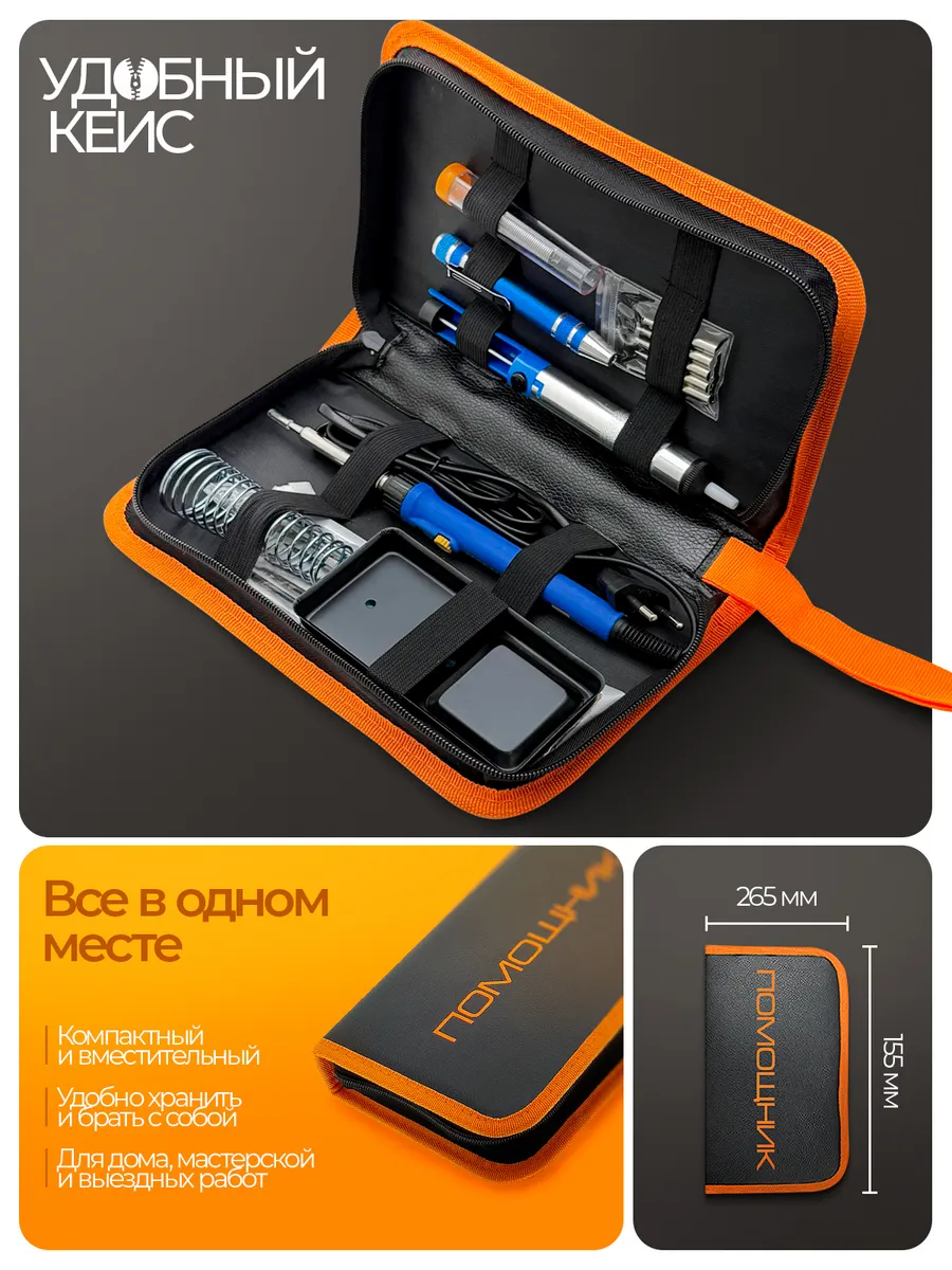 Паяльник электрический, паяльный набор — это универсальный инструмент для ремонта и сборки электроники, техники и различных устройств. Подходит как для профессионального использования, так и для домашнего мастера. В комплект входят все необходимые инструменты для удобной пайки микросхем, деталей плат и проводов. Устройство позволяет легко работать с пластиковыми и полипропиленовыми элементами, а также использовать различные насадки для разных задач. Температура регулируется с помощью встроенного регулятора, что обеспечивает точность работы при пайке схем или ремонте телефонов, радиоаппаратуры и другой электроники. Паяльщик сможет эффективно паять элементы на плате или соединять проводок благодаря стабильной подаче питания от сети 220 вольт. Также прибор поможет в работе с пластмассовыми деталями, волосом провода или даже при монтаже труб из пластика.