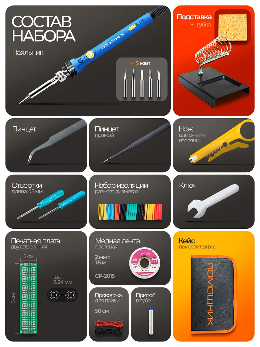 Паяльник, жало 5шт, медная лента, изоляция, отвертки, нож, плата, пинцет, оловоотсос