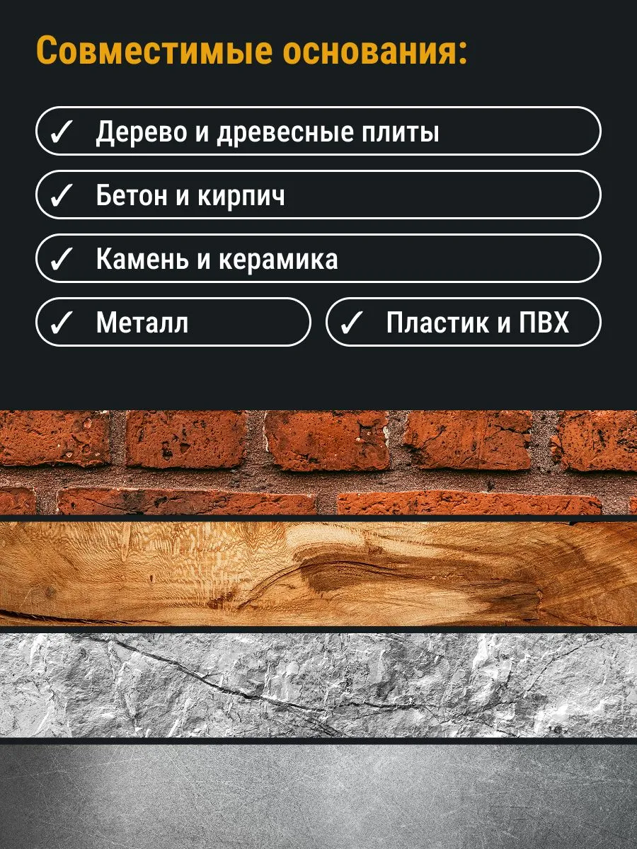 Подходит для любых условий — от внутренних отделочных работ до наружных сборок. Компактный формат обеспечивает удобство хранения и контроля расхода материала даже в труднодоступных местах.