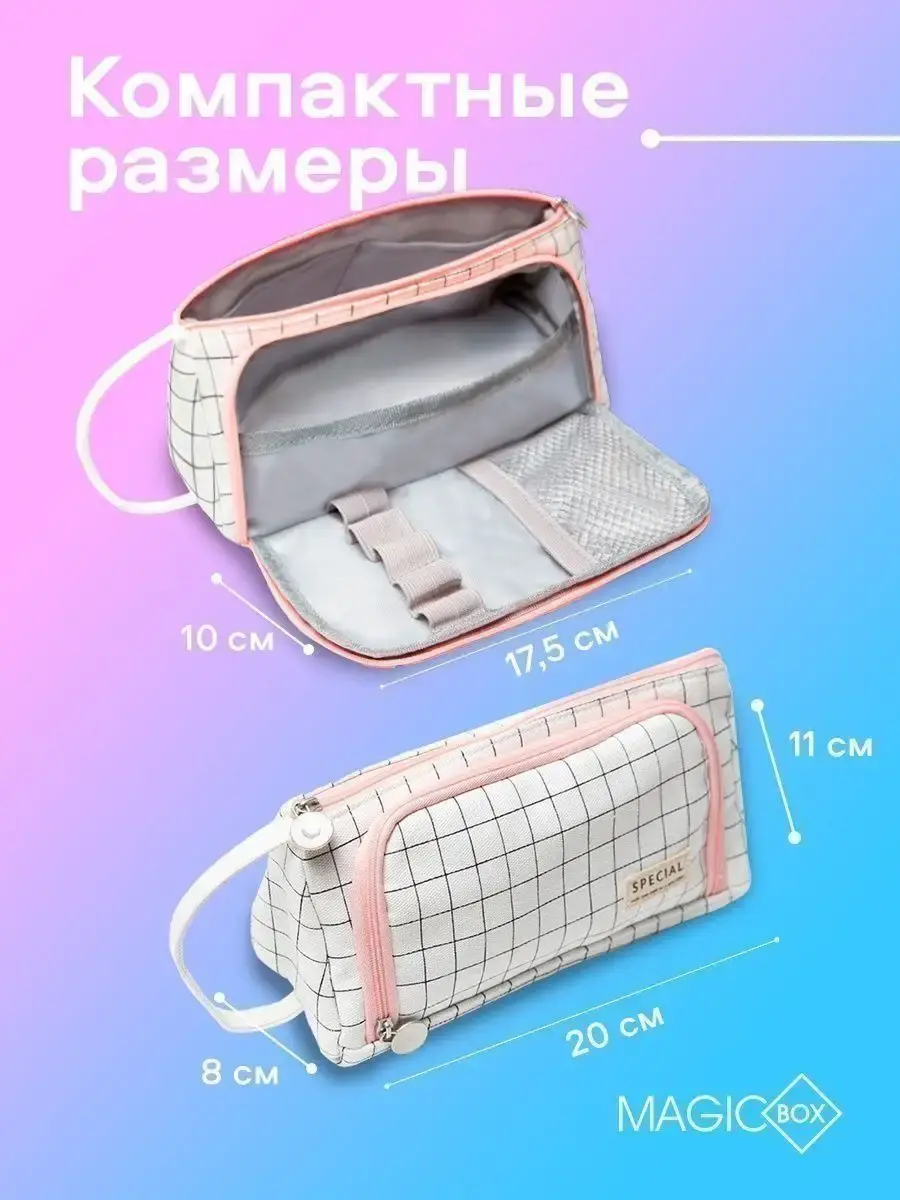Классно, вы нашли самые трендовые пеналы! Да-да, те самые, стильные, красивые и удобные, в которые поместятся все вещи, милая канцелярия, шпаргалки и телефон. Школьный пенал для девочки от MAGIC BOX - стильный и модный аксессуар для школы. Яркий и привлекательный дизайн, большая вместительность и безупречное качество помогут сделать процесс обучения удобным и приятным. Он подойдет как ученикам младших классов, так и подросткам старшеклассникам. **Внимание: Пенал продается, без канцтоваров! На фото продемонстрирована вместительность и пример того, что вы можете в него положить.** Вместительность - до 70 предметов. Размеры – 20х11х8 см. Пенал вместительный имеет мягкий тканевой каркас и закрывается на молнию. Особенности: неполная перегородка между отделами для удобного доступа откидная планка с резинками для наиболее часто используемых письменных принадлежностей. Внутри также есть кармашки, резинки-держатели и карман-сетка. Аксессуар оснащен удобной ручкой для переноски.