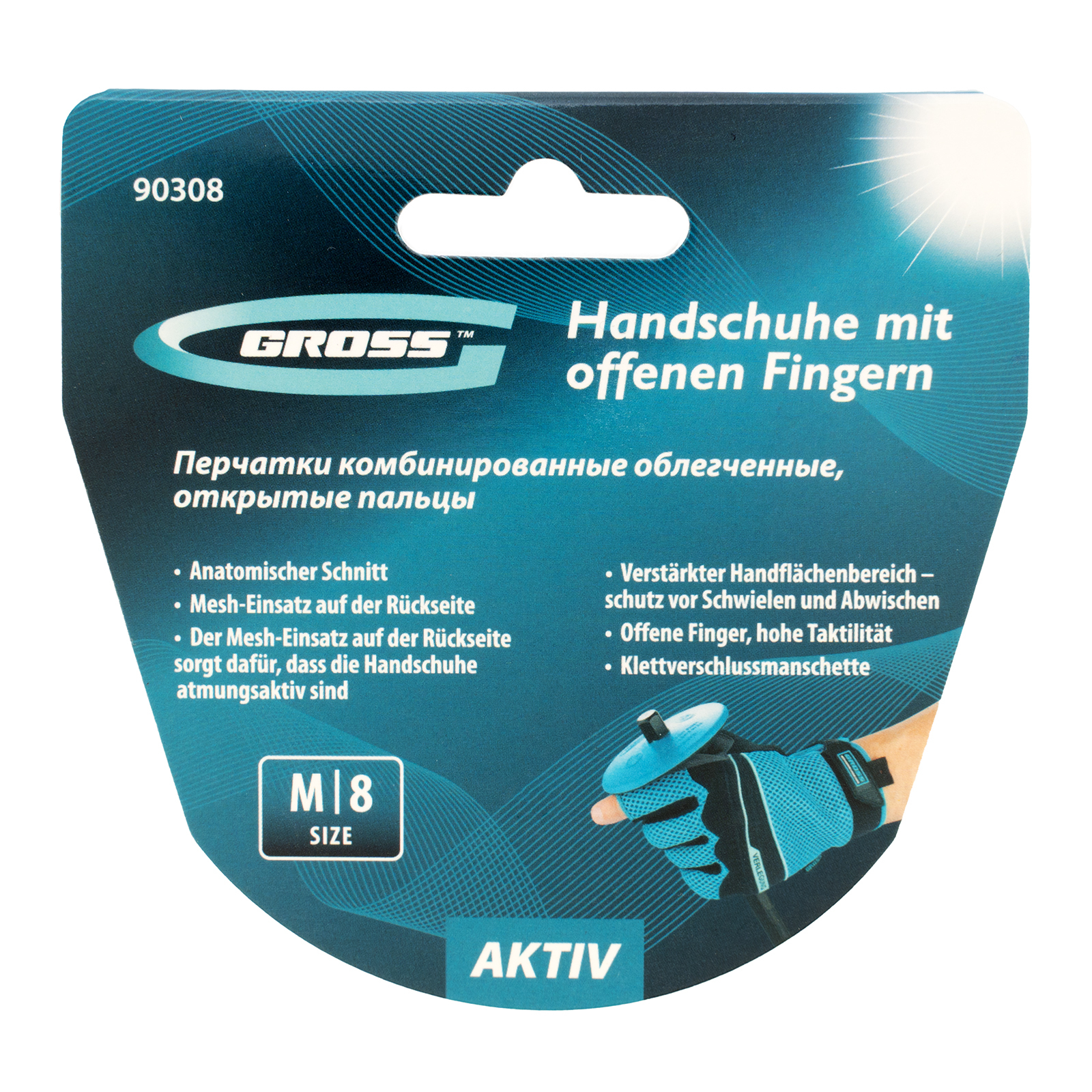 Перчатки комбинированные облегченные Gross AKTIV 90308 с открытыми пальцами, размера М (8), служат для защиты рук от механических повреждений и образования мозолей. Формованные накладки на ладонях препятствуют появлению синяков и ссадин. Открытые пальцы позволяют использовать перчатки в жаркую погоду, при этом подверженные износу части перчатки остаются защищенными. Изделия могут использоваться при проведении строительных и ремонтных работ, а также во время занятий спортом или активного отдыха.