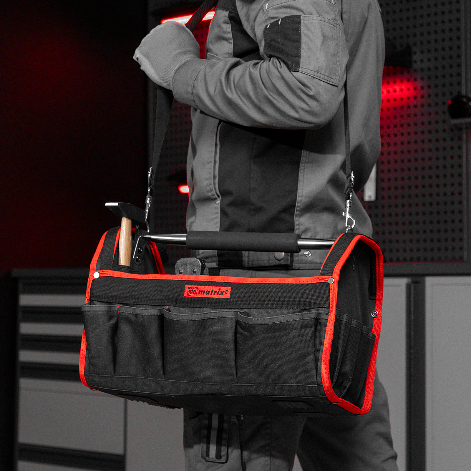 Каркасная переноска Matrix 90257 размером 415 х 230 х 260 мм удобна для перемещения и хранения инструментов. Имеет прочный каркас и весит 1,35 кг, ее легко переносить благодаря регулируемому плечевому ремню. В удобных карманах можно расположить все необходимые инструменты. Переноска пригодится дома, в гараже или в поездке.