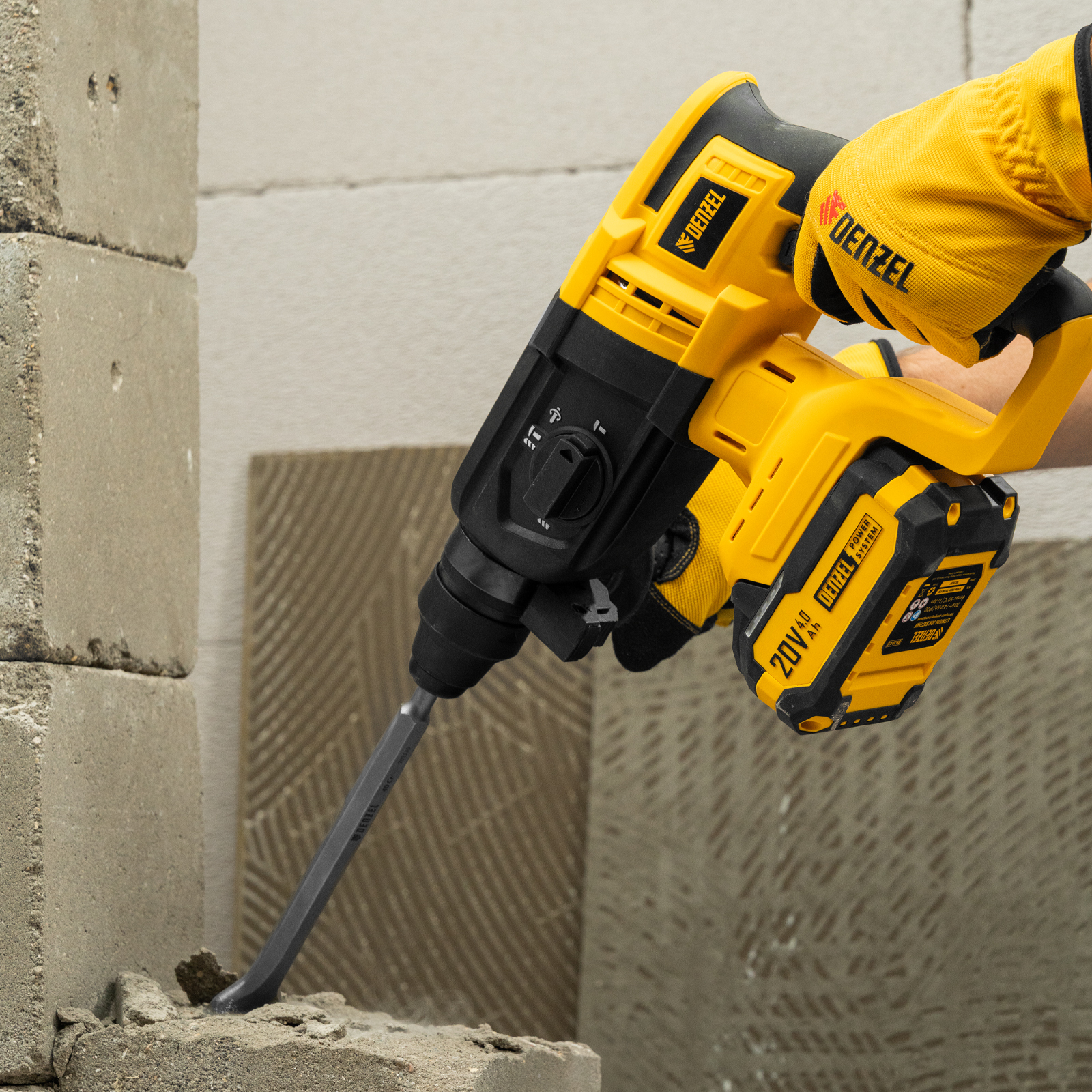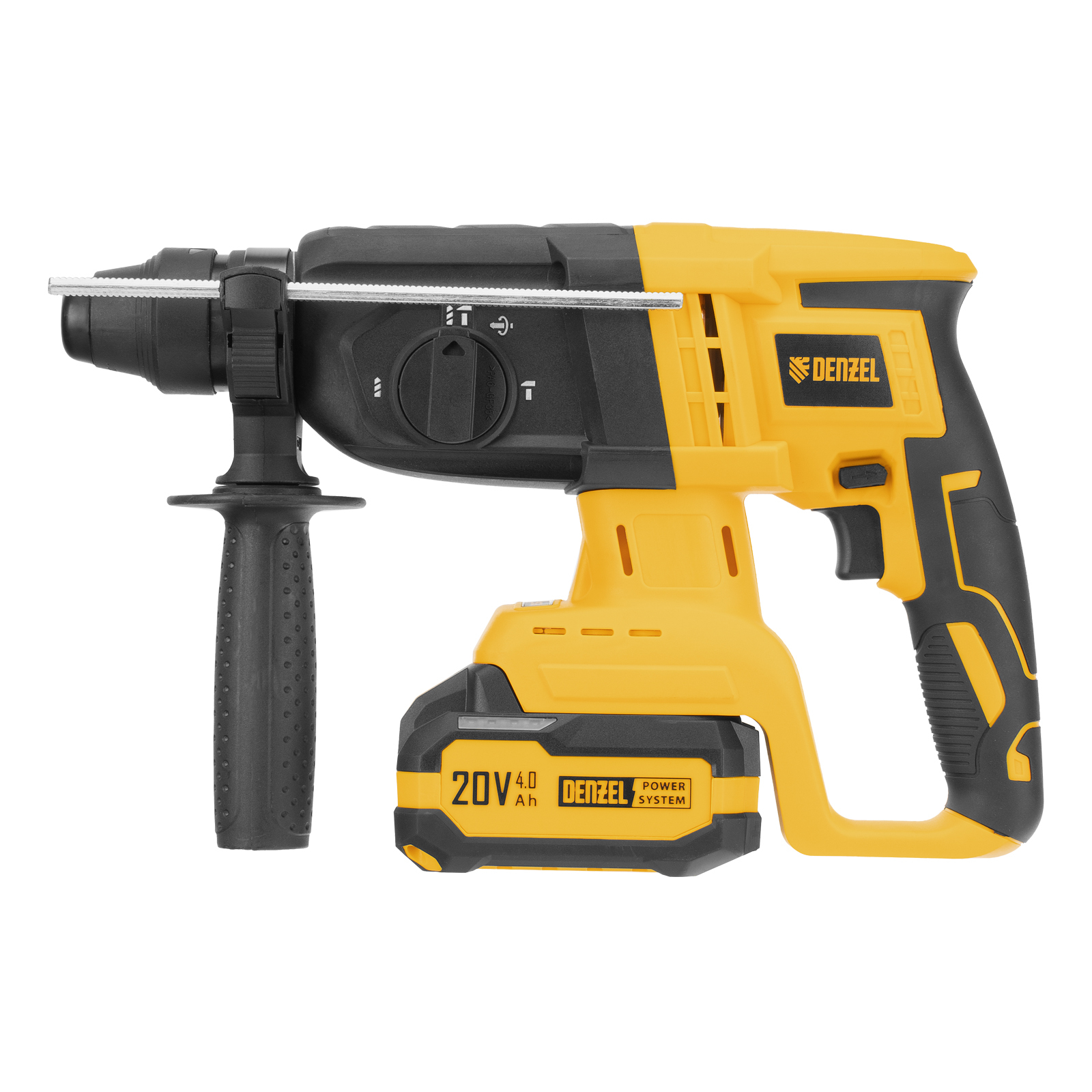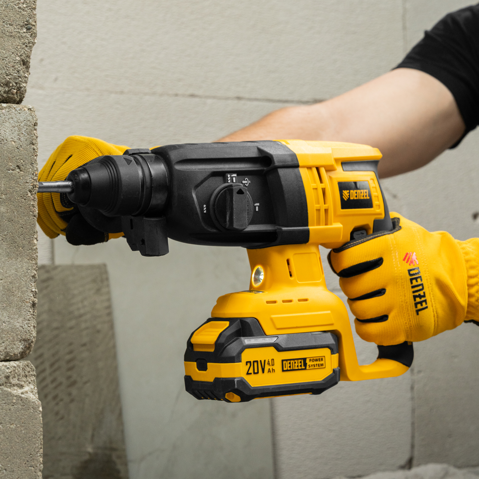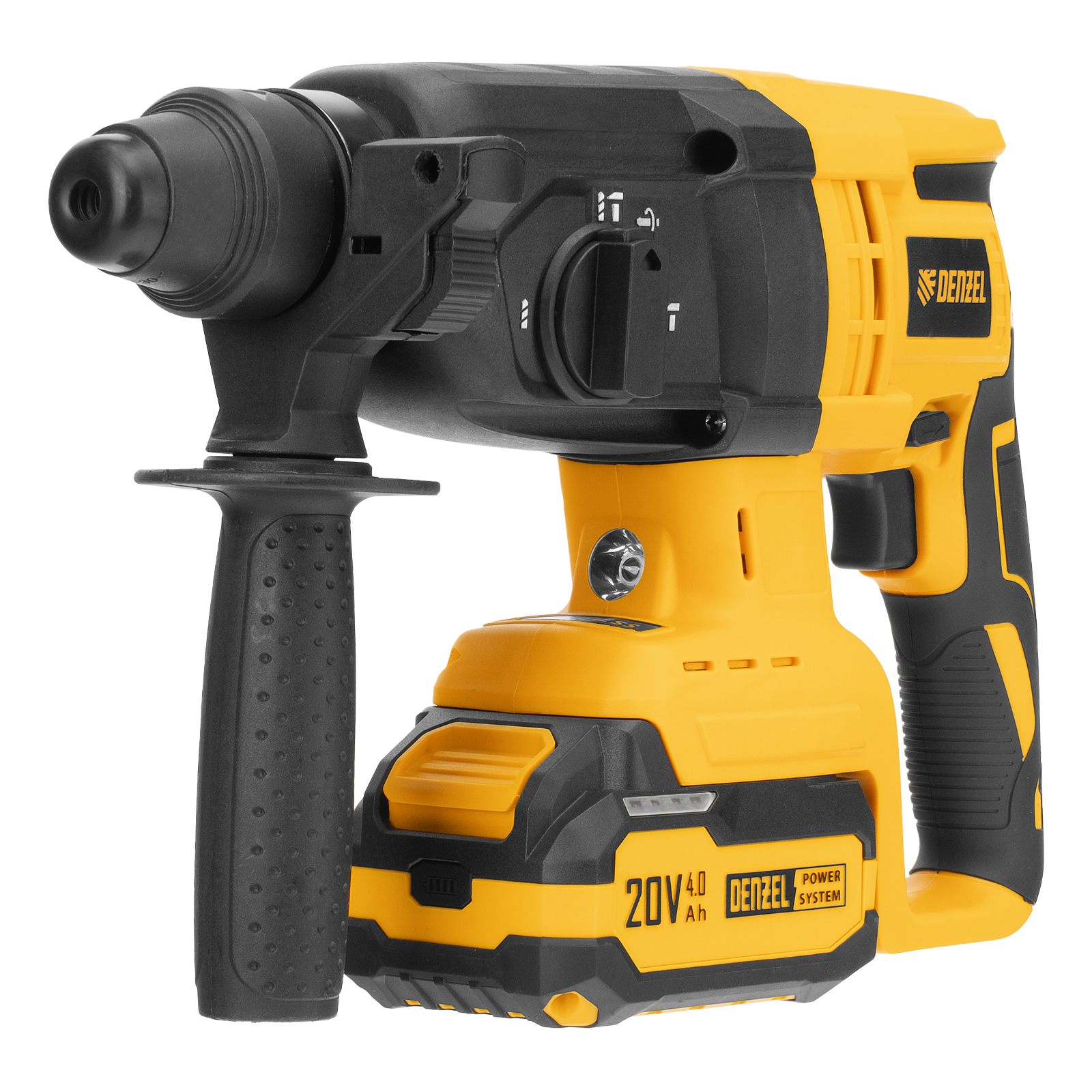 Аккумуляторный перфоратор Denzel RHH-BL-20-28 26707 используется для сверления и бурения отверстий в различных материалах, разрушения кирпичной кладки, штробления бетона, камня и кирпича. Максимальный диаметр отверстий в древесине составляет 40 мм, металле — 13 мм, бетоне — 28 мм. Можно выбрать один из трех режимов работы: долбление, сверление и сверление с ударом. Угловое положение долота регулируется для наиболее эффективной работы. Максимальная частота вращения составляет 1050 об/мин, ударов — 4800 уд/мин.