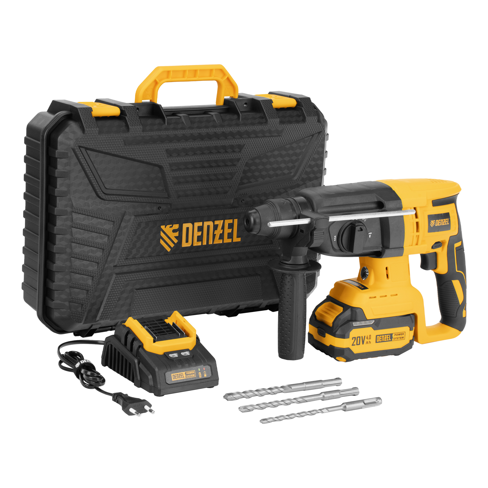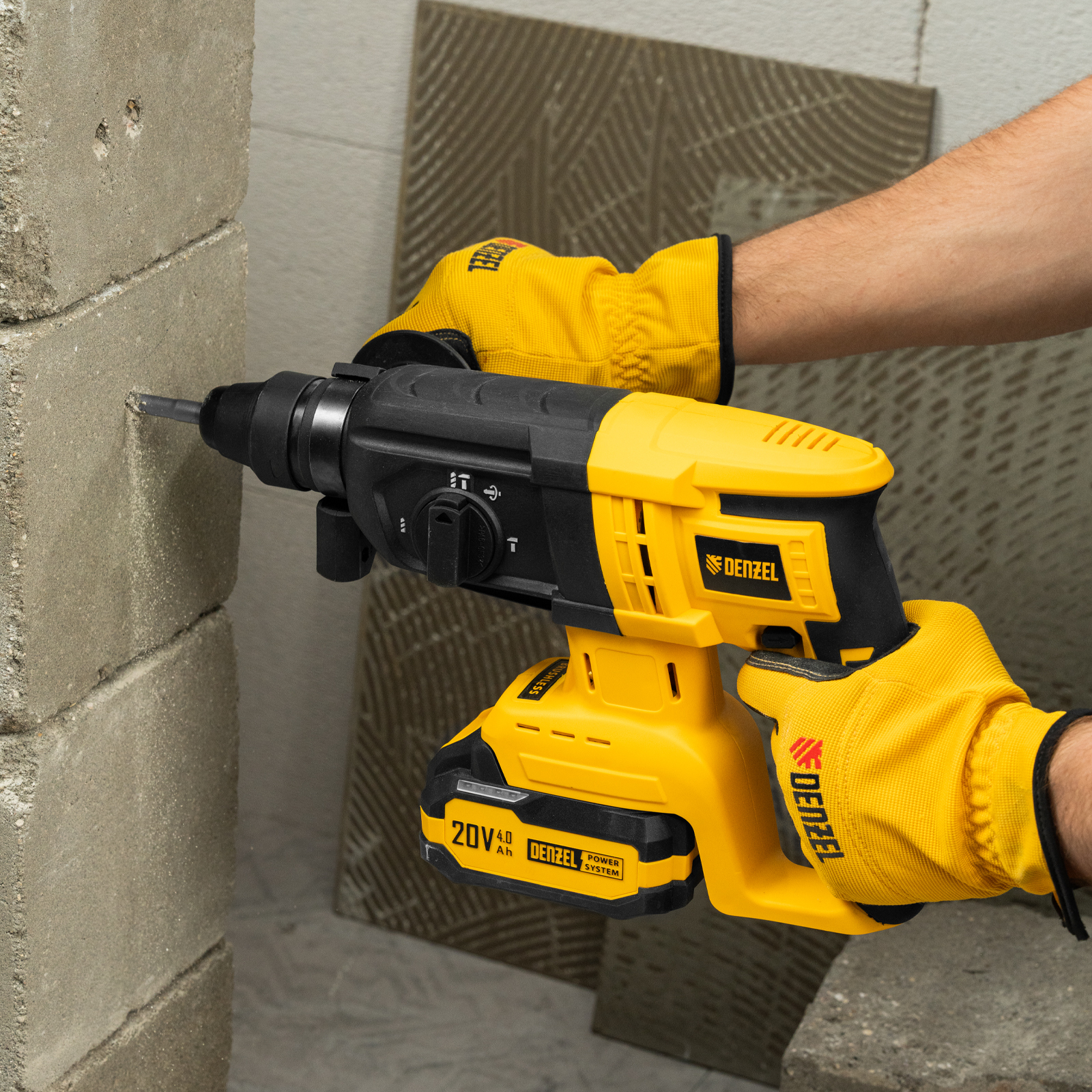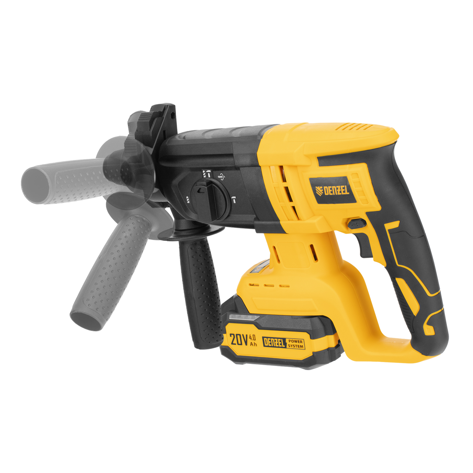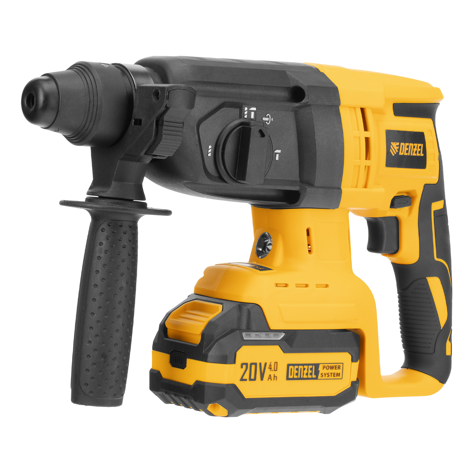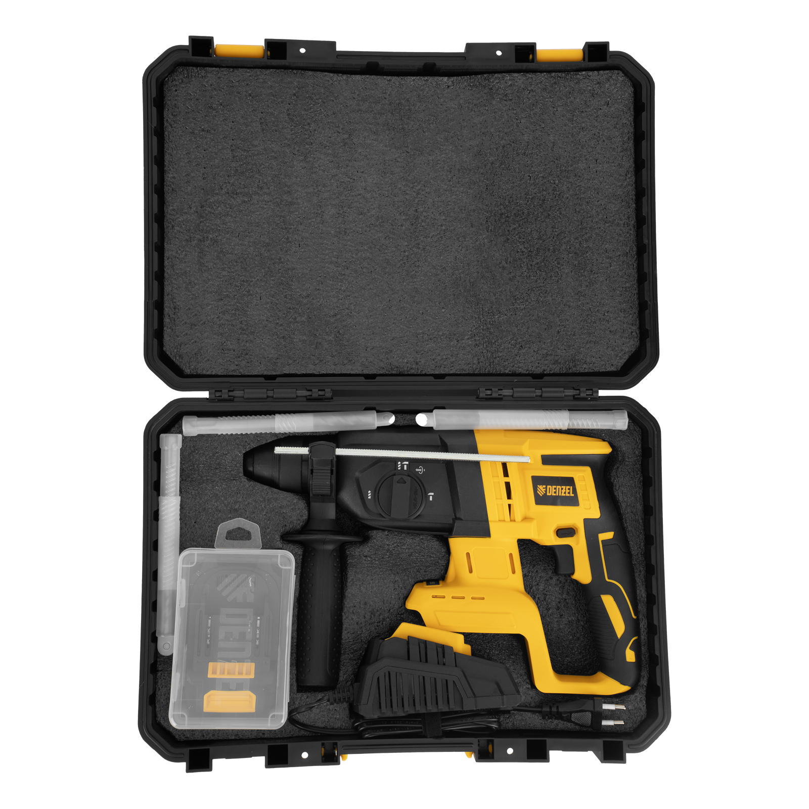 Аккумуляторный перфоратор Denzel RHH-BL-20-28 26707 используется для сверления и бурения отверстий в различных материалах, разрушения кирпичной кладки, штробления бетона, камня и кирпича. Максимальный диаметр отверстий в древесине составляет 40 мм, металле — 13 мм, бетоне — 28 мм. Можно выбрать один из трех режимов работы: долбление, сверление и сверление с ударом. Угловое положение долота регулируется для наиболее эффективной работы. Максимальная частота вращения составляет 1050 об/мин, ударов — 4800 уд/мин.