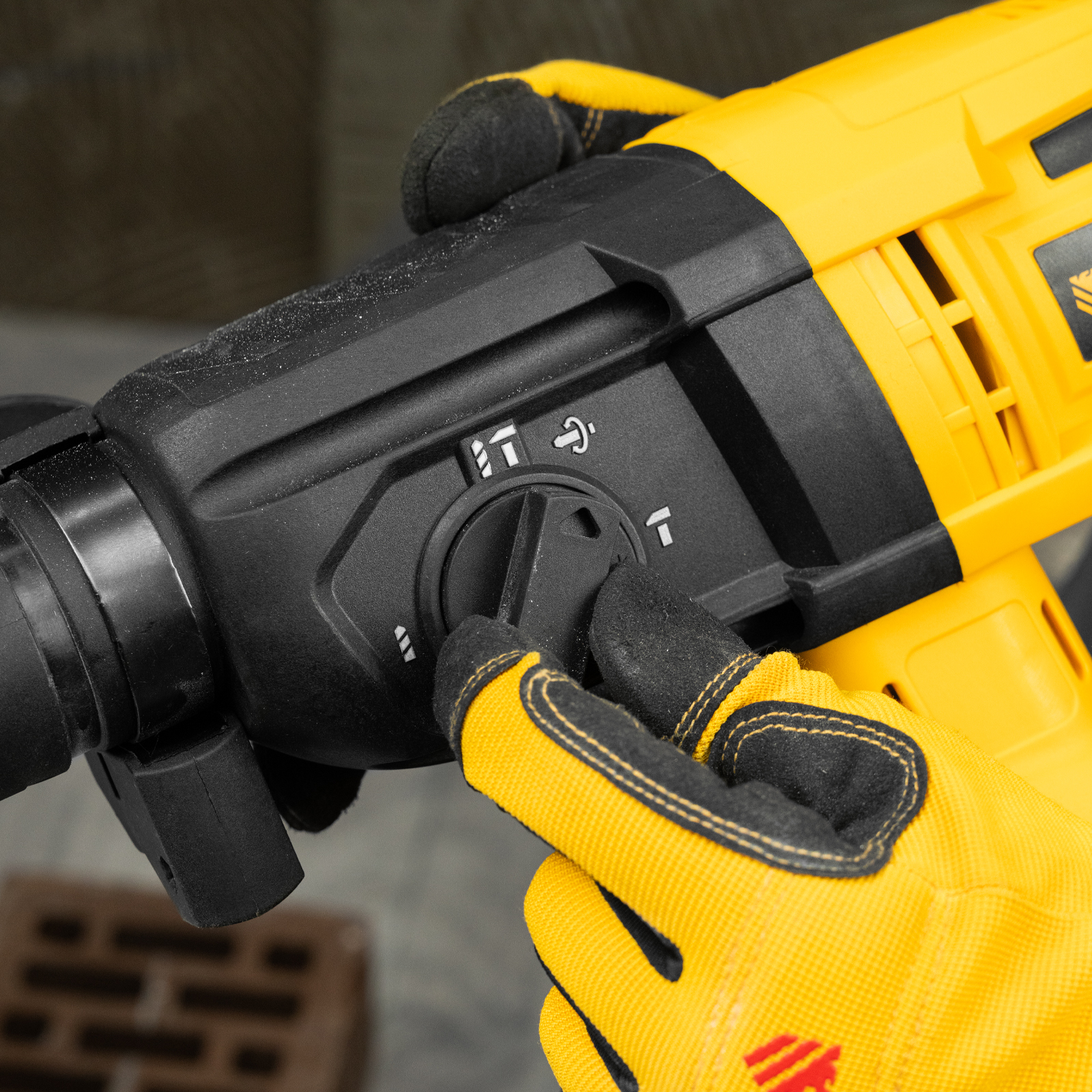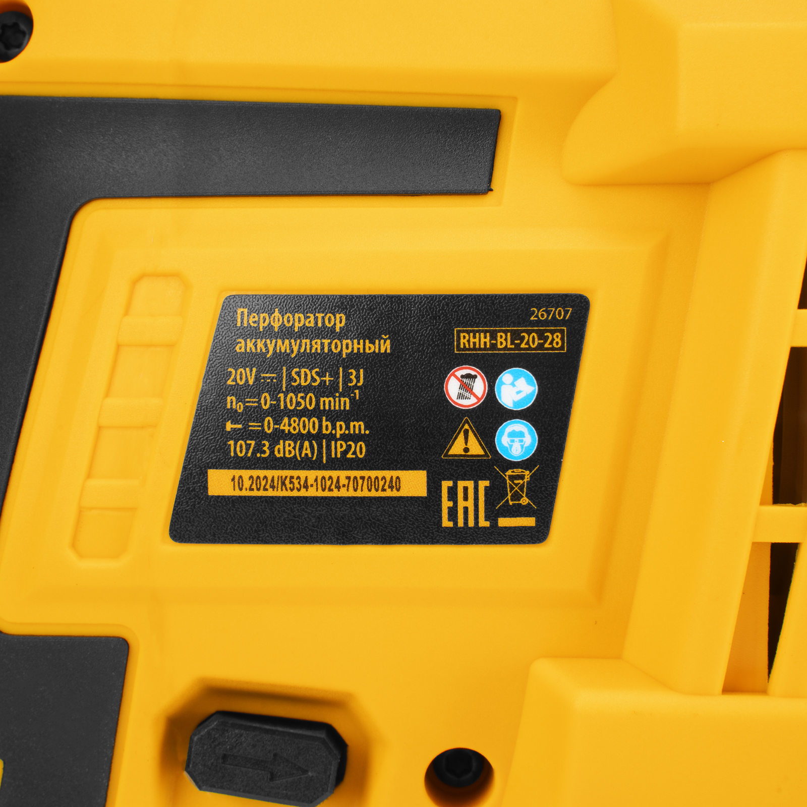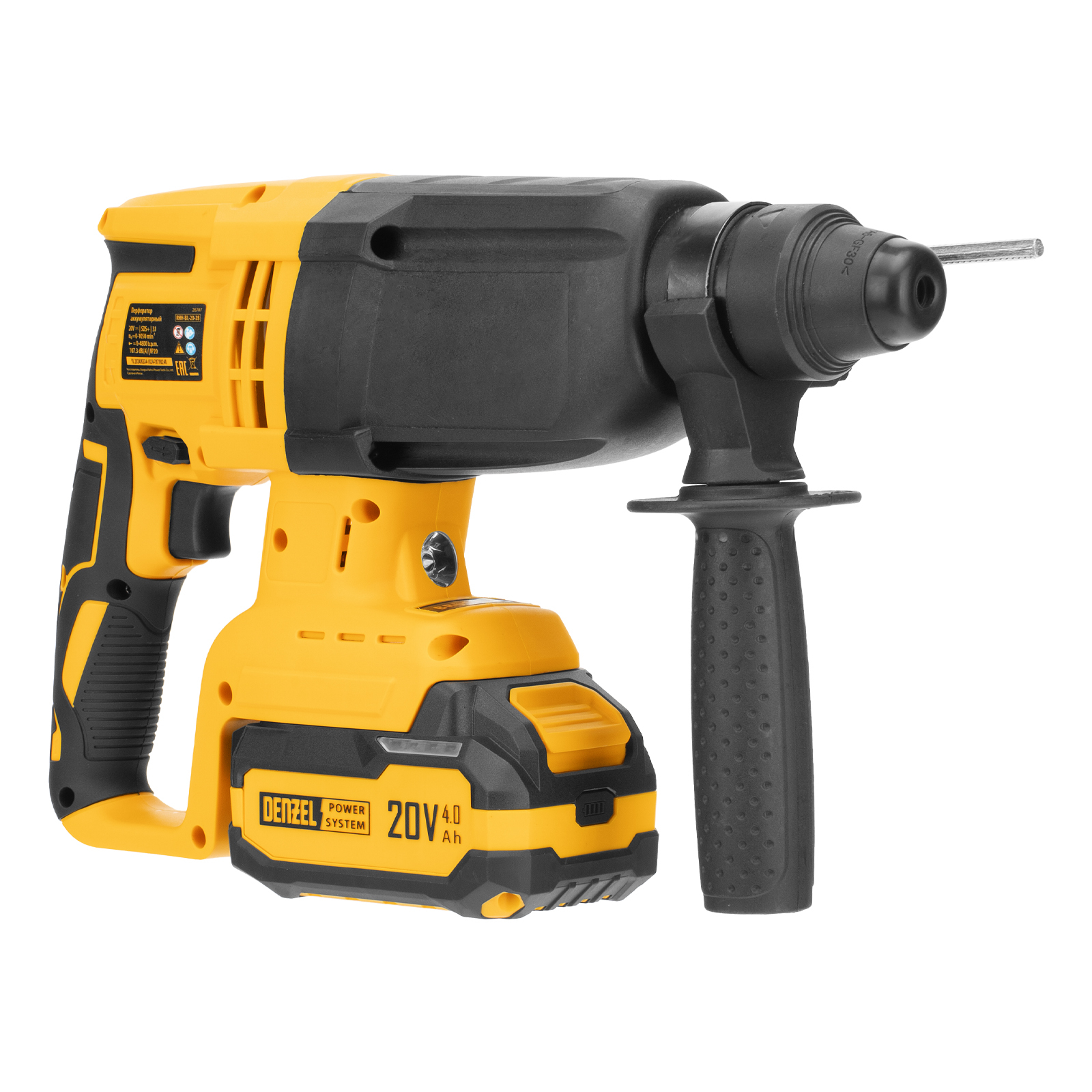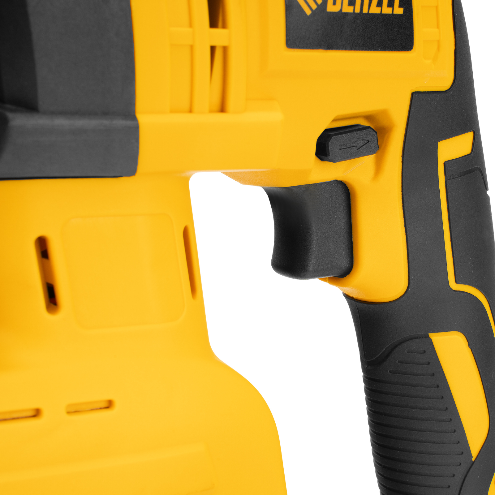 Аккумуляторный перфоратор Denzel RHH-BL-20-28 26707 используется для сверления и бурения отверстий в различных материалах, разрушения кирпичной кладки, штробления бетона, камня и кирпича. Максимальный диаметр отверстий в древесине составляет 40 мм, металле — 13 мм, бетоне — 28 мм. Можно выбрать один из трех режимов работы: долбление, сверление и сверление с ударом. Угловое положение долота регулируется для наиболее эффективной работы. Максимальная частота вращения составляет 1050 об/мин, ударов — 4800 уд/мин.