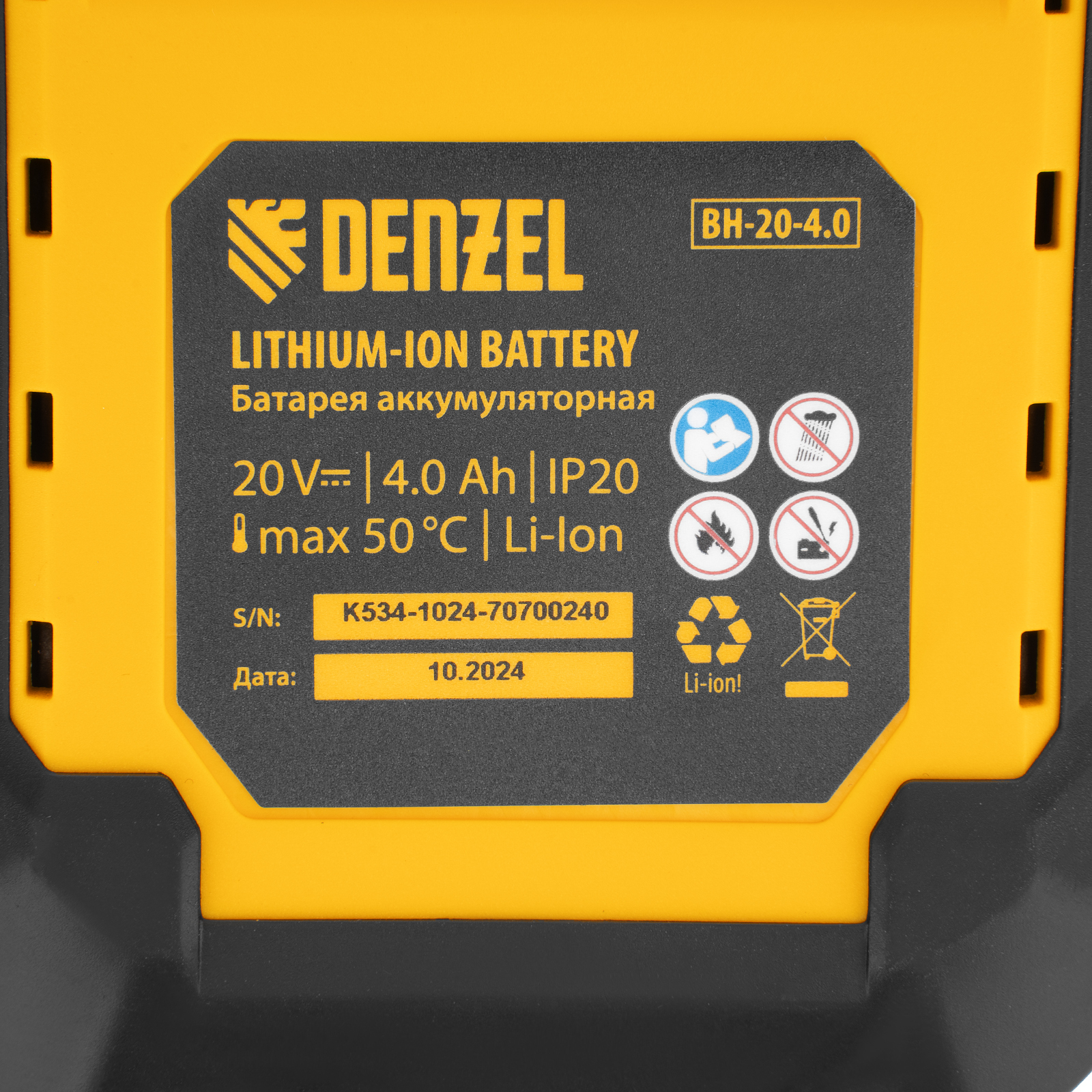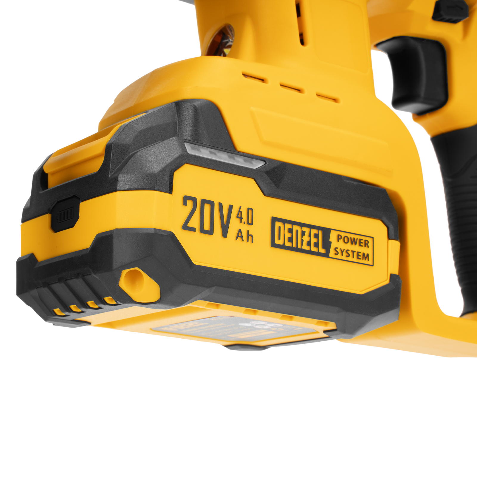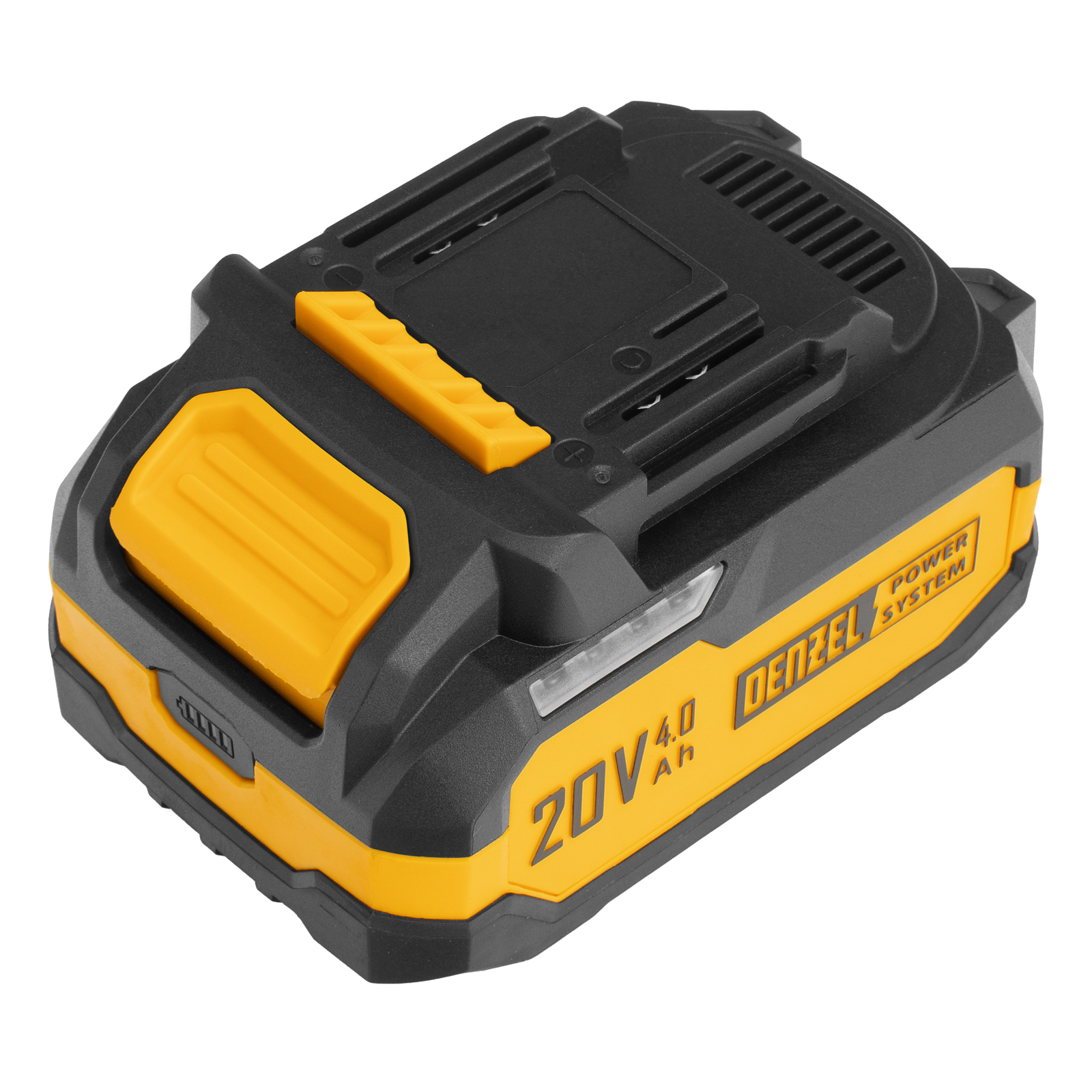 - Универсальность — аккумулятор Li-Ion емкостью 4 А·ч совместим со всеми инструментами единой платформы Denzel Power System 20V.