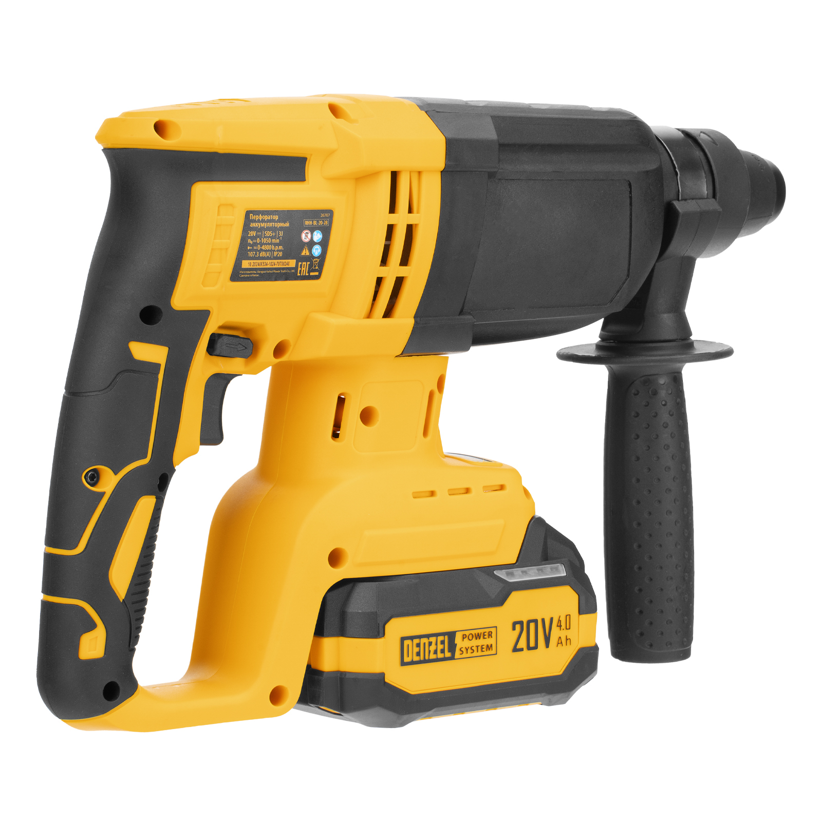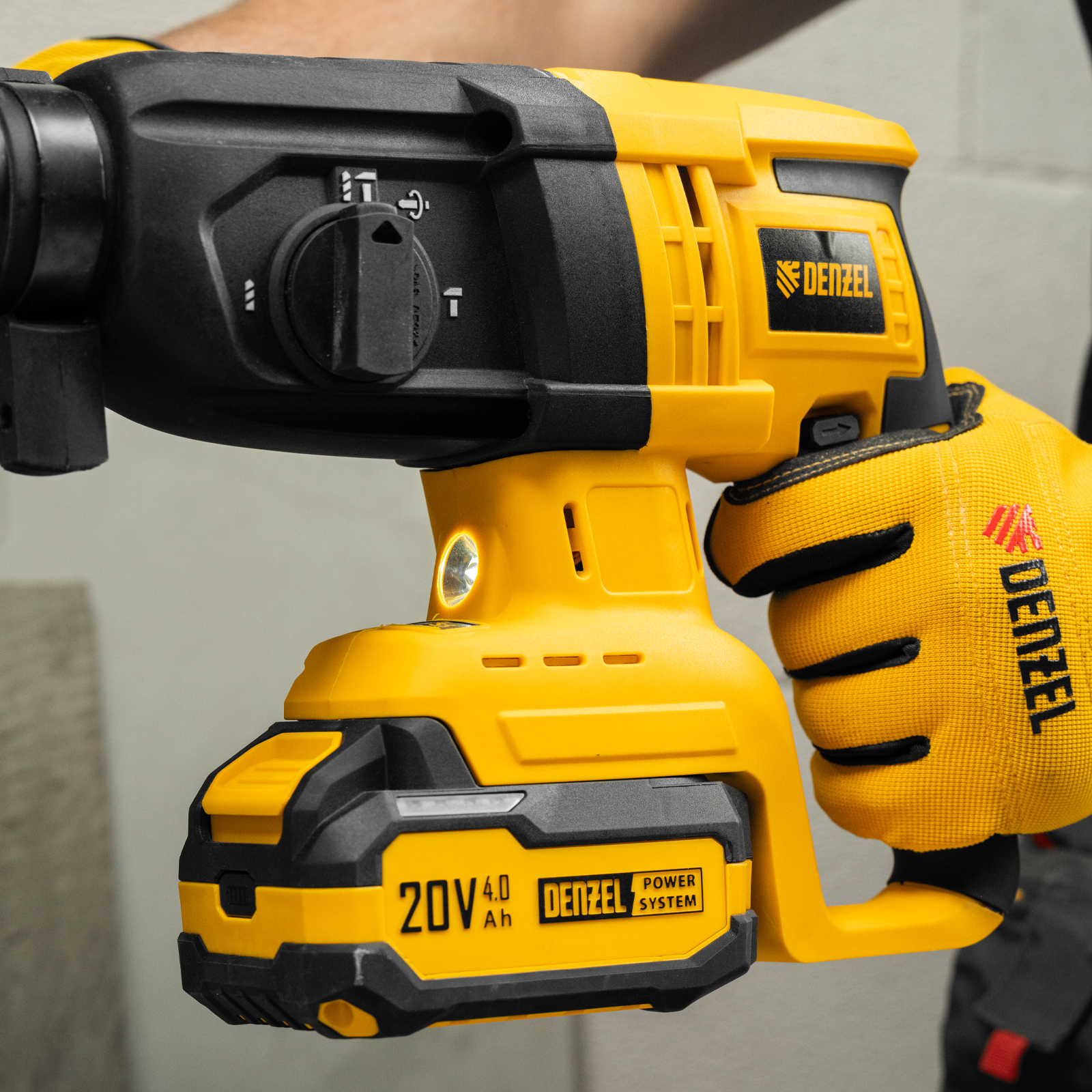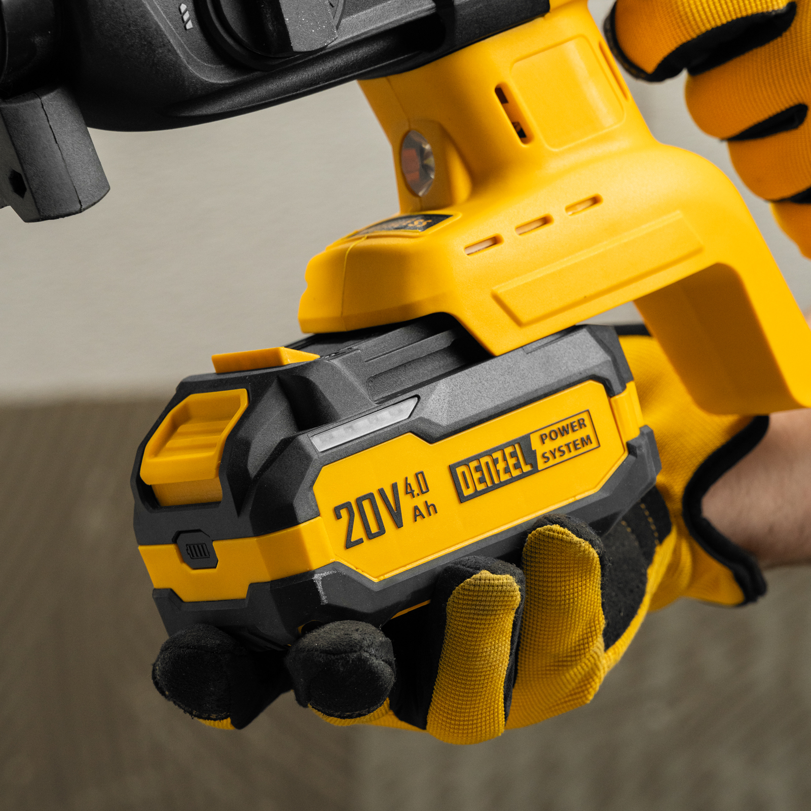 - Универсальность — аккумулятор Li-Ion емкостью 4 А·ч совместим со всеми инструментами единой платформы Denzel Power System 20V.