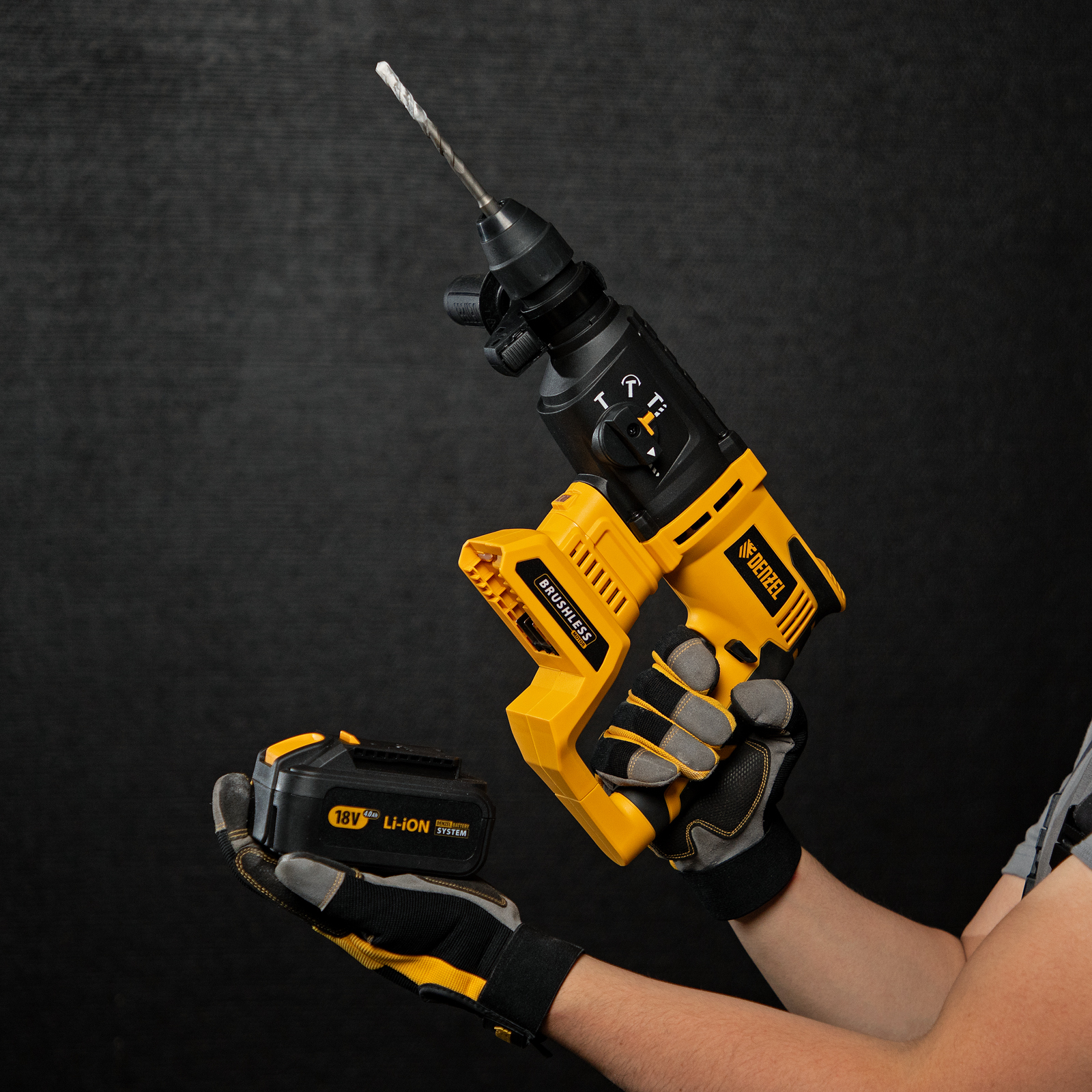 Аккумуляторный перфоратор Denzel BLRH-IB-26 26701 с аккумулятором Li-Ion емкостью 4 Ач и напряжением 18 В предназначен для сверления отверстий в различных материалах, а также для штробления стен, разрушения кирпичной кладки. Поддерживает несколько режимов работы: сверление, бурение, долбление + регулировка положения долота (опция Vario Lock). Максимальный диаметр отверстий в древесине составляет 40 мм, металле — 13 мм, бетоне — 26 мм. Инструмент совершает до 4800 ударов в минуту, развивая энергию до 3 Дж, чем обусловлена его высокая производительность и эффективная работа с твердыми материалами. Перфоратор пригодится для проведения строительных и ремонтных работ.