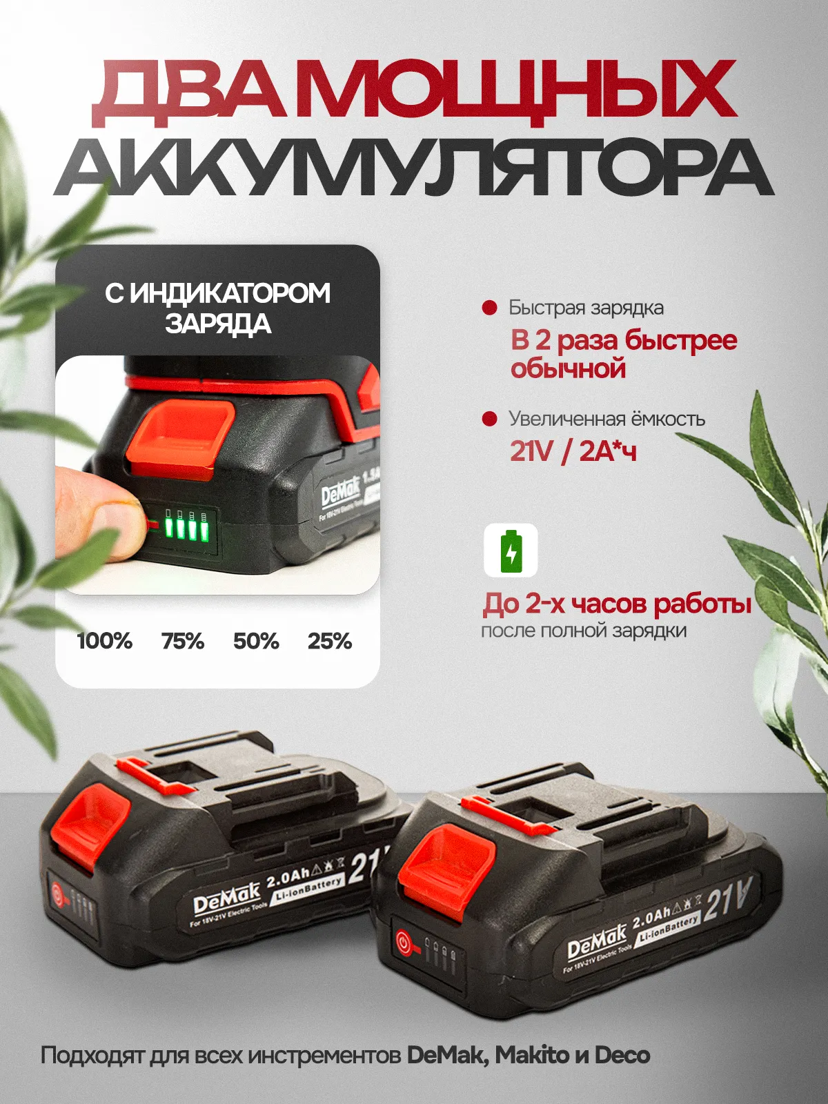 - 2. 2 аккумулятора 21В / 1,5 А*ч
