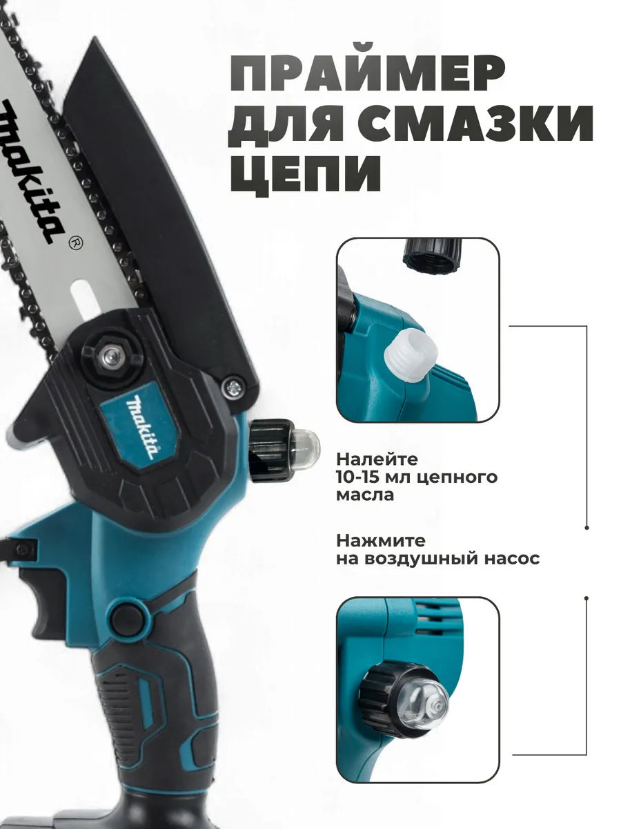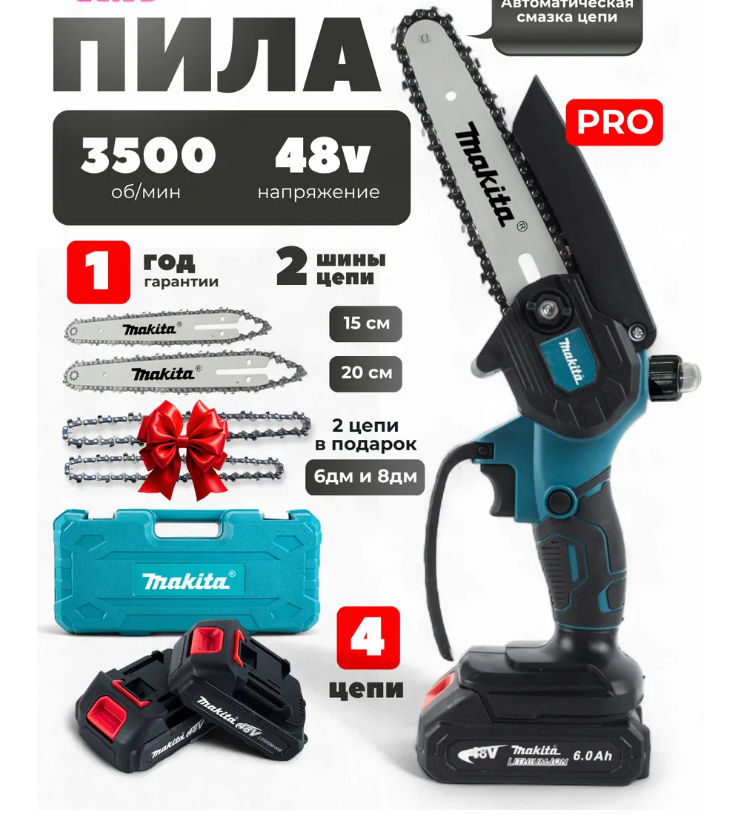 Пила поставляется в комплекте с двумя аккумуляторами, зарядным устройством, пилой цепной, кейсом, ключом и отверткой. Габариты устройства составляют 19 см в ширину, 32 см в длину и 8 см в высоту. Вес с упаковкой – 0,9 кг, без упаковки – 0,8 кг.
