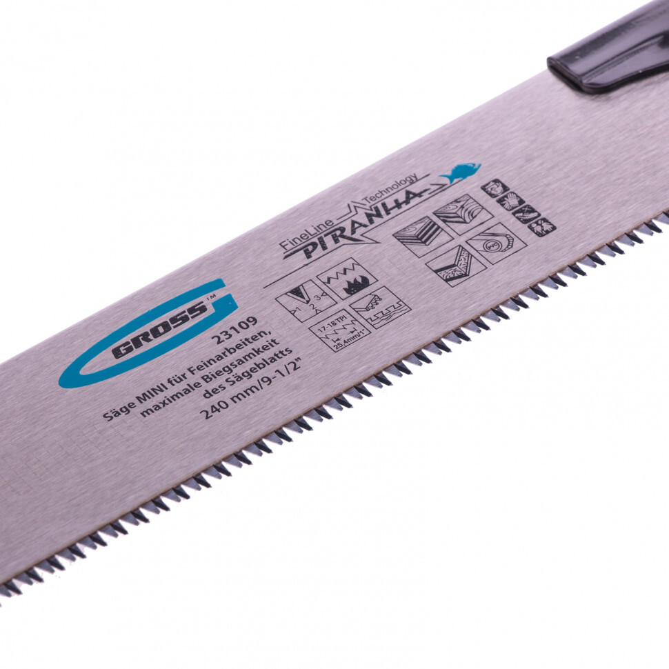 Пила Gross PIRANHA МИНИ 23109 со сменным полотном длиной 240 мм, с калеными зубьями 3D с шагом 17-18 TPI, используется для тонких работ по древесине, фанере, ДВП, ПВХ. Рабочая кромка с мелкими зубьями с шагом 17-18 TPI выполняет ровный и гладкий рез. Зубья вырезаны и одновременно заточены алмазным кругом, что обеспечивает высокую производительность инструмента. Съемное полотно при необходимости можно заменить. Инструмент применяется для проведения точных столярных работ дома или в мастерской.
