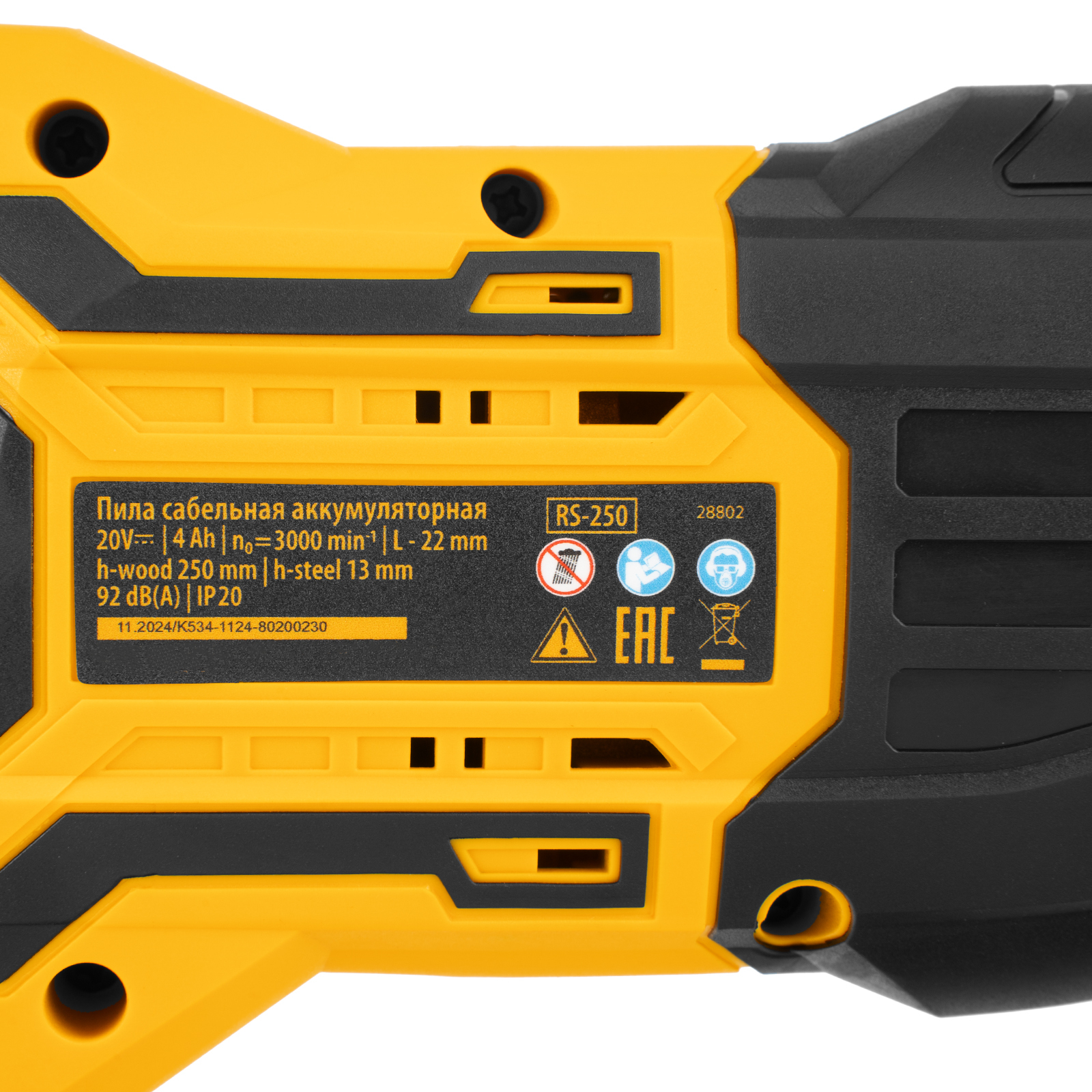 Аккумуляторная сабельная пила Denzel RS-250 28802 предназначена для распиливания заготовок из древесины, металла и других материалов. Максимальная глубина пропила в древесине составляет 250 мм, в стали — 16 мм. Бесщеточный двигатель обеспечивает длительную эффективную работу и не требует обслуживания. Работает от аккумулятора Li-Ion 20 В емкостью 4 А·ч. Отсутствие эффекта памяти позволяет подзаряжать аккумулятор без риска потери емкости, что обеспечивает длительную и эффективную работу инструмента. Пила оптимальна для бытового применения.