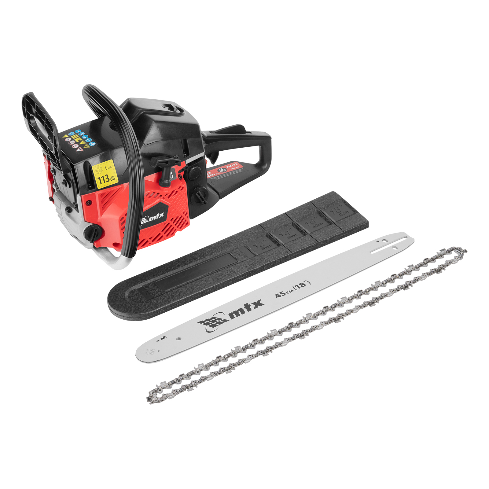 Цепная бензиновая пила MTX MS-5218 95212 оснащена двигателем объемом 52 см3 и мощностью 3 л.с. Предназначена для распиловки древесины, используется для валки деревьев, а также для распиливания веток, опиливания сучков и заготовки дров. Комплектуется шиной длиной 45 см, с шагом цепи 0,325″ и 72 звеньями, с пазом 1,5 мм. Будет полезна для проведения ремонтных, строительных работ, облагораживания сада и т.д.