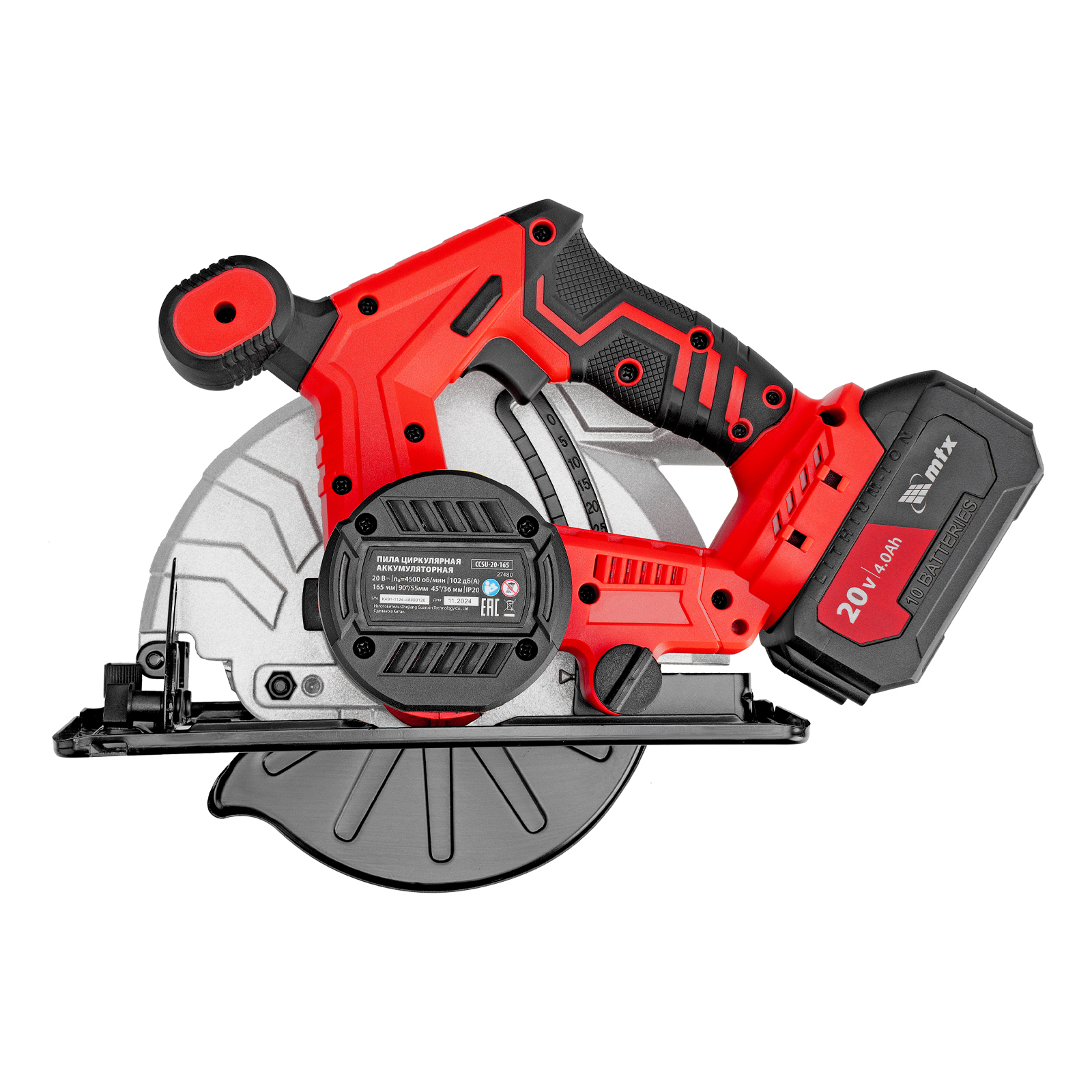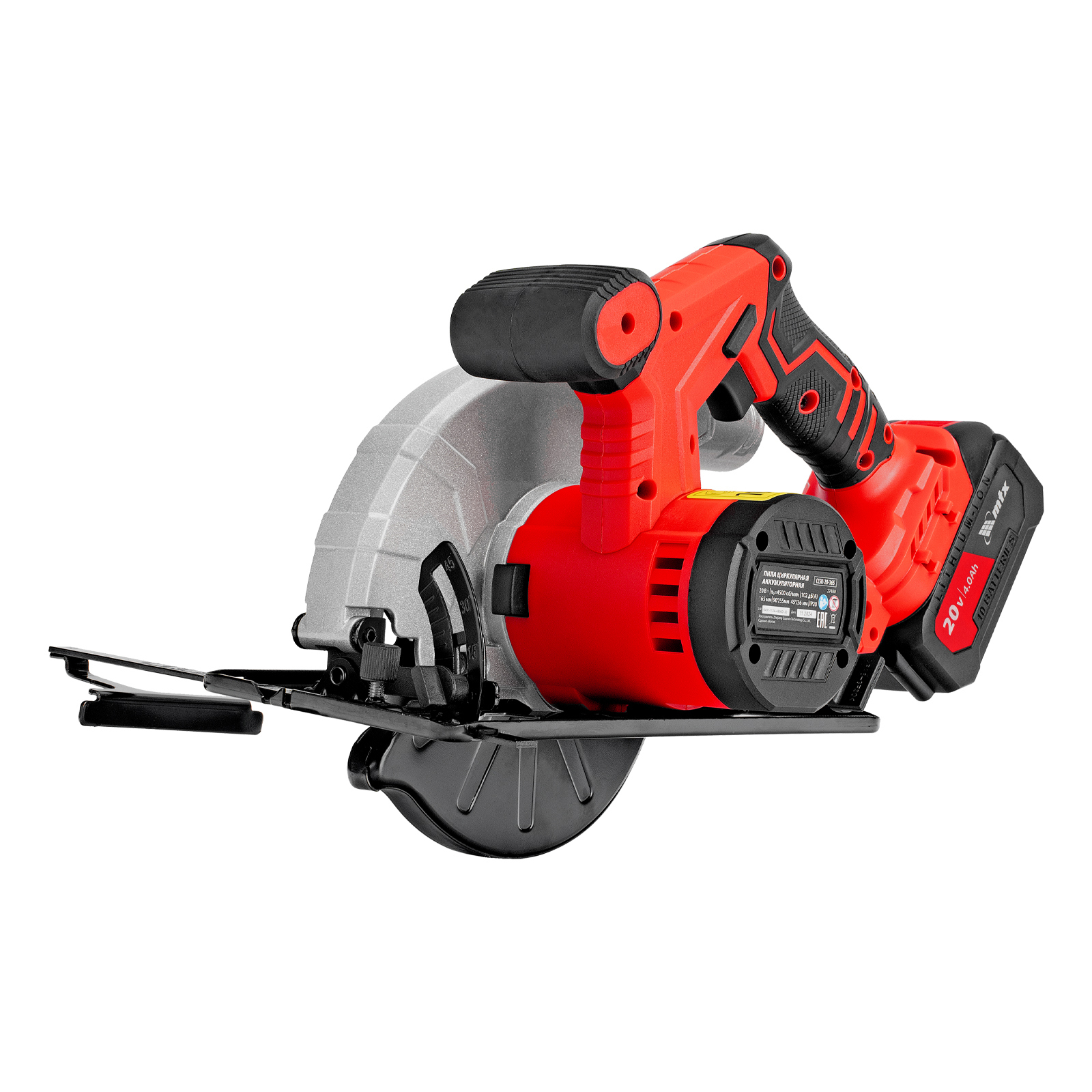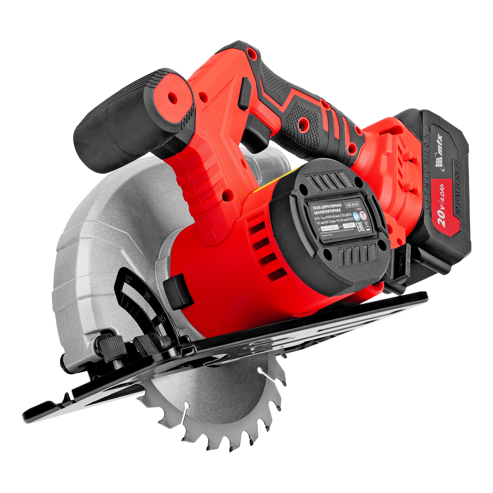 Аккумуляторная циркулярная пила MTX CCSU-20-165 27480 работает от аккумулятора Li-Ion 20 В и совместима с пильными дисками диаметром 165 мм. Предназначена для выполнения продольных и поперечных резов в древесине. При использовании специальной оснастки возможен распил заготовок из алюминия. Двигатель поддерживает частоту вращения шпинделя 4500 об/мин, что обеспечивает высокую производительность. Глубина пропила регулируется в зависимости от толщины обрабатываемой детали и достигает 55 мм под углом 90° и 36 мм под углом 45°. Аккумулятор Li-Ion емкостью 4 А·ч обеспечивает стабильную работу в течение длительного времени.