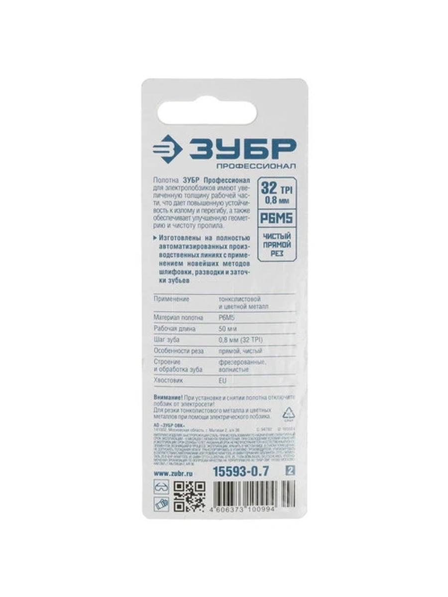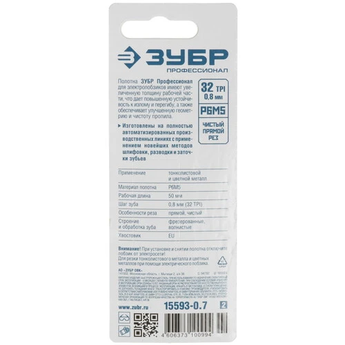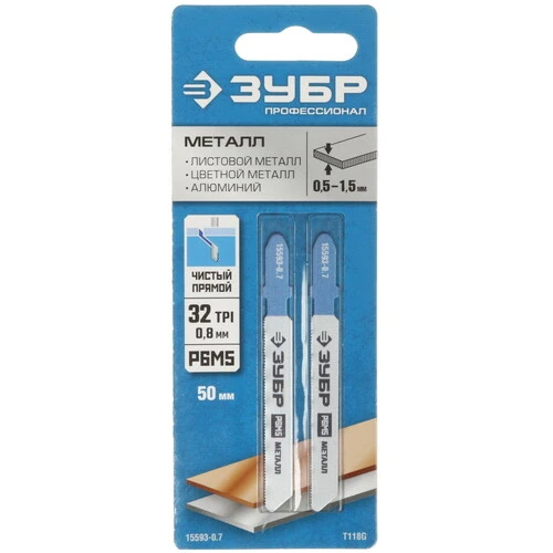 ЗУБР 15593-0.7_z02 совместимы с различными моделями электрических лобзиков. Расстояние между вершинами зубьев составляет 0.8 мм, что указывает на возможность получения чистого реза. Толщина пропила может достигать 1.5 мм.