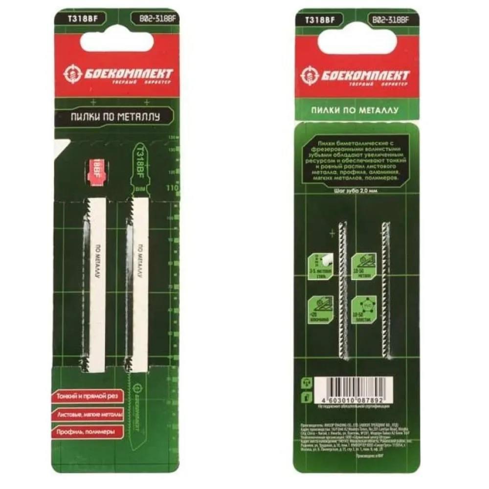 Пилки для лобзика БОЕКОМПЛЕКТ B02-318BF изготовлены из стали SK5. Это японская инструментальная сталь с добавлением хрома - отлично держит заточку. Пилки проходят обработку травления и фосфотирования, это придает пилке дополнительную прочность и позволяет работать долго. После термической и химической обработки пилки окрашиваются, защищая тело пилки от коррозии. Универсальный Т-образный хвостовик позволяется использовать их в большинстве современных лобзиков.