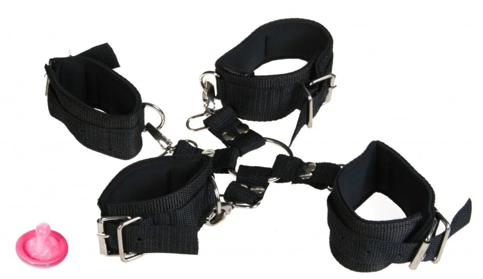 Комплект бондажа состоит из наручников и оков на ноги, соединённых между собой металлическим кольцом. Можно пристёгивать и отстёгивать оковы при помощи железных карабинов. Размер наручников и оков регулируется. Мягкая внутренняя поверхность не поранит руки и ноги. В комплект входит чёрная маска для глаз.