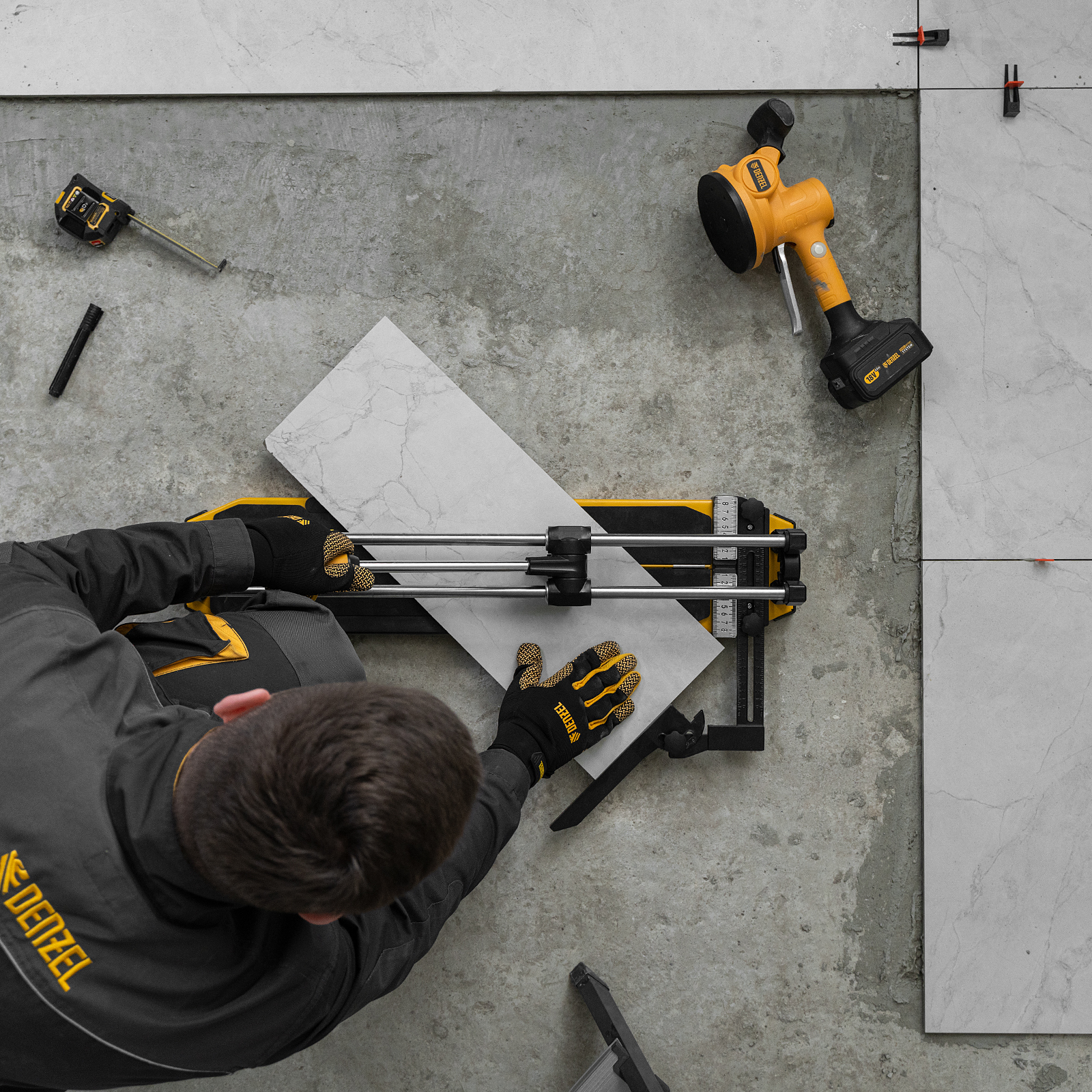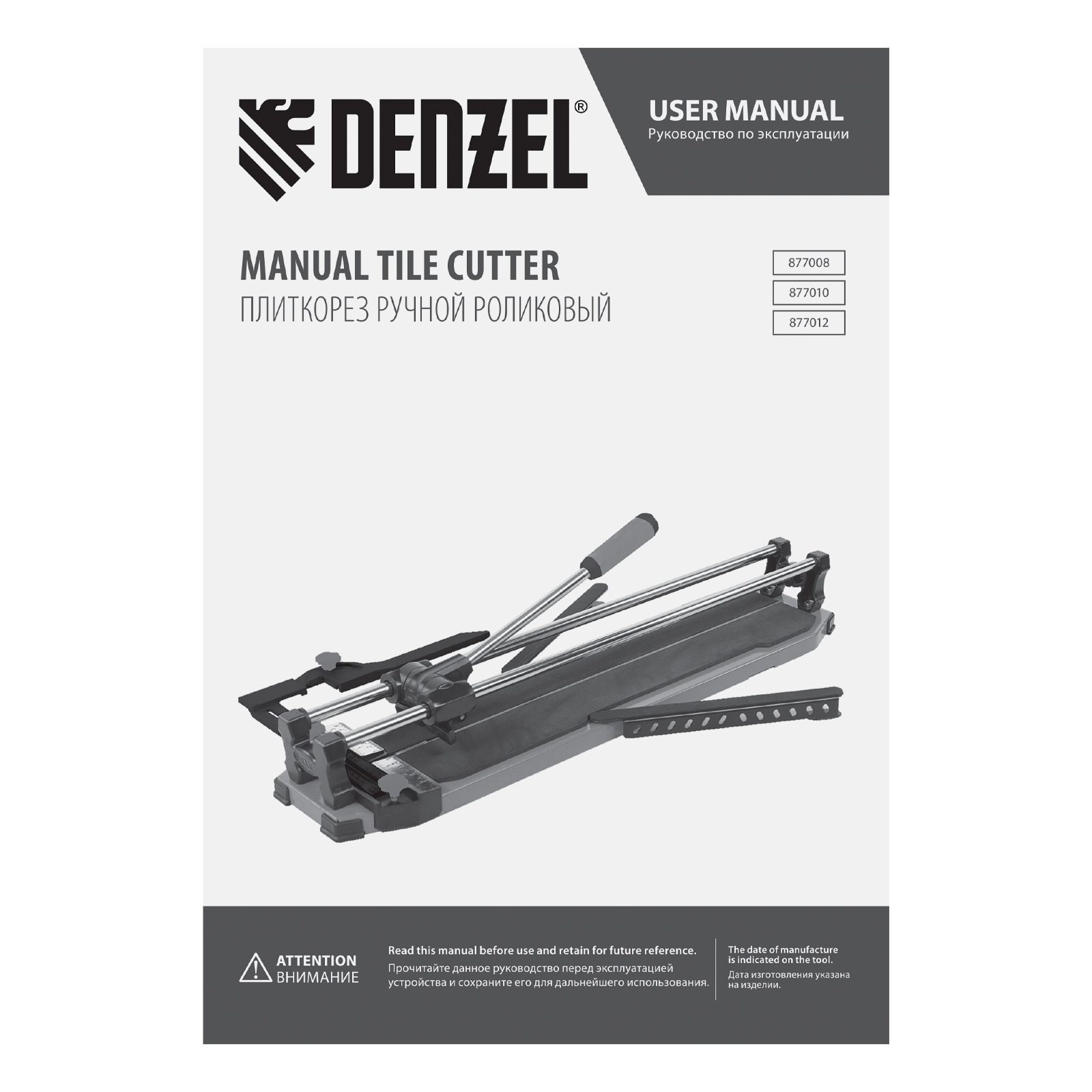 Ручной плиткорез Denzel 877008 с цельнометаллическими направляющими и стальной станиной, с кареткой на подшипниках и рукояткой-пеналом, предназначен для прямой и диагональной резки керамической плитки и керамогранита длиной до 600 мм и толщиной до 14 мм. Раздвижные упоры упрощают работу с плиткой большого размера. Инструмент используется для проведения отделочных работ.
