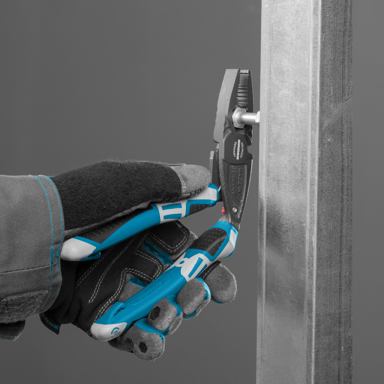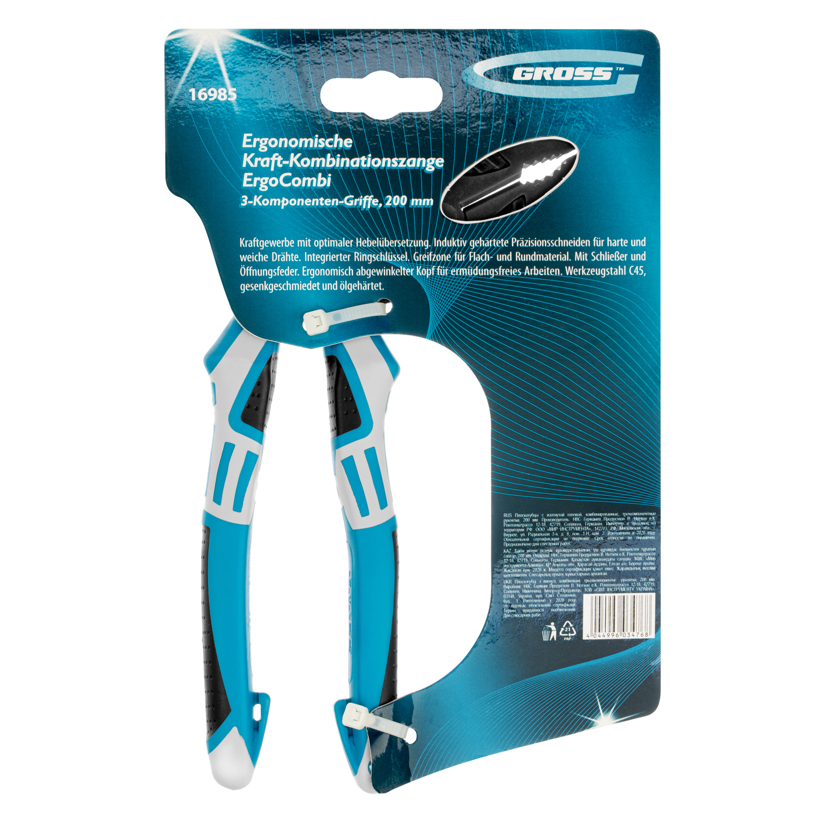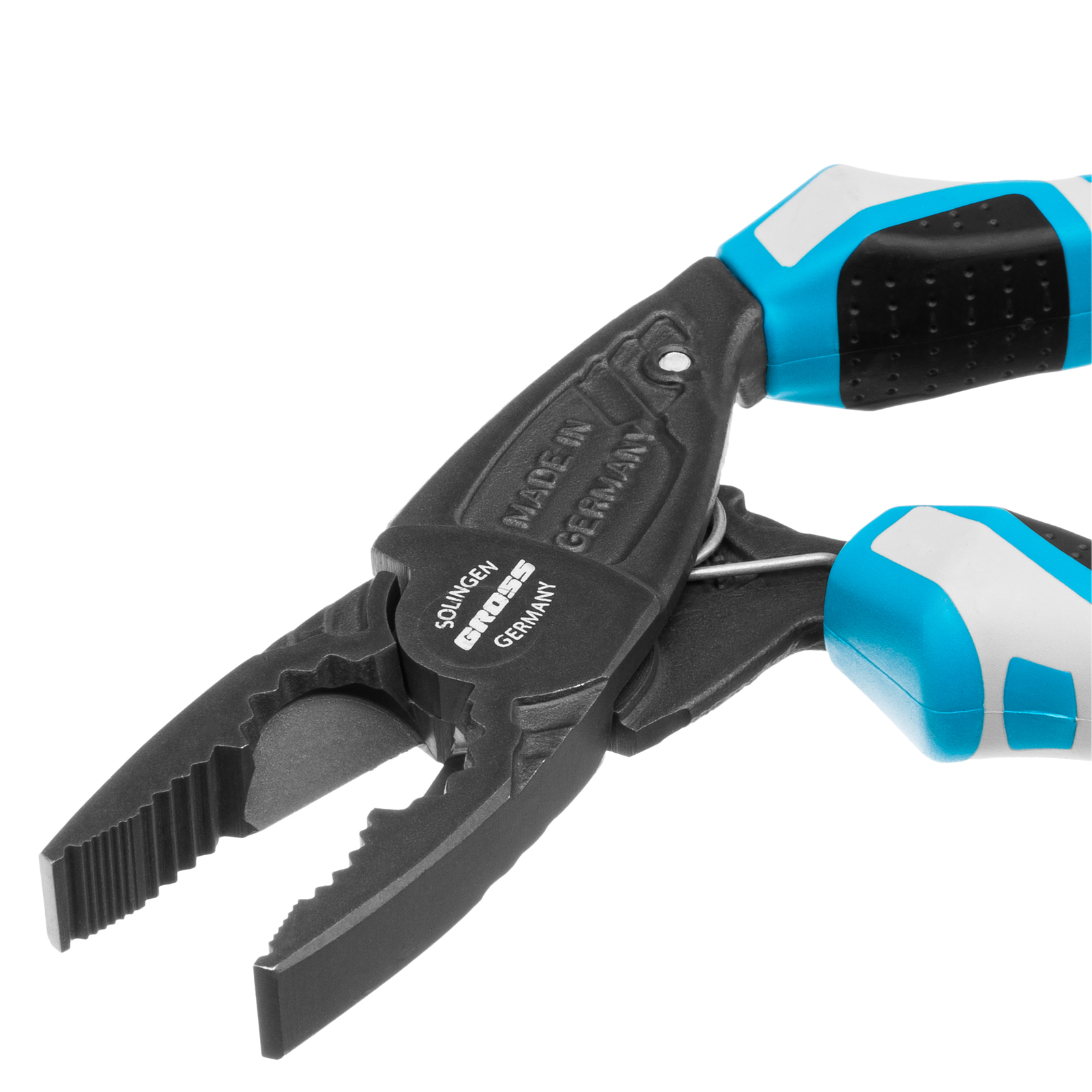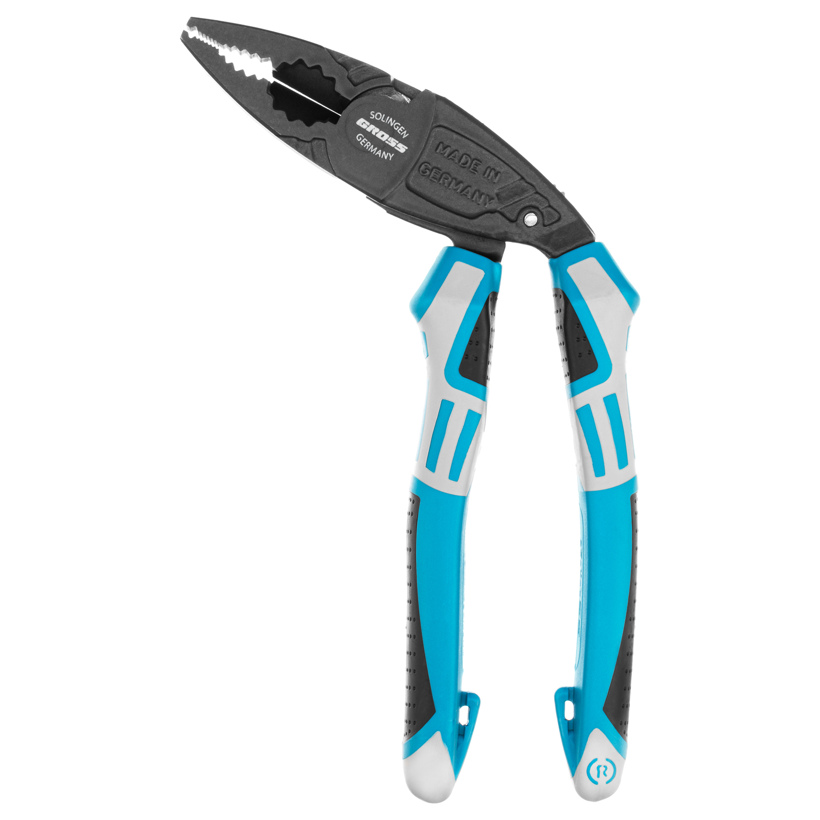 Комбинированные плоскогубцы с изогнутой головой Gross 16985 длиной 200 мм оснащены удобными трехкомпонентными рукоятками. Инструмент помогает захватывать крупные и мелкие детали или сгибать металлические листы, а благодаря специальным граням на рабочей части его можно использовать в качестве гаечного ключа. Специальные пазы на губках позволяют удерживать гвозди или проволоку во время работы. Рукоятки обладают диэлектрическими свойствами, однако техника безопасности запрещает работать под напряжением!