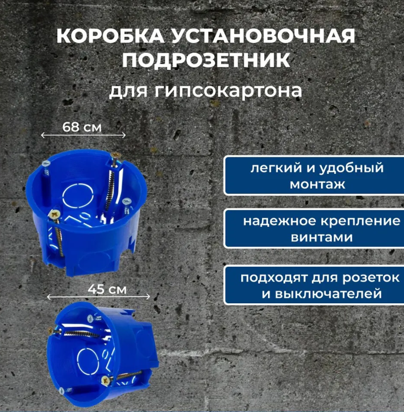 Коробка установочная (подрозетник) для полых стен диаметром 68x45 мм предназначена для монтажа электрических розеток, выключателей, диммеров и других электроустановочных изделий в полые стены и стены из ГКЛ. Самая важная функция установочной коробки заключается в защите соединений жил кабелей от внешних воздействий: от пыли, влаги и механических повреждений.
