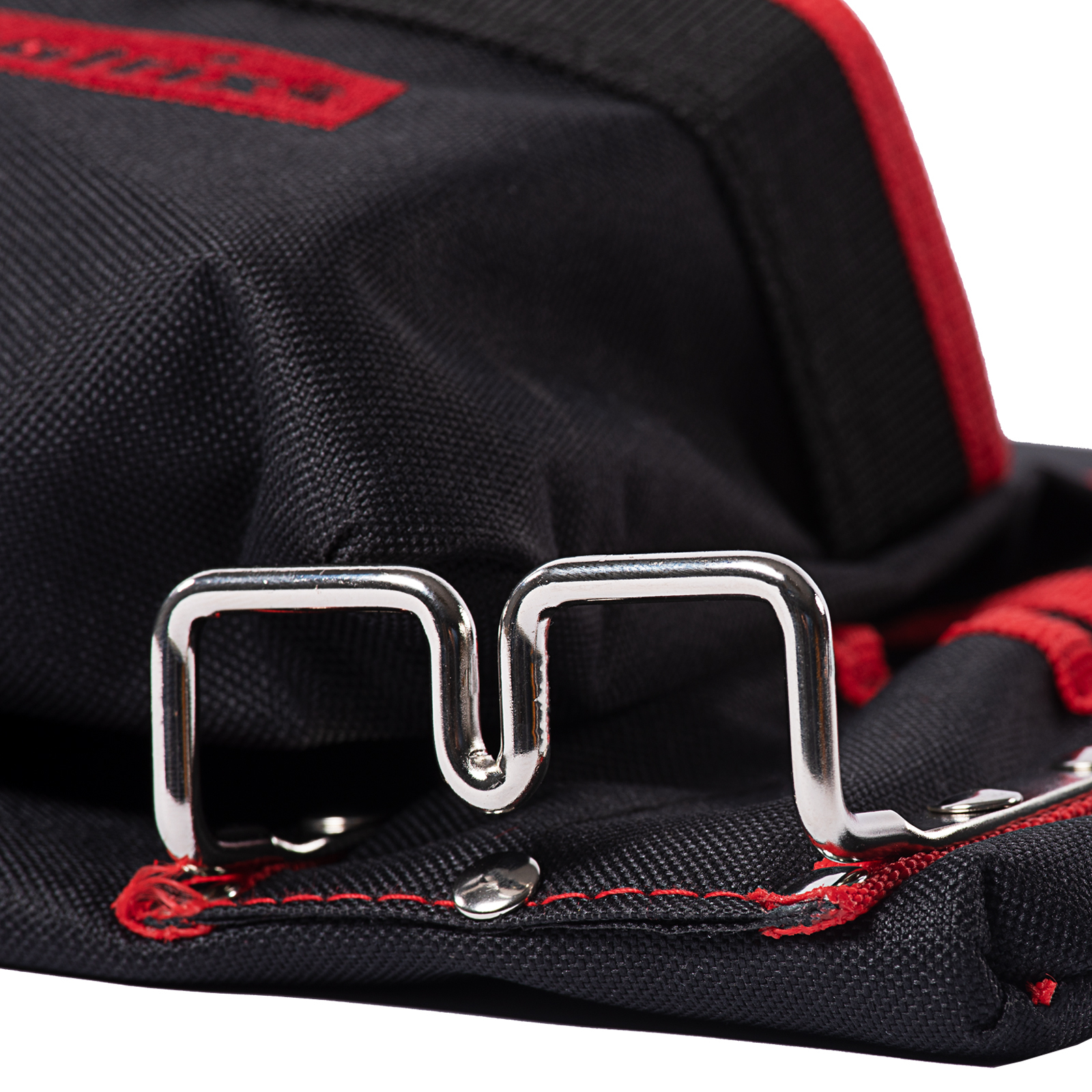 - Быстрый доступ к молотку и клещам — металлические держатели для них закреплены снаружи подсумка.
