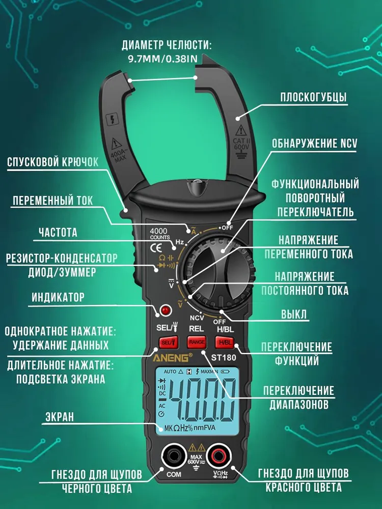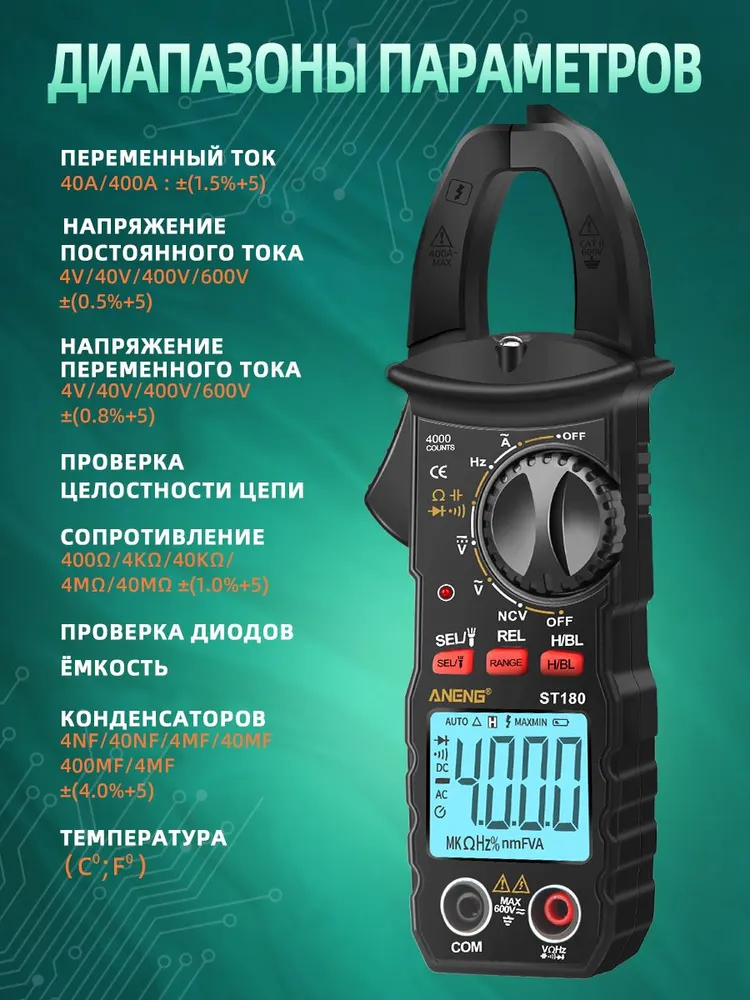 Клемметр может измерять только переменный ток (не постоянный ток), переменное и постоянное напряжение, сопротивление, емкость, непрерывность, диод и частоту (Гц), живой/нулевой провод; цифровой клемметр является идеальным инструментом для устранения неисправностей амперметра, вы можете точно устранить неисправности автомобиля или внутренние электрические проблемы в доли времени и получить работу, выполненную более эффективно.