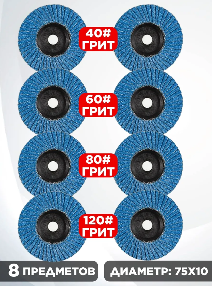 набор лепестковых шлифовальных кругов для мини болгарки и мини УШМ. диаметром 75 мм и посадочным диаметром 10мм из 8 предметов разной зернистости: 40грит, 60грит, 80грит, 120грит. Также вы можете найти: Отрезны диски для мини ушм, набор кругов для миниболгарки, круг диск по дереву по металлу по пластику для мини ушм, круг 76, 75, диск 76мм для мини ушм.