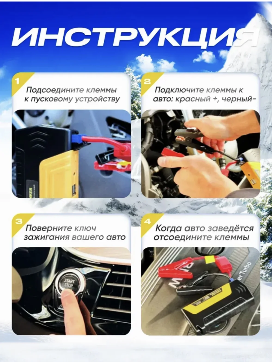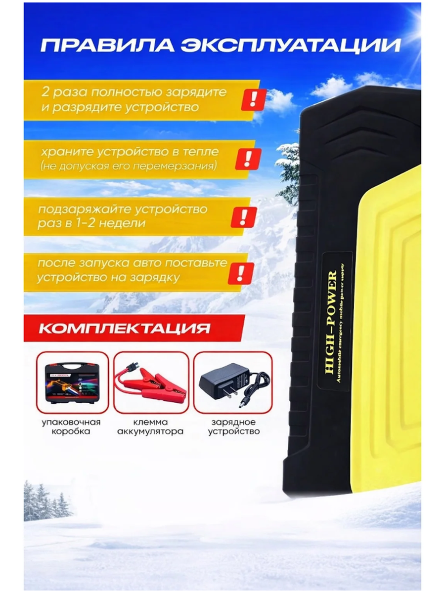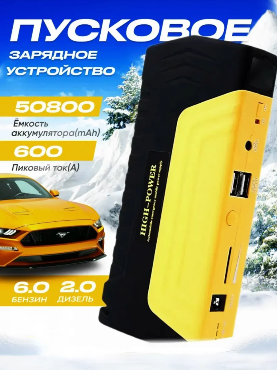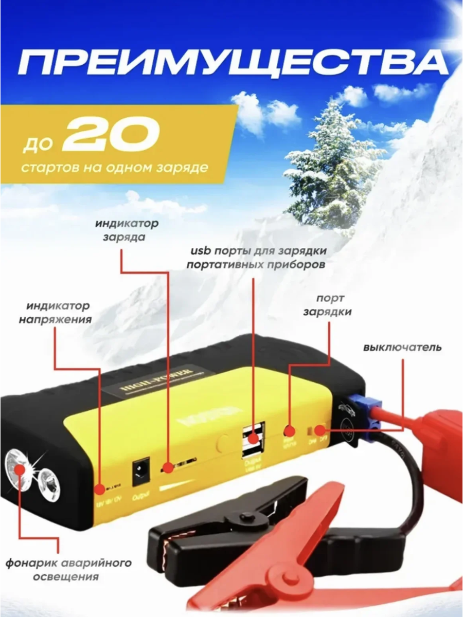 Пусковое зарядное устройство ёмкостью станет незаменимым помощником для автолюбителей, рыбаков и любителей активного образа жизни. Этот мощный автомобильный бустер предназначен для запуска автомобилей и является также универсальным для зарядки устройств. Функция автозапуска автомобиля пригодится в случаях, когда аккумулятор разрядился, например, из-за сработавшей сигнализации. Бустер можно использовать для бензиновых и дизельных двигателей объемом до 5,5 литра, а также для снегоходов и квадроциклов. С помощью этого пускового зарядного устройства можно также зарядить эхолот, подводную камеру, использовать электрогорелку и поддерживать термос с подогревом. Порт USB позволяет заряжать смартфоны, планшеты, ноутбуки и другие гаджеты. Функция автостарта также включает в себя LED-фонарь с тремя режимами освещения: яркий свет, мигание и сигнал SOS. Джамп стартер оснащен индикатором уровня заряда, напряжения и температуры, чтобы обеспечить информированность пользователя о состоянии устройства. Кроме того, портативное зарядное устройство для автомобиля оснащено стропорезом, стеклобоем и мини-компасом. Для зарядки данного устройства достаточно 40-60 минут от сети 220 Вольт.