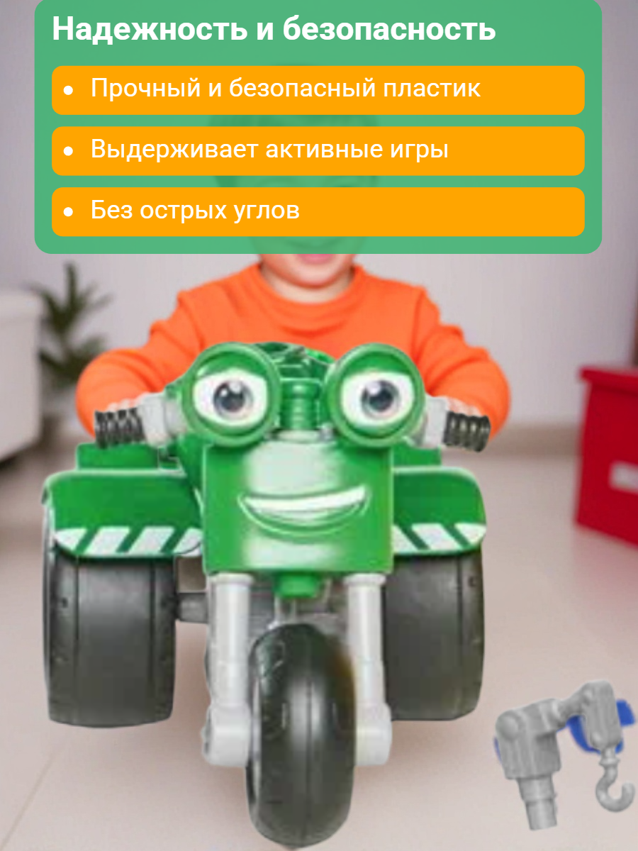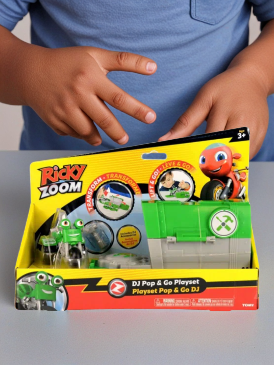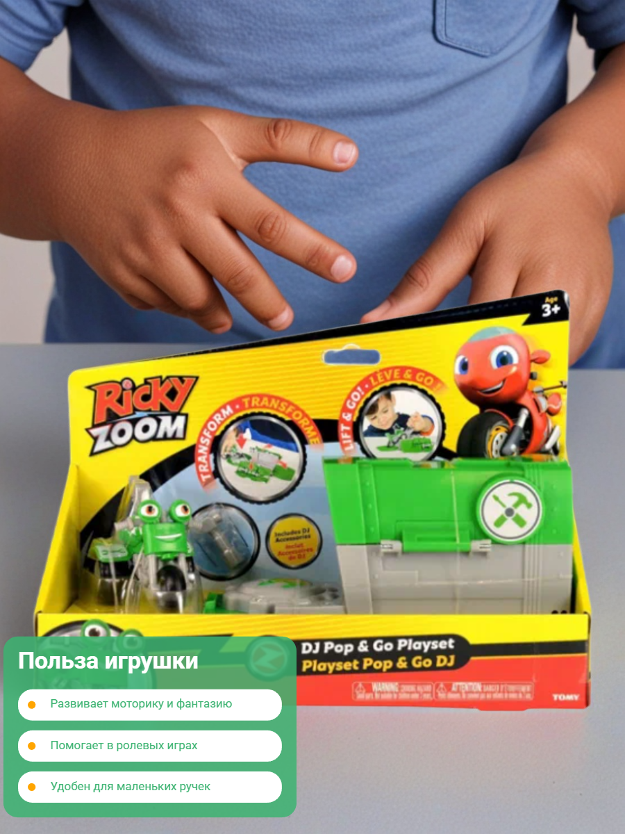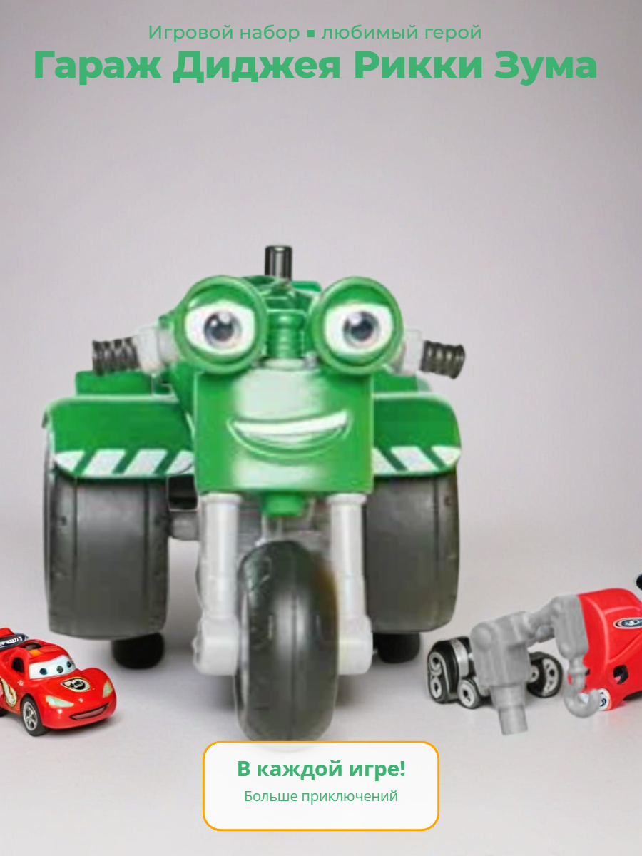 Диджей - трёхколёсный мотоцикл с нестандартной конструкцией. Со специальным гаражом, в котором есть горка для ускорения, он станет значительно быстрее. Нажми на кнопку активации, и гараж откроется. Собери коллекцию главных героев мультфильма "Рикки Зум" и устраивай супергонки! В игровом наборе "Гараж Диджея" ТМ "Рикки Зум" 4 предмета: фигурка мотоцикла Диджея (8 см) зеленого цвета с подвижными колёсами и поворотным передним колесом, открывающийся гараж с горкой, 2 эксклюзивных аксессуара. Размер гаража в закрытом виде: 12 x 8 x 7,5 см. Размер гаража в открытом виде: 17,5 x 8 x 7,5. Набор совместим с другими фигурками данной коллекции. Материал: пластик. Товар сертифицирован. Упаковка: открытая коробка (19 x 14 x 16,5 см).