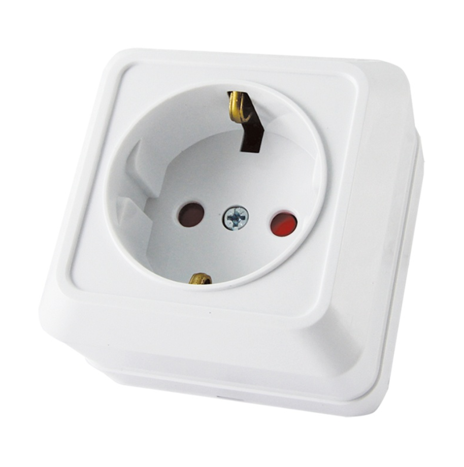Розетка одноместная с заземляющим контактом и шторками открытой установки, цвет белый. Корпус из самозатухающего ABS-пластика, обеспечивающего прочность и устойчивость к воздействию солнечных лучей. Контакты розетки выполнены из высокоупругой фосфористой бронзы, обеспечивающей надежный контакт и пожаробезопасность на протяжении всего срока службы изделий.