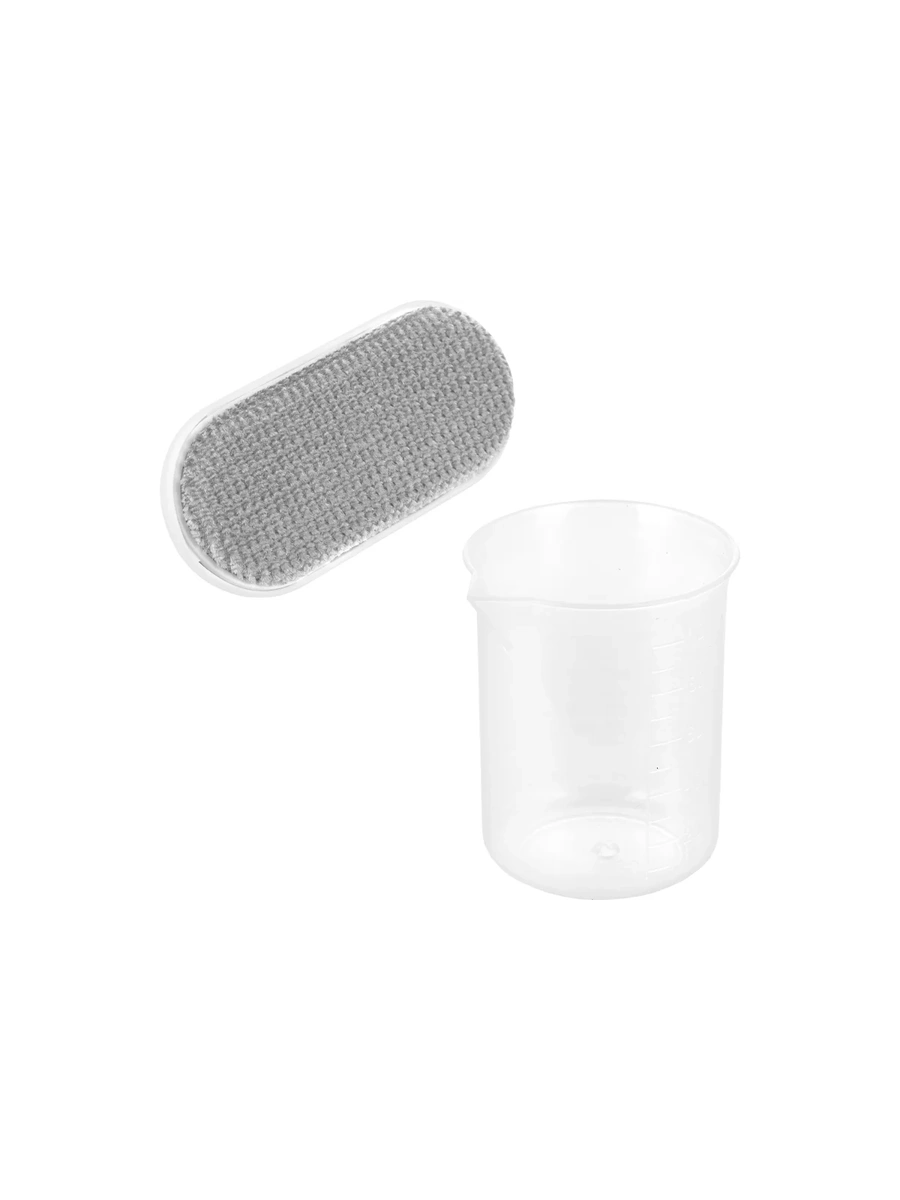 В комплекте к отпаривателю поставляются мерный стакан для удобного добавления воды в резервуар и ворсовая насадка, которая позволяет почистить вещь от пыли, волос или шерсти при отпаривании.
